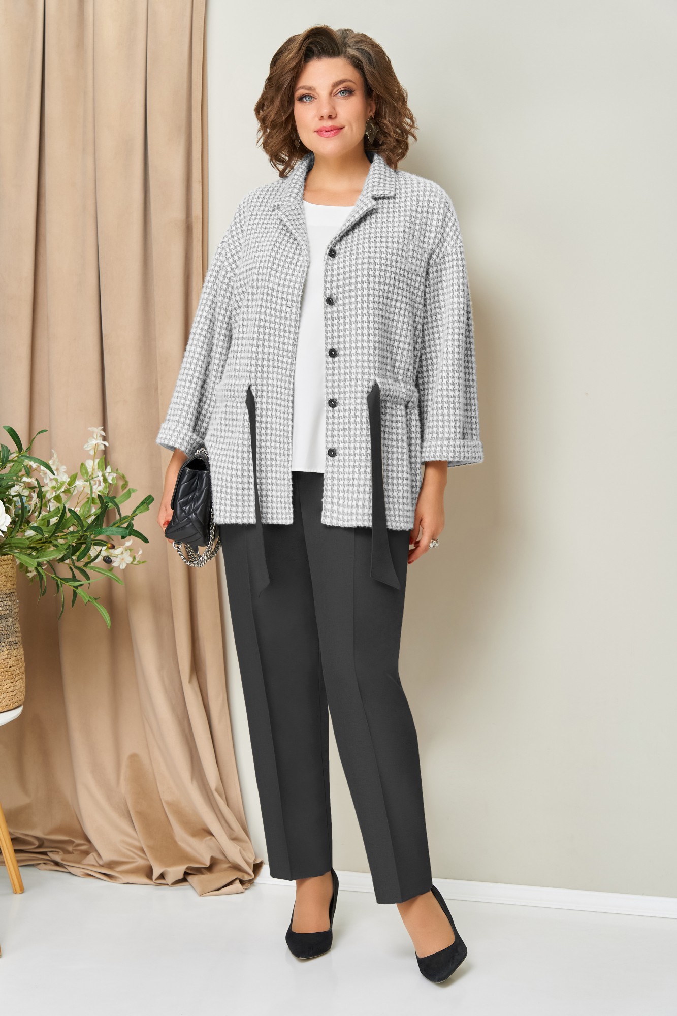 Жакет с застежкой на пуговицы, с пришивной кулисой и поясом, прямые классические брюки и блуза- универсальный комплект для различных вариантов носки. Элегантный рукав с отложной манжетой на цельнокроеной основе. Брюки прямые с высокой посадкой, с притачным поясом на резинке. Блуза из легкого текстиля с принтом, со спущенным коротким рукавом.