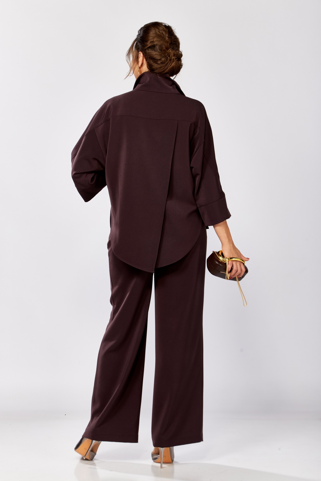 Костюм женский брючный из плотной костюмной ткани. Блуза прямого силуэта. По полочке горизонтальный подрез в области талии. Декор в виде цветка настрочен на правой стороне полочки. Спинка с цельнокроеной кокеткой. Нижняя часть на запах из деталей с фигурным низом. Рукав летучая мышь с широкой манжетой по низу. По боковым швам разрезы. Брюки прямого силуэта. Пояс притачной с резинкой в районе боковых швов. Застежка центральная на молнию с гульфиком. В боковых швах два кармана с округлым входом. По спинке две вытачки.