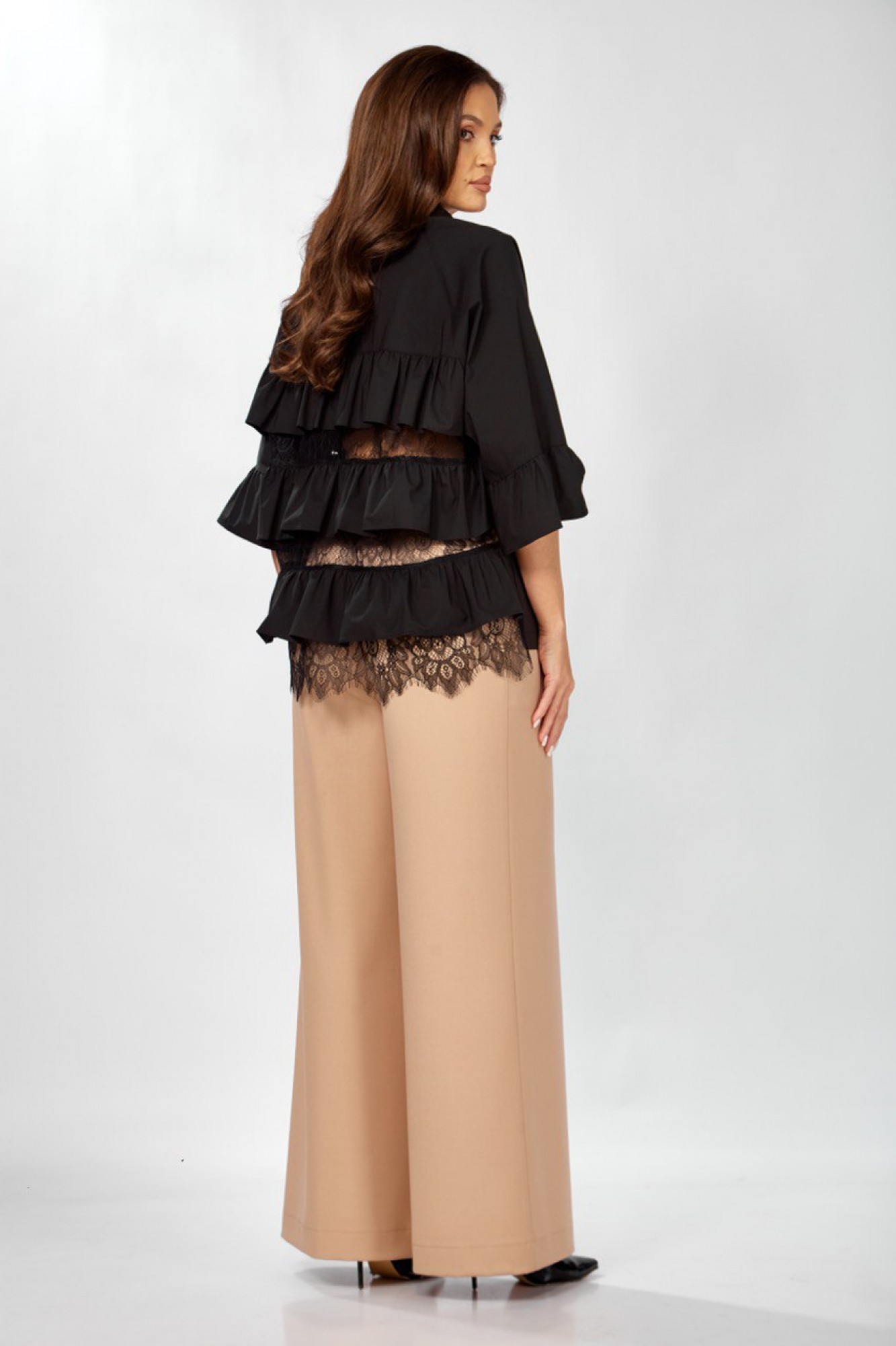 Элегантный, женский комплект сочетающий в себе утонченность и современный стиль. Блуза из легкой хлопковой ткани с многослойными рюшами и кружевными вставками по спинке и низу. Полупрозрачные элементы придают образу изысканность и воздушность. Рукав с воланом по низу, длиной 7/8. Брюки с высокой посадкой свободного кроя, выполненные из мягкой костюмной ткани. Пояс притачной с резинкой по спинке и центральной застежкой молнией спереди. Идеально подчеркивают силуэт и создают визуальный баланс с декоративным верхом. Цветовая гамма: черный верх + бежевый низ-универсальное сочетание для любого сезона. Модель подходит для вечерних выходов, романтичных встреч и стильных фотосессий. Ткань: хлопок, вискоза, кружево.