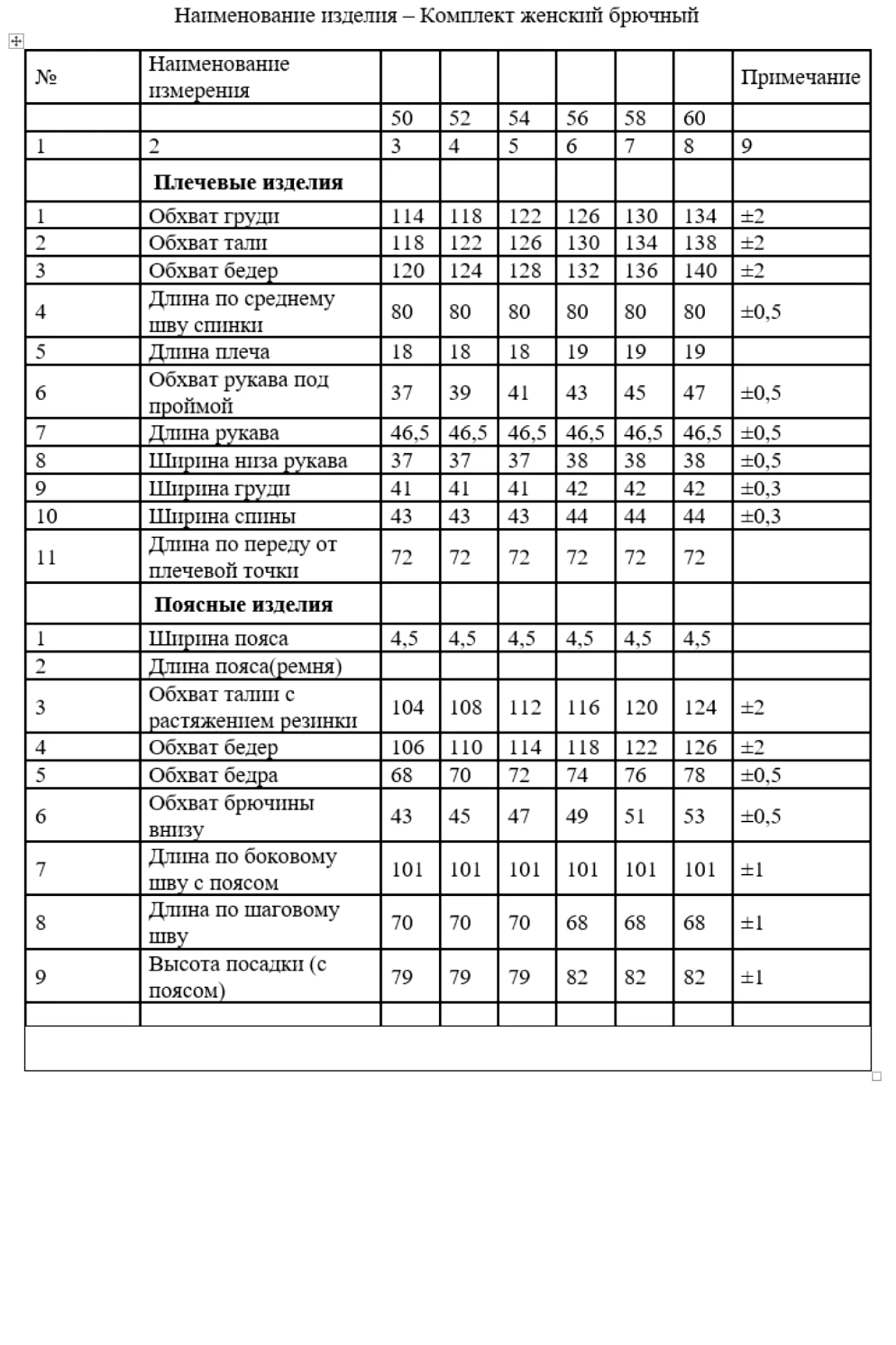 Таблица размеров