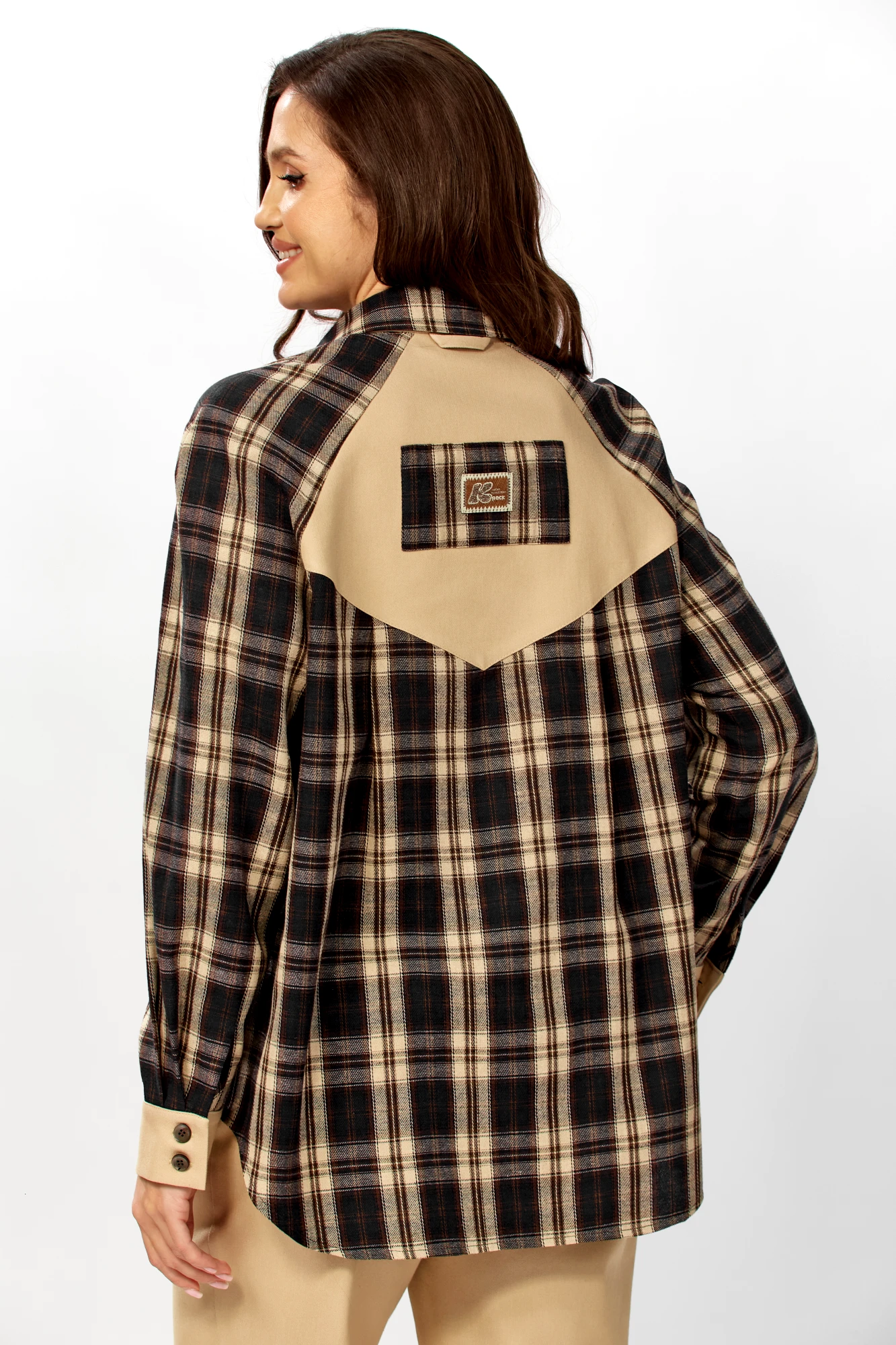 Модель выполнена в теплой сине-бежево-коричневой гамме из приятной, плотной хлопковой ткани. Это создает расслабленный силуэт и позволяет носить рубашку как самостоятельный верх или в качестве легкого верхнего слоя поверх топа или футболки.