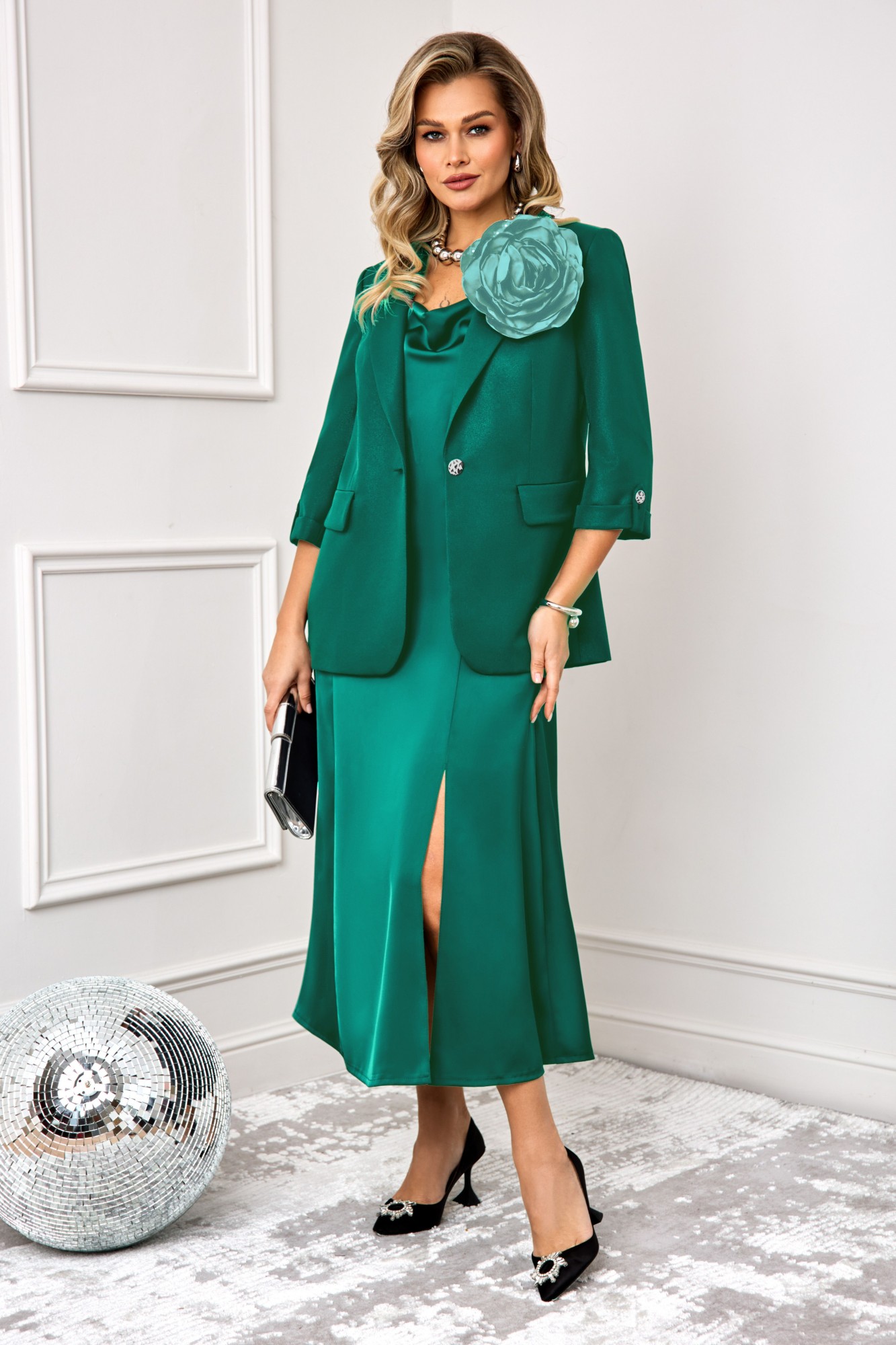 Элегантный и нарядный комплект, состоит из жакета и платья. Жакет прямого силуэта, выполнен из Ткани Барби с добавлением вискозы, полностью на подкладке. Жакета по переду с застежкой на пуговицу, функциональными карманами с клапанами. Рукав втачной, длиной ¾, с манжетой и патой с застежкой на пуговицу. Спинка жакета по низу со шлицей. Жакет декорирован съемным украшением в виде банта ручной работы. Платье А-силуэта, выполнено из атласной ткани с добавляем вискозы. Платье на бретелях, спереди с разрезом, что придает модели особый шарм. Модель удобная и практичная, отлично подойдет для ежедневной носки и торжественного мероприятия.