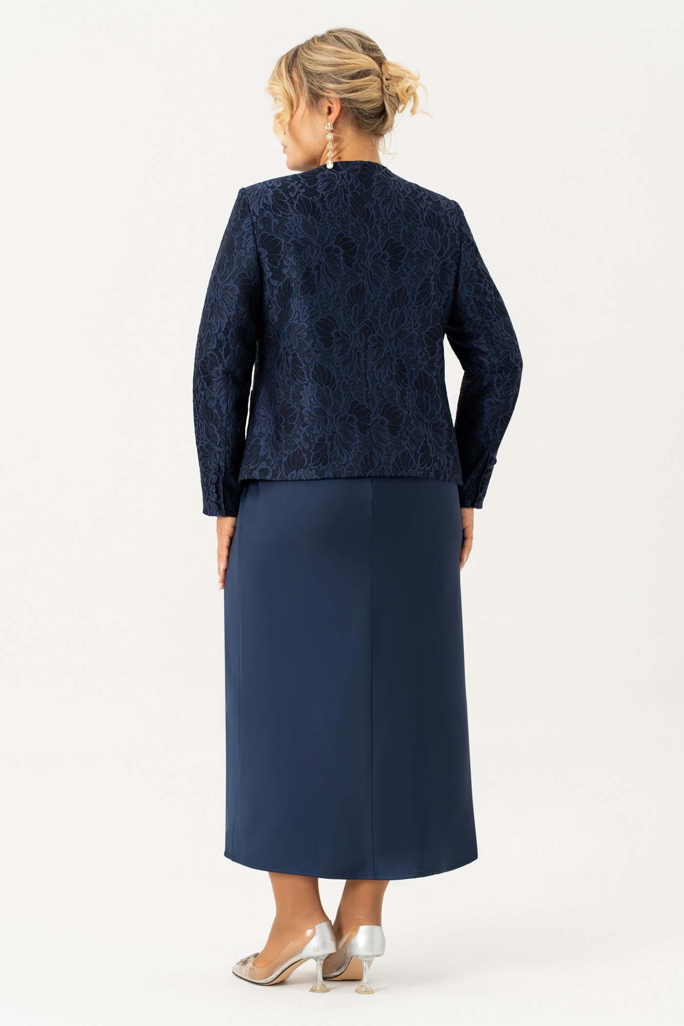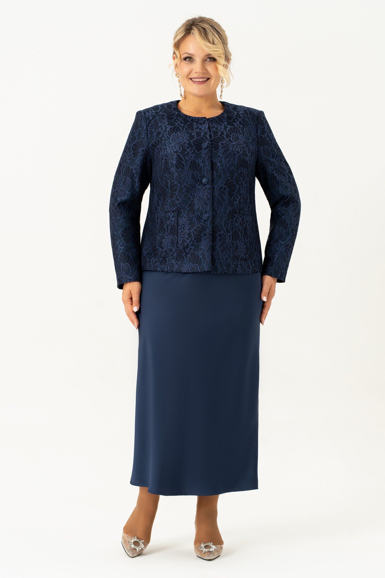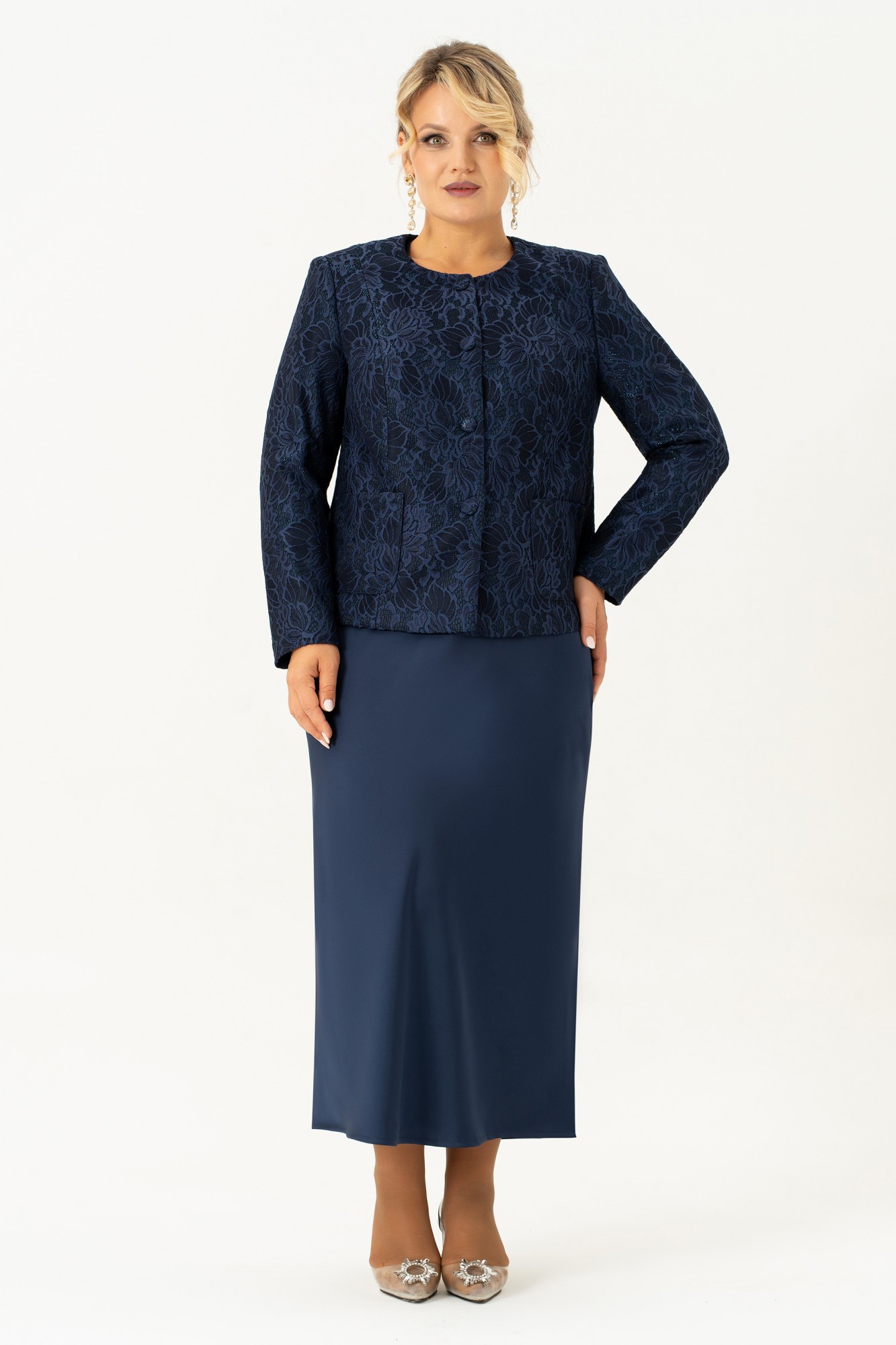 Красивый и стильный комплект в элегантном сочетании однотонного платья из атласа и жакета из кружевного жаккарда подойдет и для строгого образа, и для создания светлого, яркого и нежного лука с романтичными мотивами. Жакет короткий, полуприлегающего силуэта на подкладке. Спинка со средним швом. По переду жакета есть рельефные швы от плеча. Застёжка на петли и пуговицы. Рукав втачной , длинный, двухшовный. Горловина круглая, смотрится очень актуально и эффектно в сочетании с накладными карманами. Этот жакет подойдет и к брюкам и к платью, что позволяет создать много шикарных образов. Второй элемент комплекта — платье из струящегося атласа, кроенное по косой, что обеспечивает красивую посадку и мягкое облегание по фигуре. Углубленная горловина добавляет лёгкой чувственности, а нагрудные вытачки от проймы подчёркивают линию груди. Выбор этого стильного наряда станет замечательным дополнением вашего гардероба для особых случаев, обеспечивая вам стиль и комфорт.