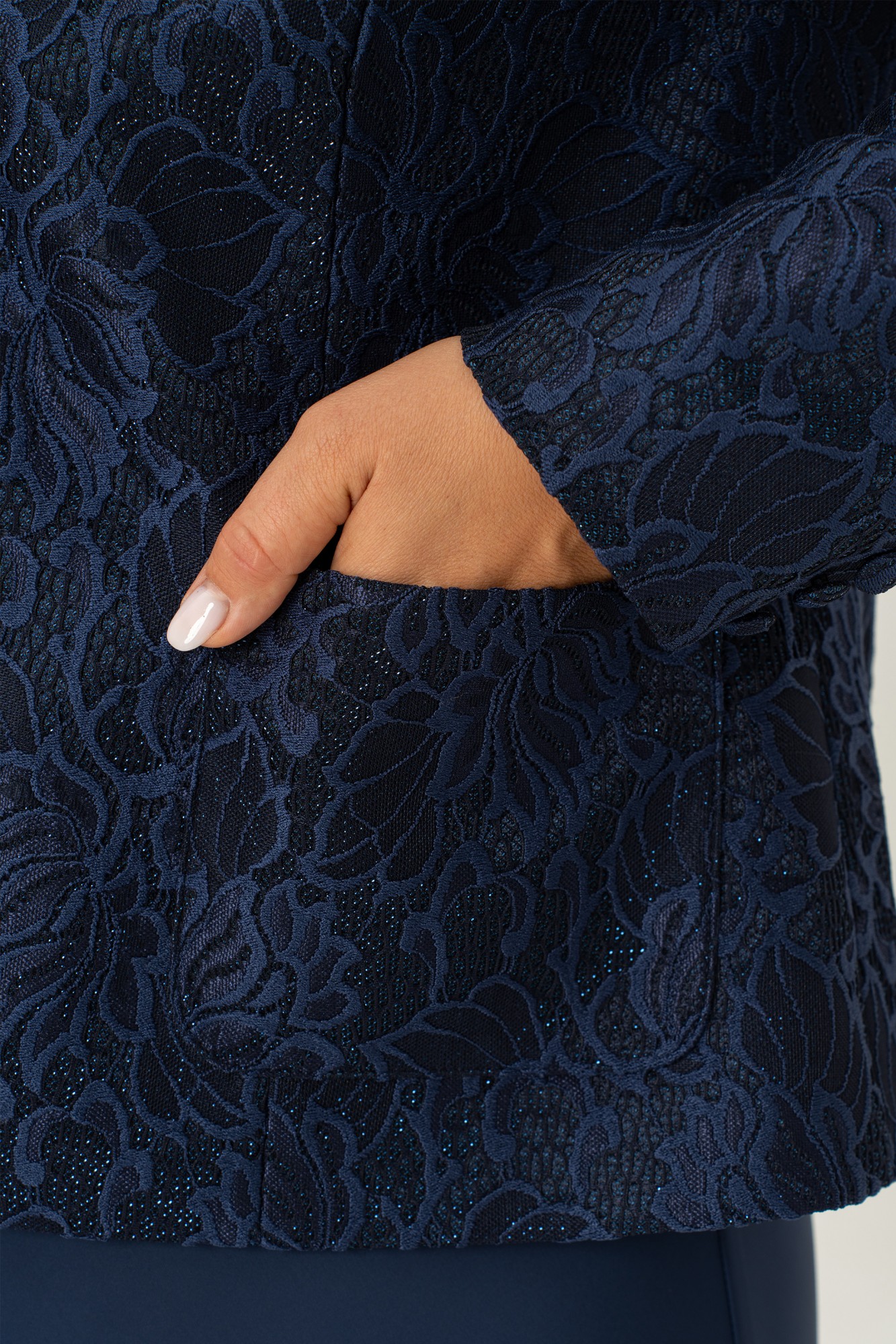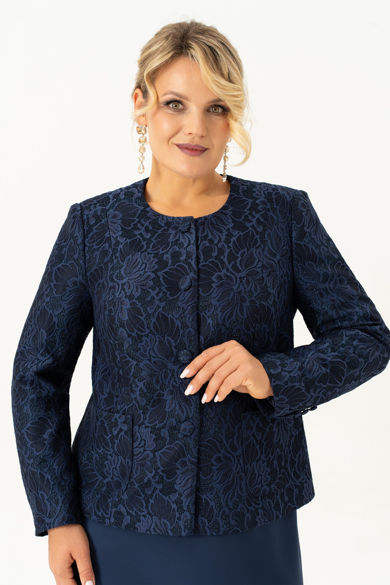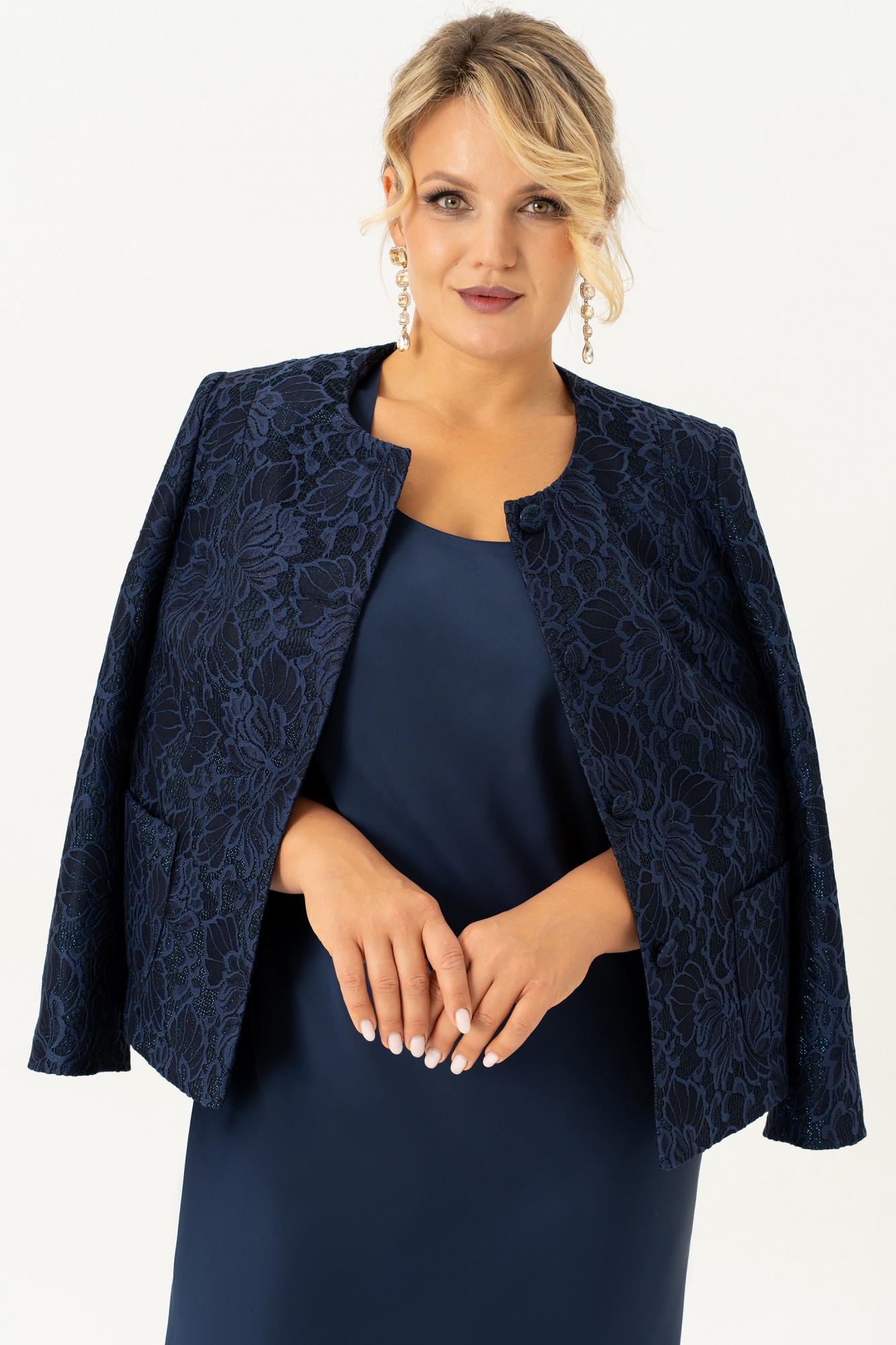 Красивый и стильный комплект в элегантном сочетании однотонного платья из атласа и жакета из кружевного жаккарда подойдет и для строгого образа, и для создания светлого, яркого и нежного лука с романтичными мотивами. Жакет короткий, полуприлегающего силуэта на подкладке. Спинка со средним швом. По переду жакета есть рельефные швы от плеча. Застёжка на петли и пуговицы. Рукав втачной , длинный, двухшовный. Горловина круглая, смотрится очень актуально и эффектно в сочетании с накладными карманами. Этот жакет подойдет и к брюкам и к платью, что позволяет создать много шикарных образов. Второй элемент комплекта — платье из струящегося атласа, кроенное по косой, что обеспечивает красивую посадку и мягкое облегание по фигуре. Углубленная горловина добавляет лёгкой чувственности, а нагрудные вытачки от проймы подчёркивают линию груди. Выбор этого стильного наряда станет замечательным дополнением вашего гардероба для особых случаев, обеспечивая вам стиль и комфорт.