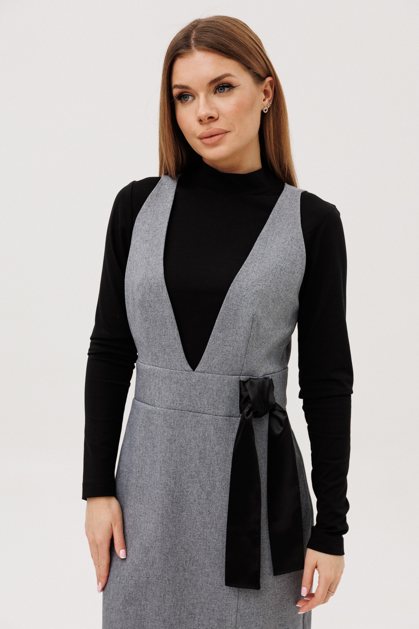 Костюм двухпредметный: Сарафан женский прилегающего силуэта с V-образным вырезом, вытачками на лифе. На притачном поясе декоративный элемент - бант из атласной черной ткани. По переду разрез. На спинке сарафана молния. Длина миди. Изделие на подкладке. Джемпер женский прилегающего силуэта с втачным одношовным рукавом с воротником-стойкой.