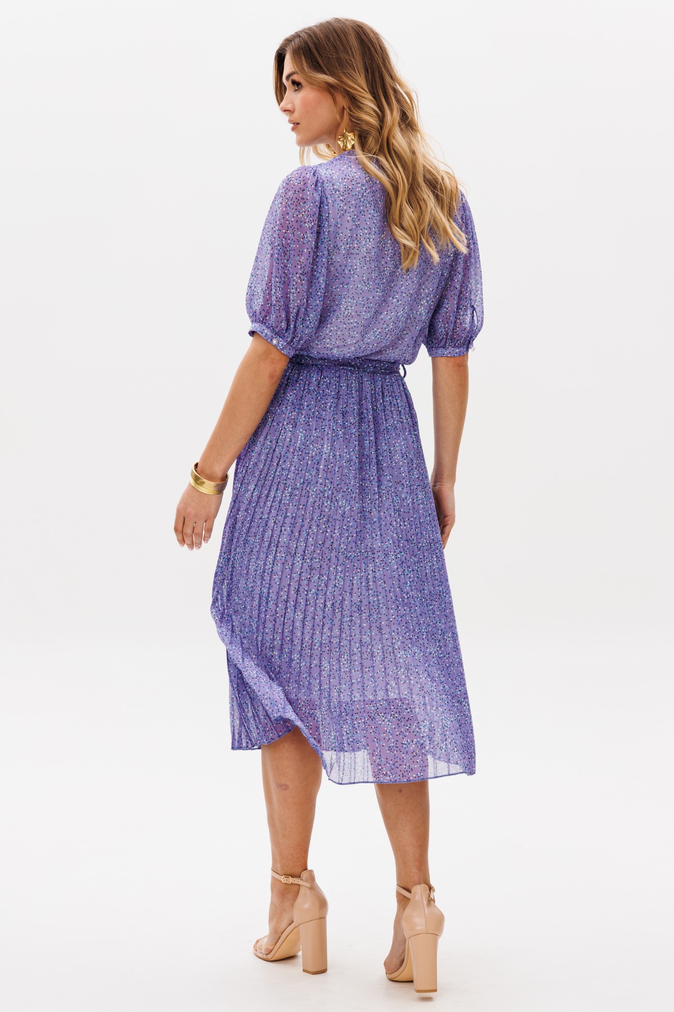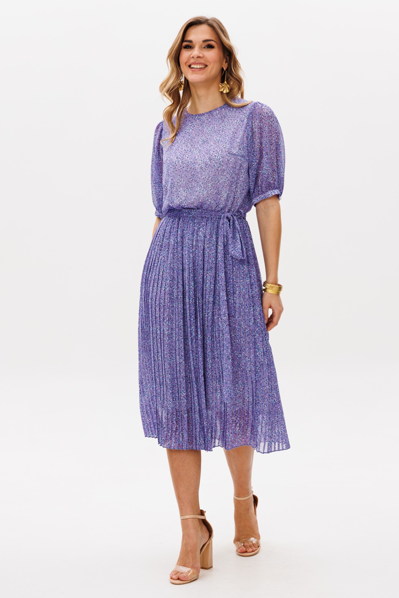 Комплект состоит из жакета и платья. Жакет полуприлегающего силуэта с однобортной застежкой на одну пуговицу и воротником пиджачного типа. Перед и спинка с рельефами из проймы. По спинке средний шов. Рукав втачной двухшовный. Жакет на подкладке. Платье прямого силуэта, отрезное по линии талии и приталенное с помощью резиночки, с юбкой плиссе. Перед с нагрудной вытачкой. В боковых швах шлевки. Горловина круглая, по спинке застежка капелька на одну петлю-пуговку. Рукав втачной со сборкой по окату и понизу с притачной манжетой с застежкой на одну петлю- пуговку. Платье на подкладке. Платье дополнено поясом из основной ткани.