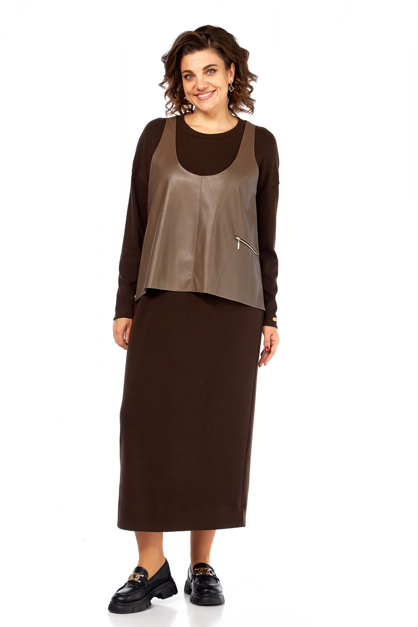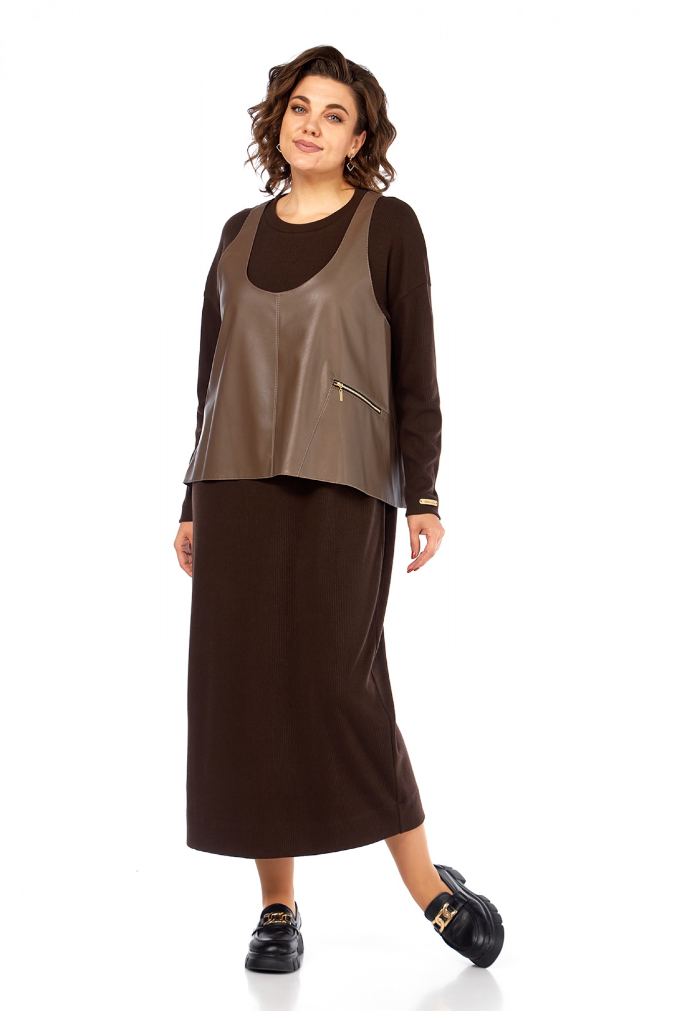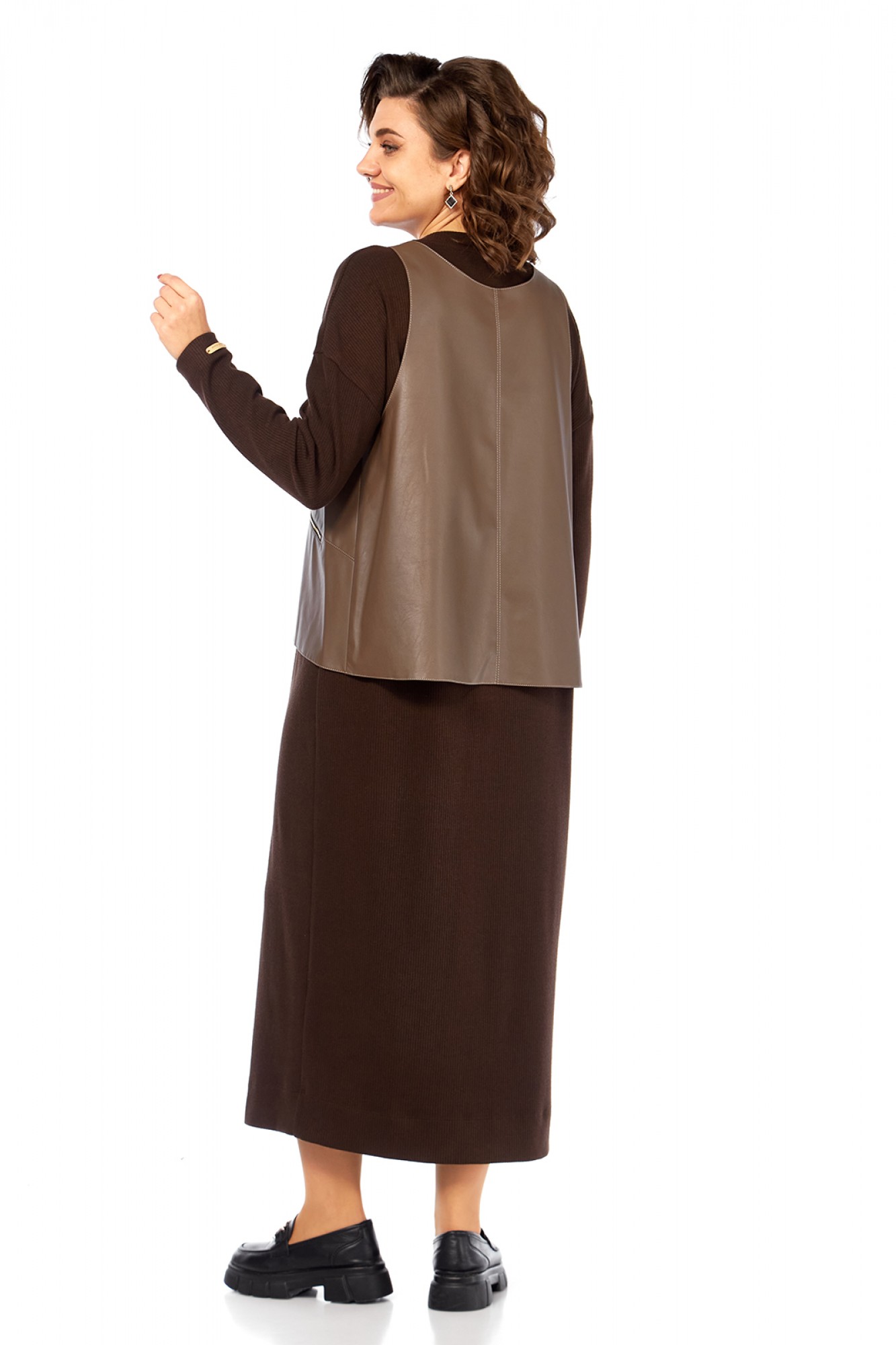 Комплект женский двухпредметный состоит из платья и жилетки. Платье свободного силуэта выполнено из трикотажного полотна ( лапша ). Перед и спинка цельнокроеные. Рукава спущенные. Жилетка выполнена из искусственной кожи на вискозной основе, А — силуэта. Перед со средним швом и асимметричным декоративным элементом. Спинка разрезная по центру.