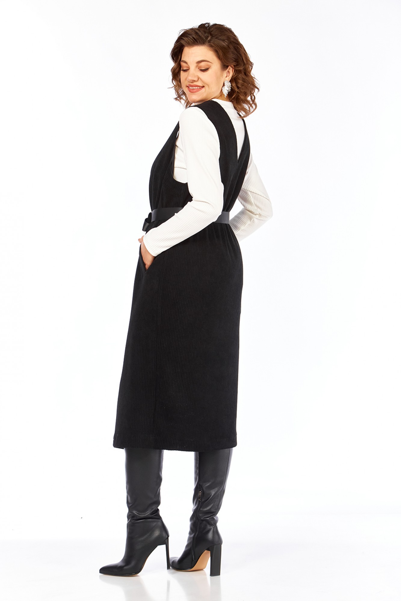 Комплект женский двухпредметный, состоит из джемпера и сарафана. Сарафан прямого силуэта из трикотажного полотна с имитацией вельвета. Горловина V -образной формы с отделкой из экокожи. Застежка центрально — бортовая на петли и пуговицы. По переду нагрудные вытачки и обработаны карманы с листочками. На спинке фигурный вырез. Сарафан на подкладке. Джемпер полуприлегающего силуэта, выполнен из трикотажного полотна. Горловина круглой формы. Рукава втачные, длинные. В комплекте съемный ремень.