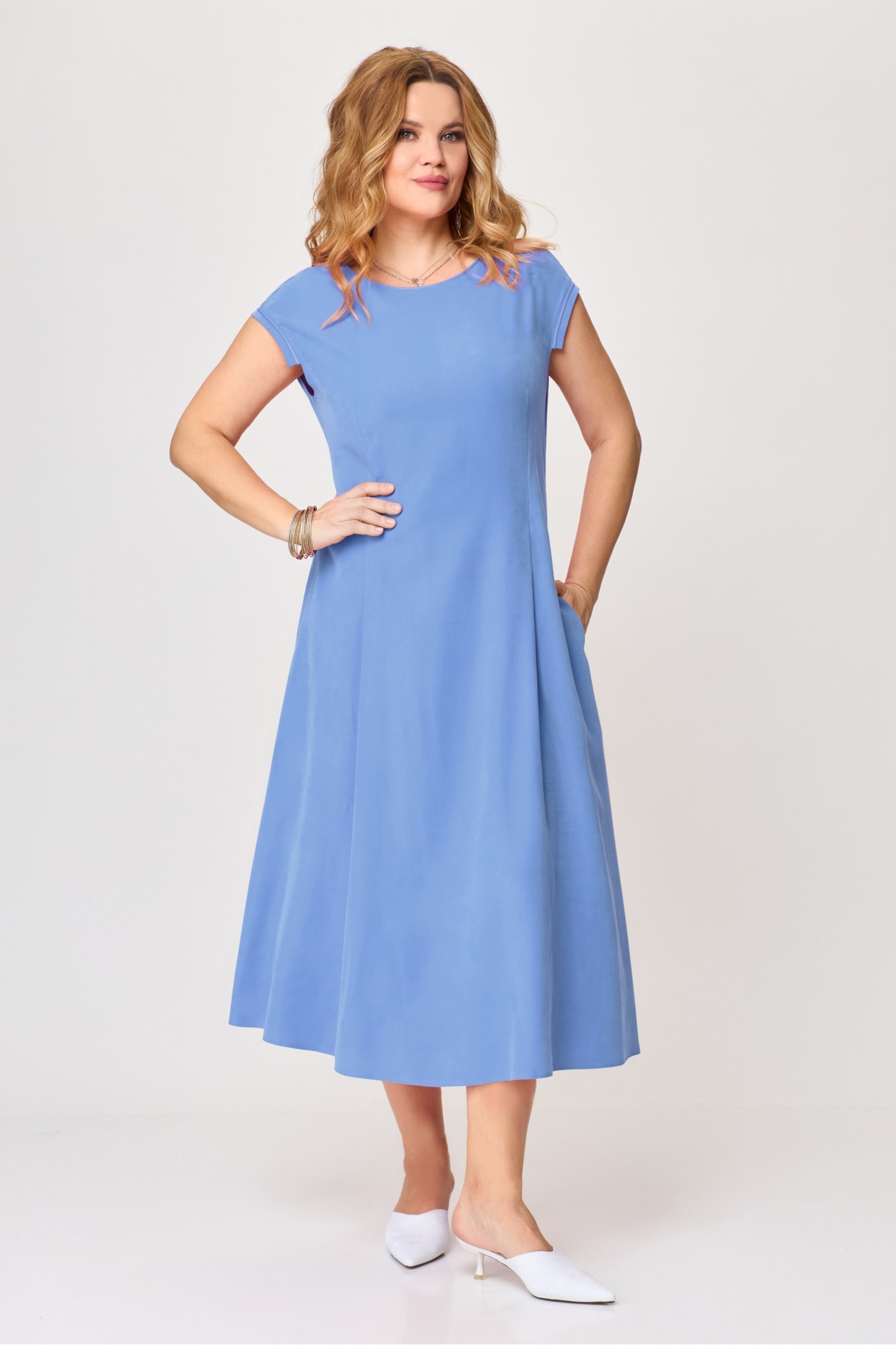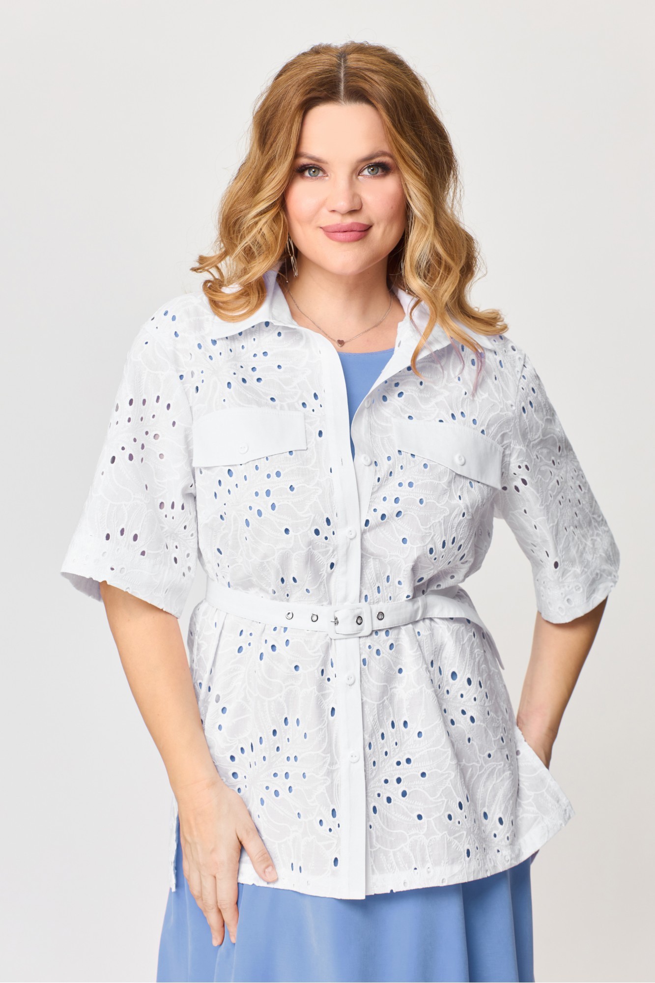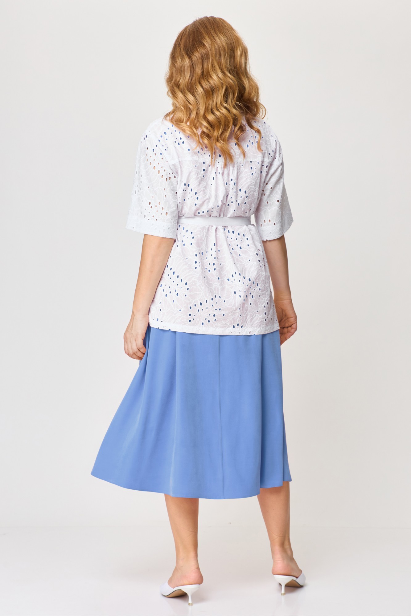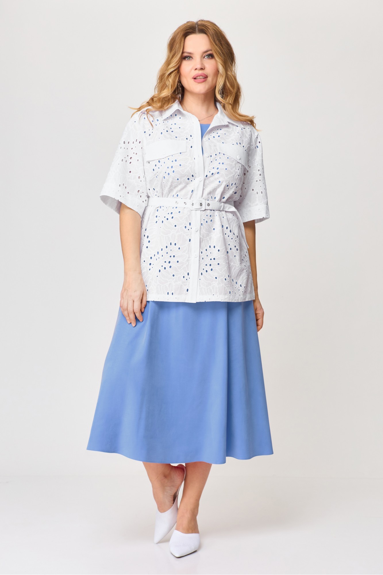 Комплект женский (блузка и платье). Блузка женская свободного силуэта, длиной ниже линии бедер, с втачными рукавами, со спущенной линией плеча, со съемным поясом, с центральной сквозной застёжкой на 7 петель и 7 пуговиц и 1 пуговицу и 1 петлю на стойке воротника. Детали переда с притачными планками, с нагрудными вытачками, с клапанами, на которых декоративно прикреплены пуговицы. Спинка блузки с кокеткой, на нижней детали по шву притачивания по центру - сборка. Рукава втачные одношовные, короткие. Воротник сорочечный с отрезной стойкой. Платье женское, повседневное, полуприлегающего силуэта, расширенное к низу, со спущенной линией плеча, длиной до середины икр, в боковых швах обработаны карманы. На детали переда платья на уровне линии талии обработаны 2 вытачки-складки. Деталь спинки платья со средним швом, вверху которого обработан разрез с застежкой на 1 навесную петлю и пуговицу. На уровне линии талии обработаны по одной вытачке-складке. По проймам вставлены планки с декоративной тесьмой. Вырез горловины платья округлой формы, обработан обтачкой и оформлен втачной декоративной тесьмой.