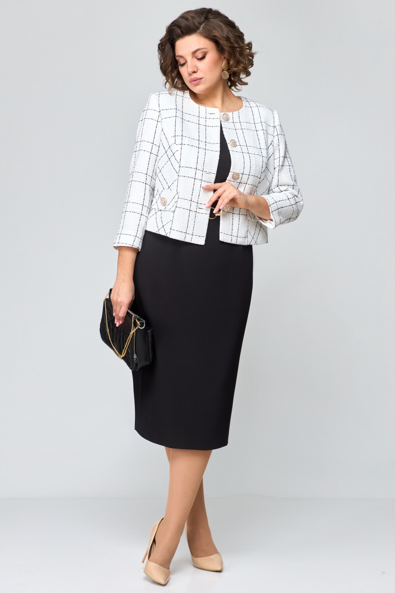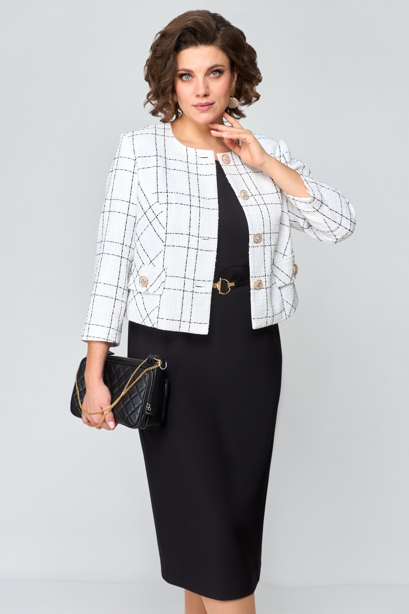 Красивый и стильный комплект в элегантном сочетании однотонного платья и жакета в клетку подойдет и для строгого образа, и для создания светлого, яркого и нежного лука с романтичными мотивами. Жакет слегка приталенного силуэта на подкладке без воротника с застежкой на 4 петли и пуговицы. По переду жакета клапаны с декоративной пуговицей. Рукав втачной двухшовный длиной 7/8. Спинка со средним швом и талевыми вытачками. Платье полуприлегающего силуэта на подкладке, слегка со спущенной линией плеча. По переду частичный подрез по талии. В среднем шве спинки потайная молния и разрез по низу. Образ дополняет ремень с оригинальной пряжкой.
