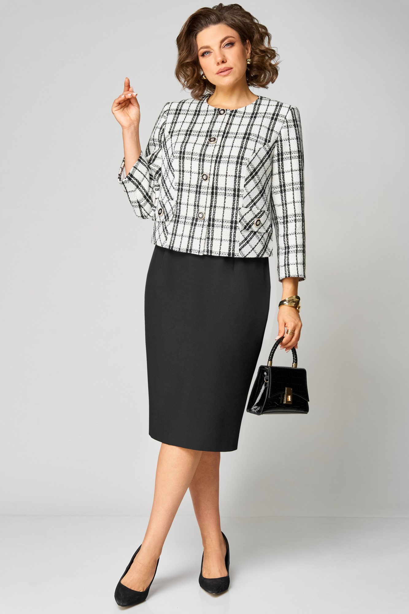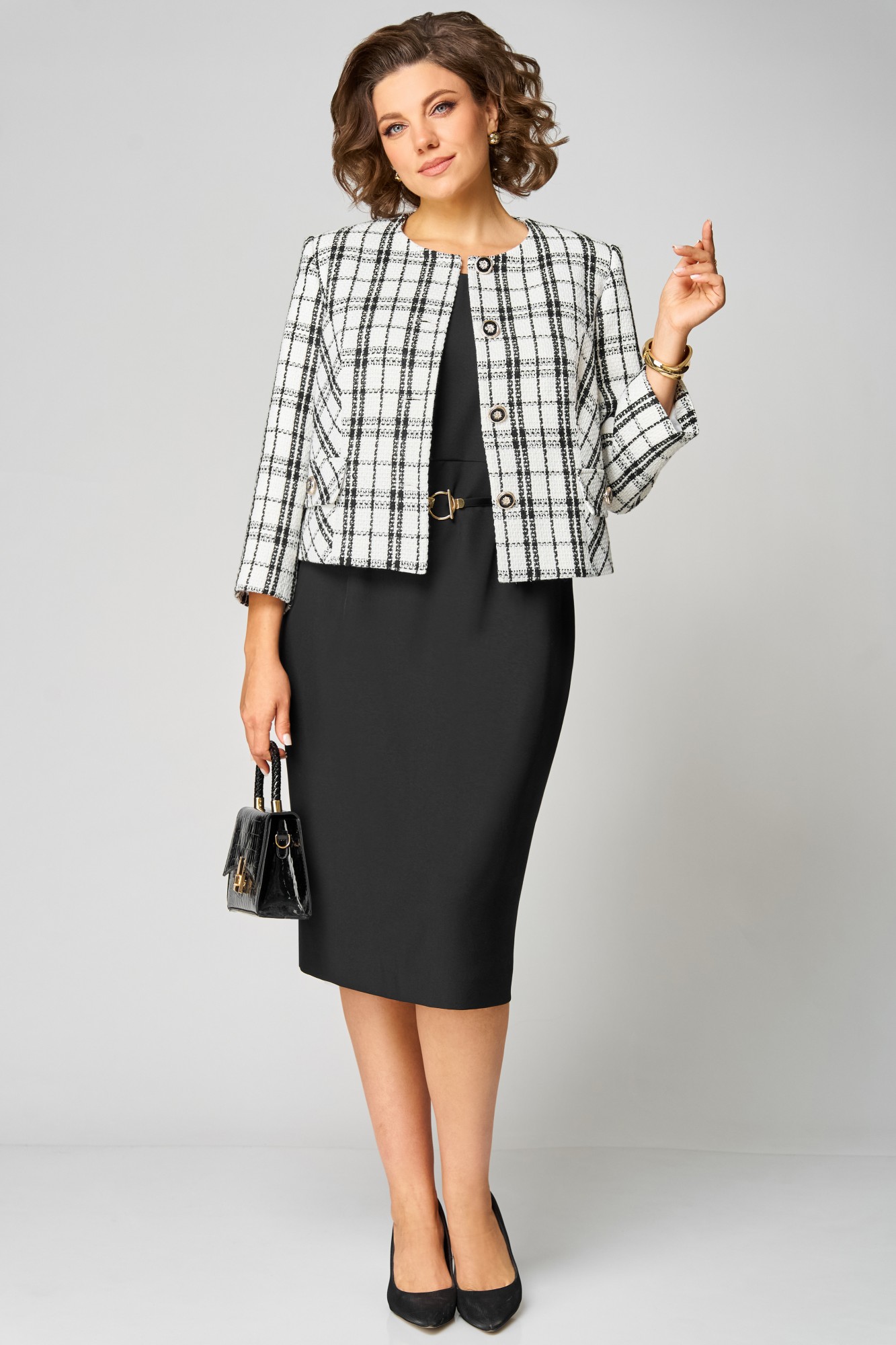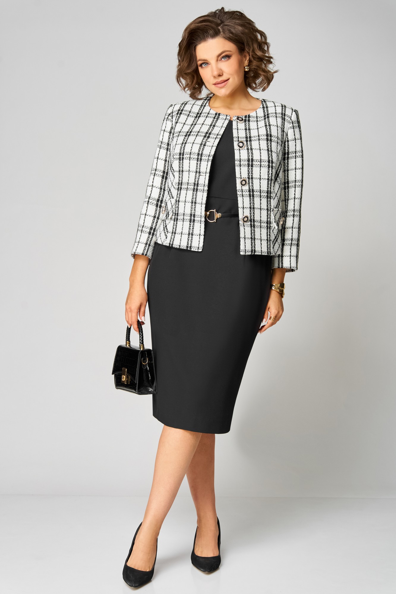 Красивый и стильный комплект в элегантном сочетании однотонного платья и жакета в клетку подойдет и для строгого образа, и для создания светлого, яркого и нежного лука с романтичными мотивами. Жакет слегка приталенного силуэта на подкладке без воротника с застежкой на 4 петли и пуговицы. По переду жакета клапаны с декоративной пуговицей. Рукав втачной двухшовный длиной 7/8. Спинка со средним швом и талевыми вытачками. Платье полуприлегающего силуэта на подкладке, слегка со спущенной линией плеча. По переду частичный подрез по талии. В среднем шве спинки потайная молния и разрез по низу. Образ дополняет ремень с оригинальной пряжкой.