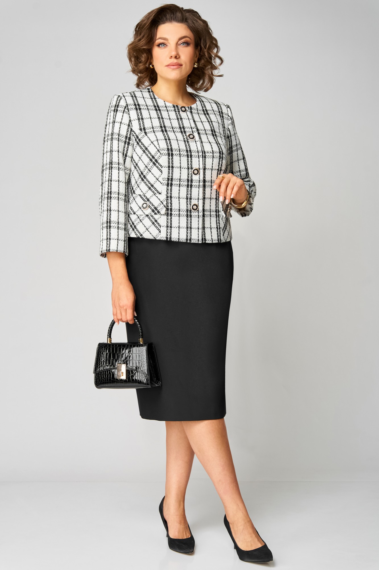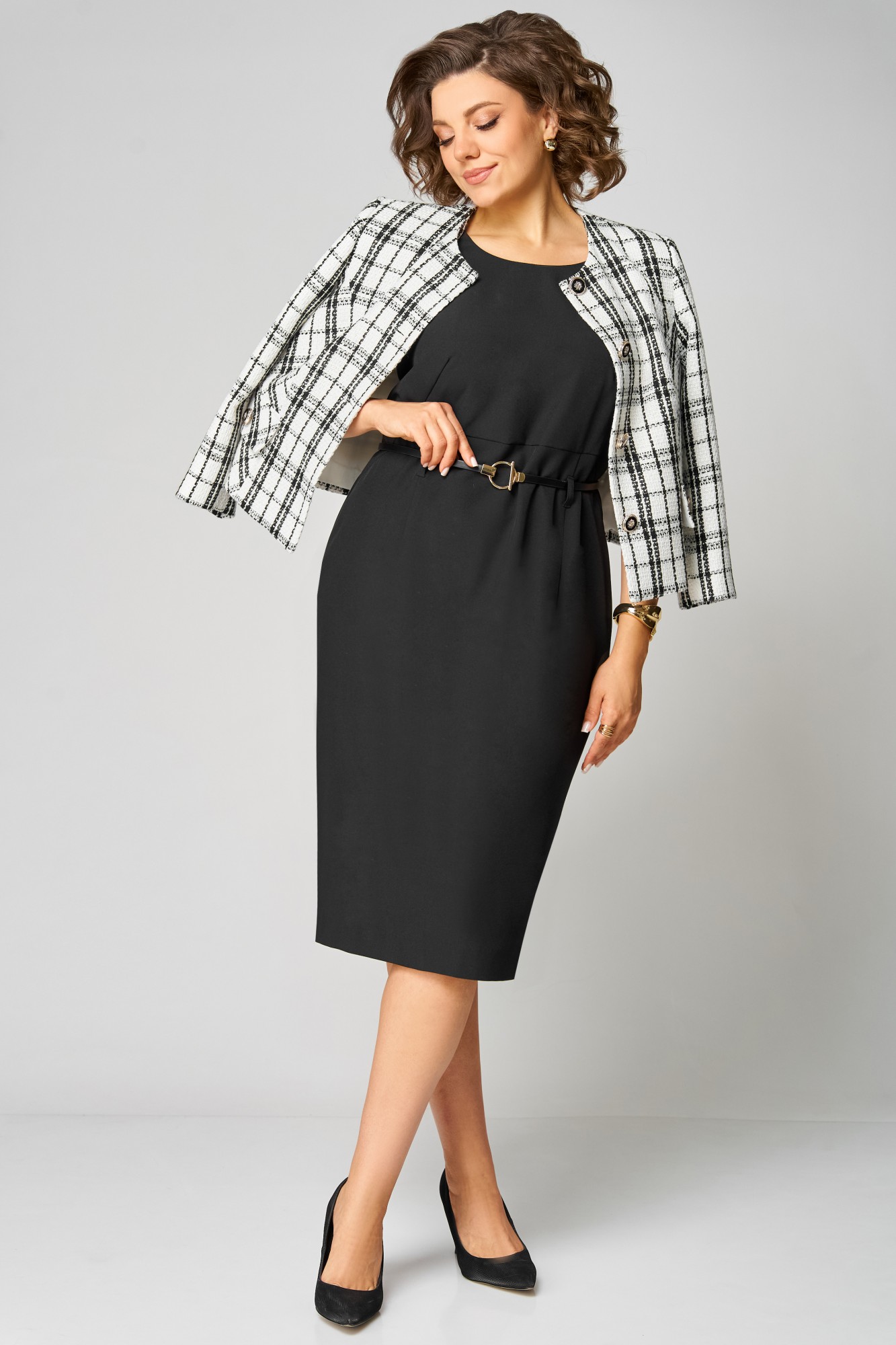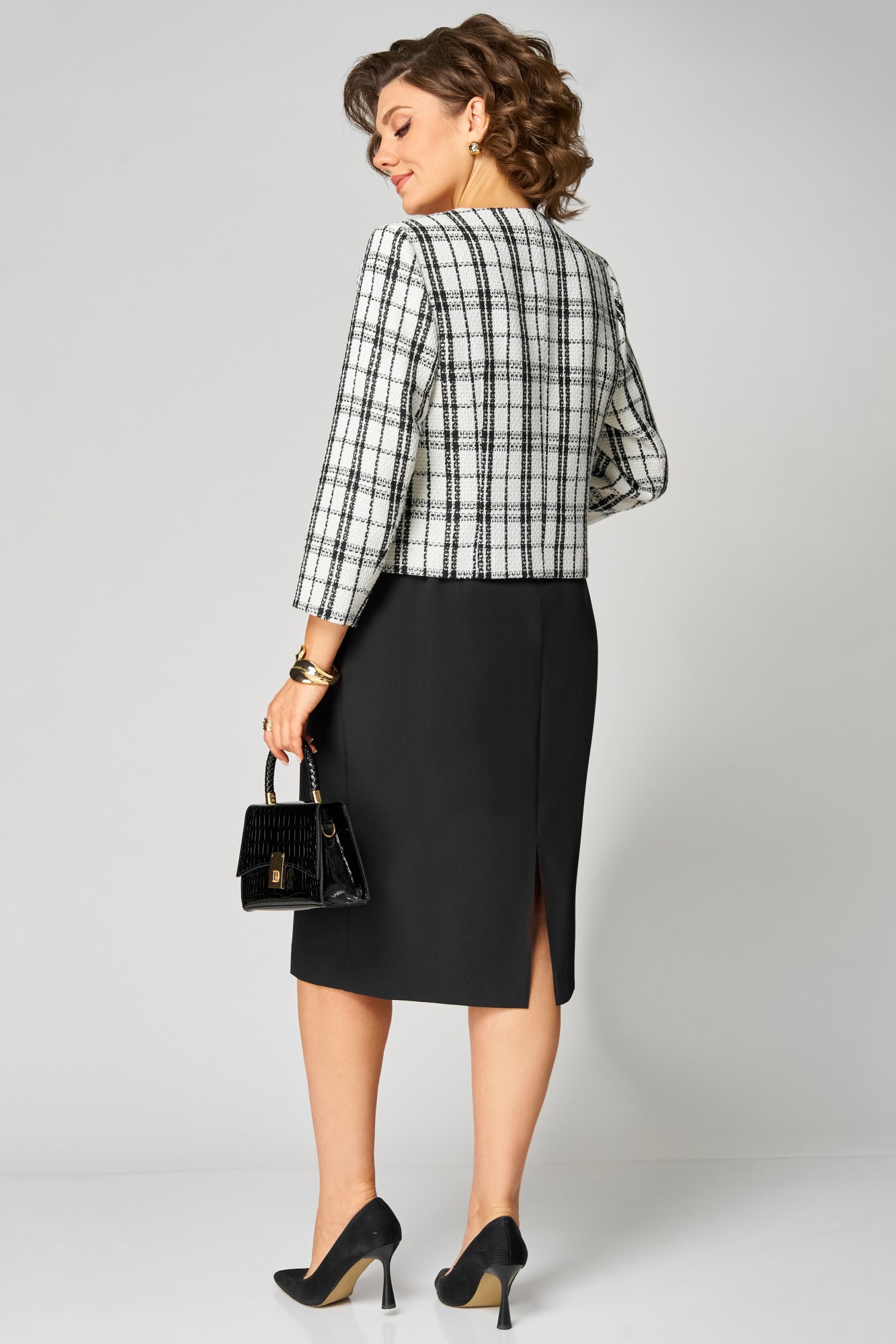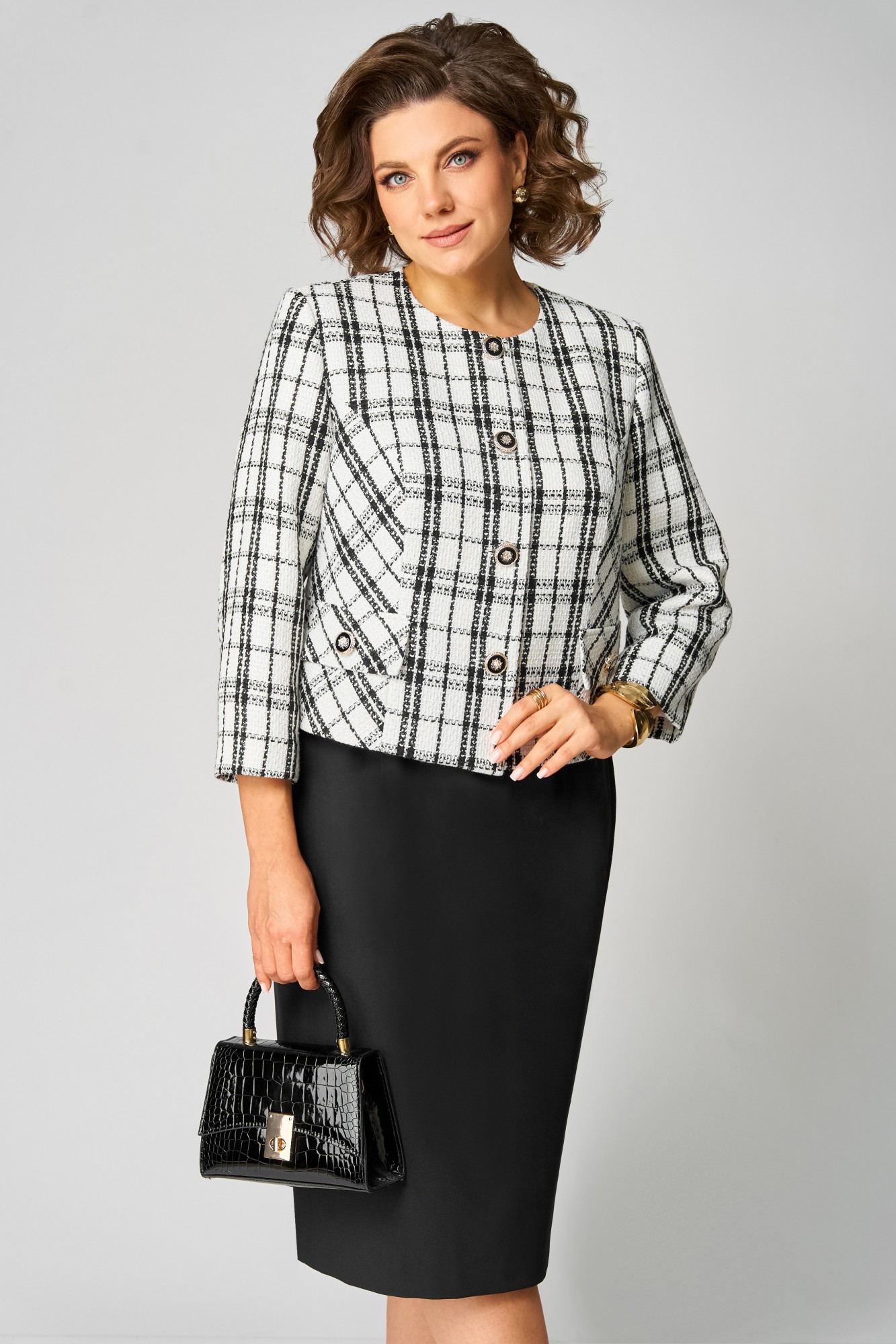 Красивый и стильный комплект в элегантном сочетании однотонного платья и жакета в клетку подойдет и для строгого образа, и для создания светлого, яркого и нежного лука с романтичными мотивами. Жакет слегка приталенного силуэта на подкладке без воротника с застежкой на 4 петли и пуговицы. По переду жакета клапаны с декоративной пуговицей. Рукав втачной двухшовный длиной 7/8. Спинка со средним швом и талевыми вытачками. Платье полуприлегающего силуэта на подкладке, слегка со спущенной линией плеча. По переду частичный подрез по талии. В среднем шве спинки потайная молния и разрез по низу. Образ дополняет ремень с оригинальной пряжкой.