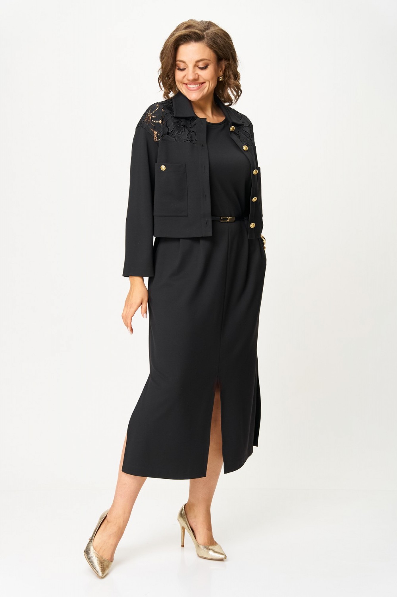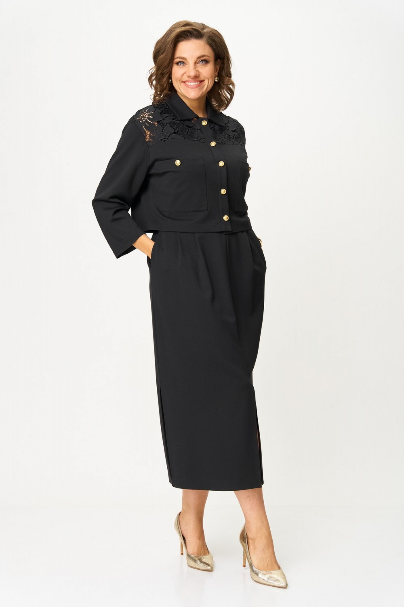 Костюм женский двухпредметный состоящий из платья и жакета. Платье полуприлегающего силуэта, без рукава. Перед платья с горизонтальным швом по талии. Верхняя часть с вытачками по линии груди, нижняя часть со складками в области талии и карманами, что обеспечивает прекрасную посадку и подчеркивает фигуру. Высокие разрезы по бокам и переду платья добавляют удобства. В комплекте съемный ремень. Жакет прямого кроя с застежкой на петли и пуговицы, с втачным рукавом. Линия плеча спущена, по горловине отложной воротник. По переду накладные карманы. Кокетка из кружева по переду и спинке добавляет романтичности и легкости.