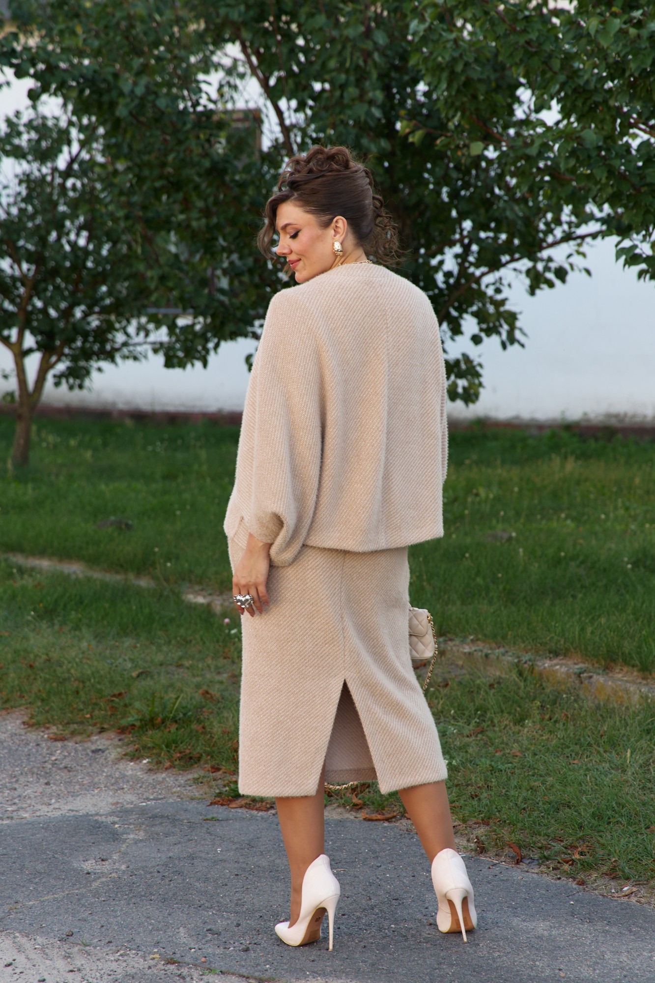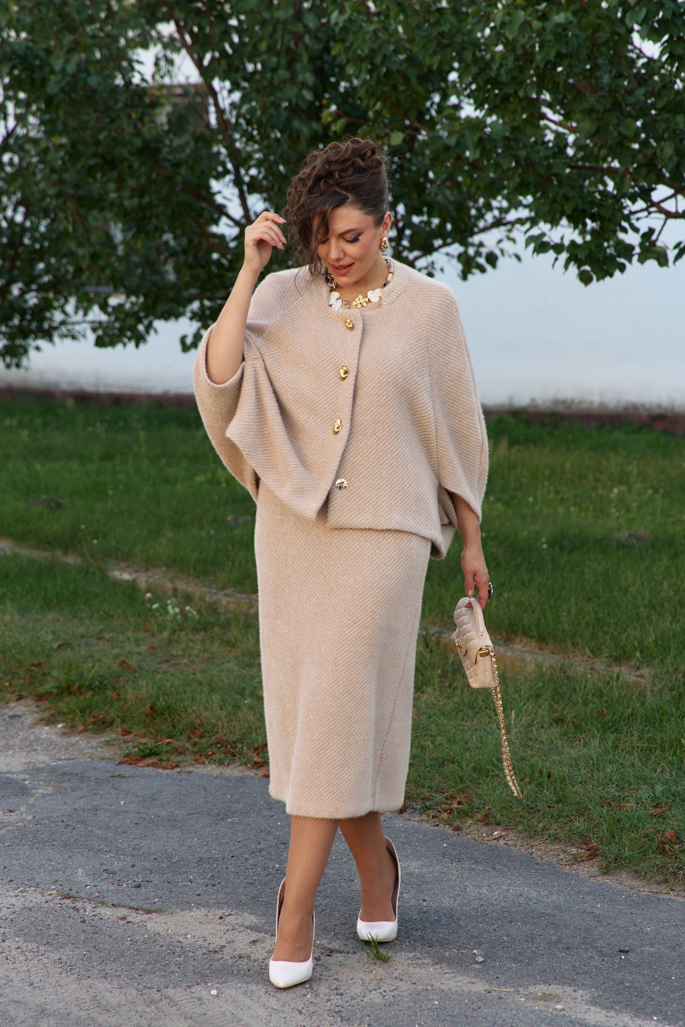 Комплект женский состоящий из жакета и платья. Жакет «оверсайз» свободного силуэта, с центральной застёжкой на потайные кнопки по краю борта. Горловина в жакете округлой формы с прилегающим воротником-стойкой. Рукав по форме летучая-мышь с фигурной линией низа. По переду платья рельеф уходящий в рукав. Спинка со средним швом. Боковые швы жакета переходят на перёд. В качестве дополнительного декоративного элемента по краю борта жакета декоративные украшения в виде брошек.