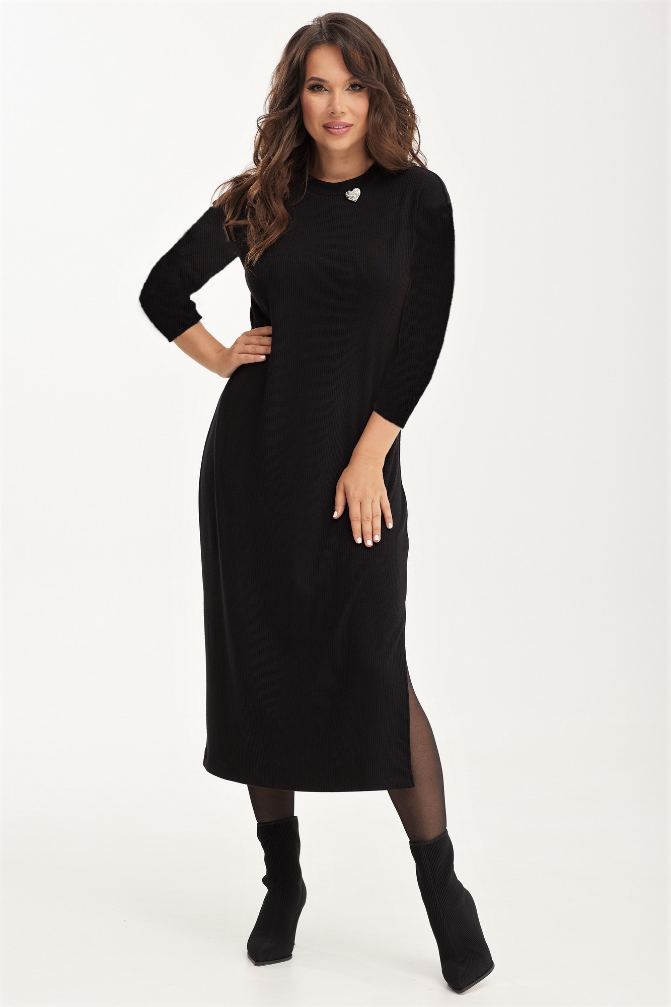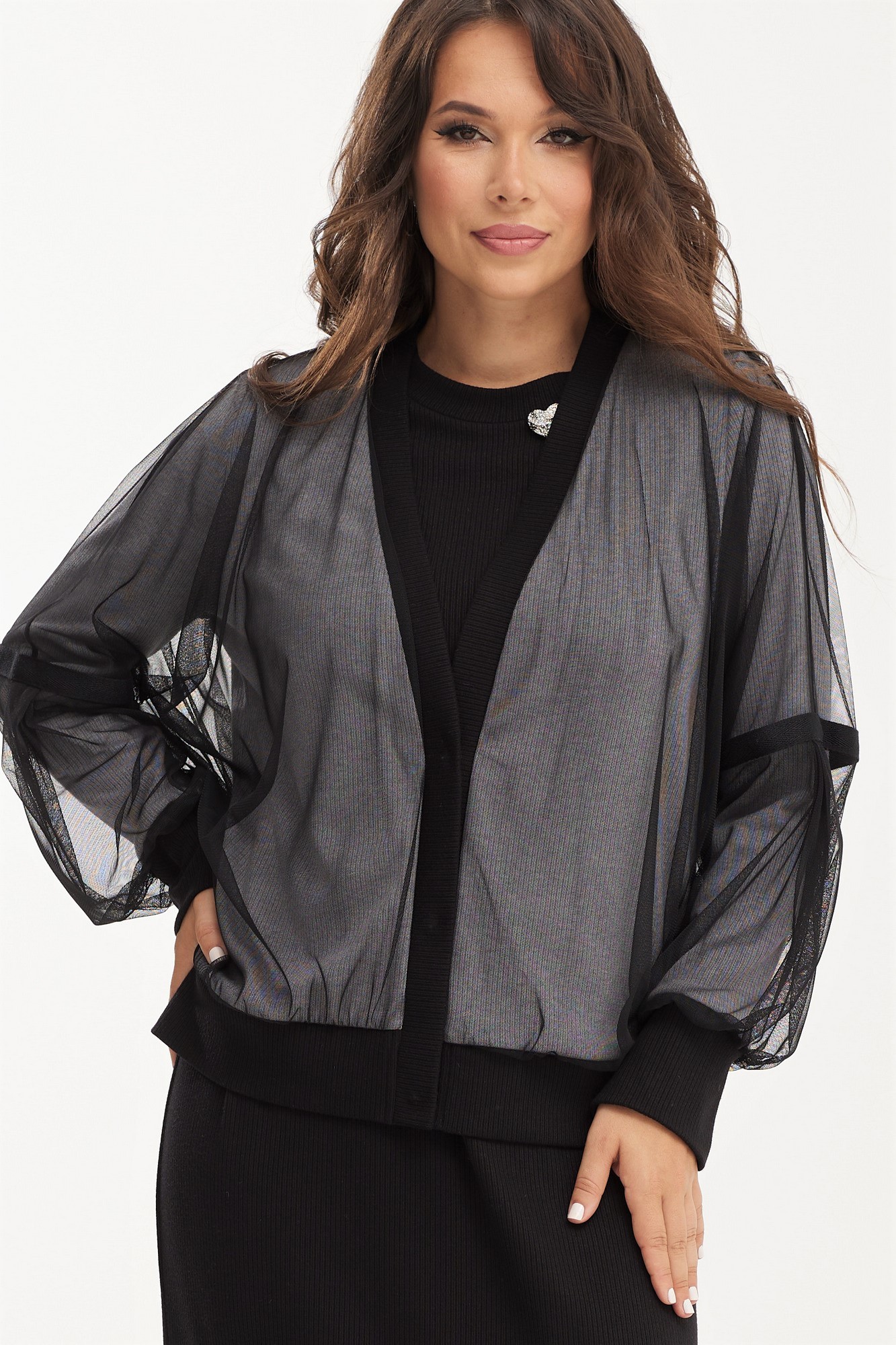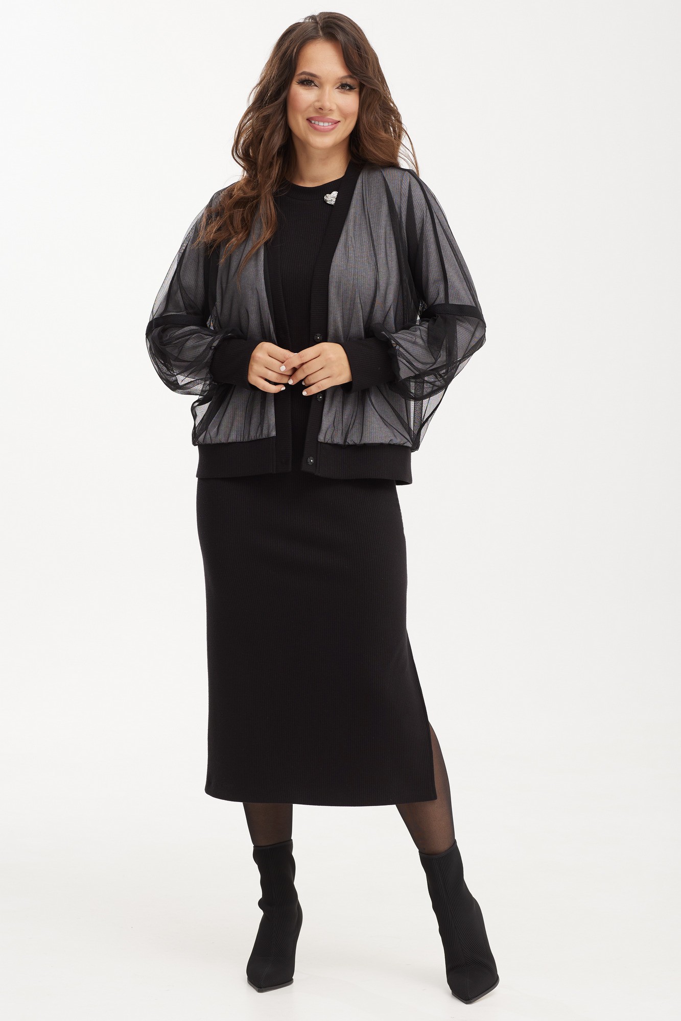 Элегантный комплект из кардигана и платья. Выполнен из фактурного трикотажного полотна средней плотности(лапша). Отлично держит форму и скрывает недостатки. Кардиган свободного кроя с центральной застежкой на пришивные кнопки. Рукав втачной, слегка спущен. Воздушный фатиновый эффект кардигану придает объемно наложенная текстильная сетка, закрепленная по горловине, в манжетах рукава, а так же по низу кардигана. Стыковочные швы обработаны декоративной тесьмой. Низ рукава и кардигана обработан довязом, выполненным из основной ткани. Платье миди прямого кроя с боковым разрезом. Рукав втачной, длина 3/4. Горловина обработана довязом из основной ткани.