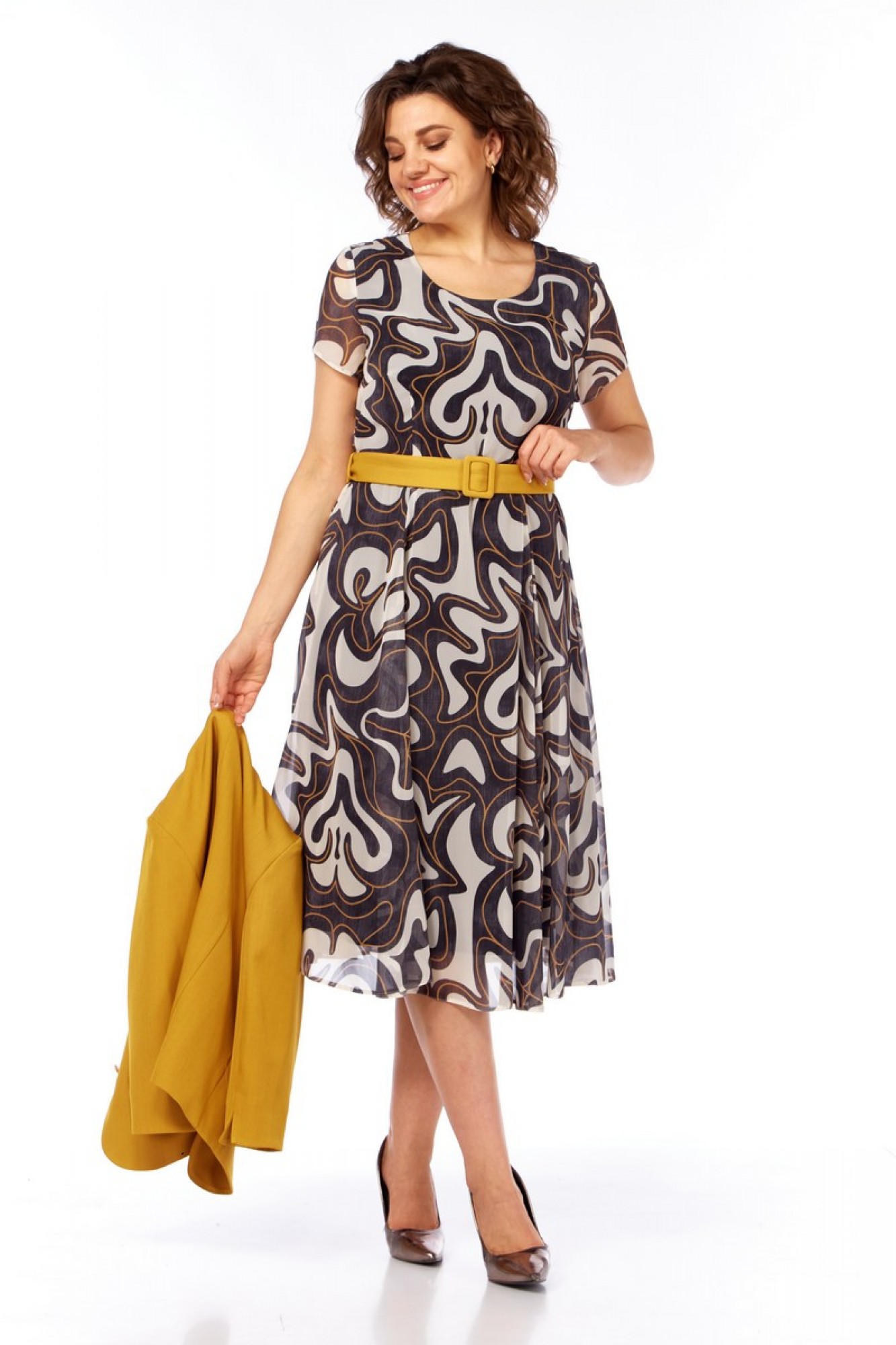 Комплект женский, состаящий из жакета и платья. Жакет приталенного силуэта. Округлый вырез горловины и борта. По полочке-карманы с листочкой и клапанами. Рукав втачной, с разрезами по низу. По переду-застёжка на петли-пуговицы. Жакет без подкладки (летний вариант). Платье приталенного силуэта, со свободной юбкой, на подкладке. Округлый вырез горловины. Рукав втачной, короткий. Застежка на молнию в боковом шве. В комплекте-пояс в цвет жакета.