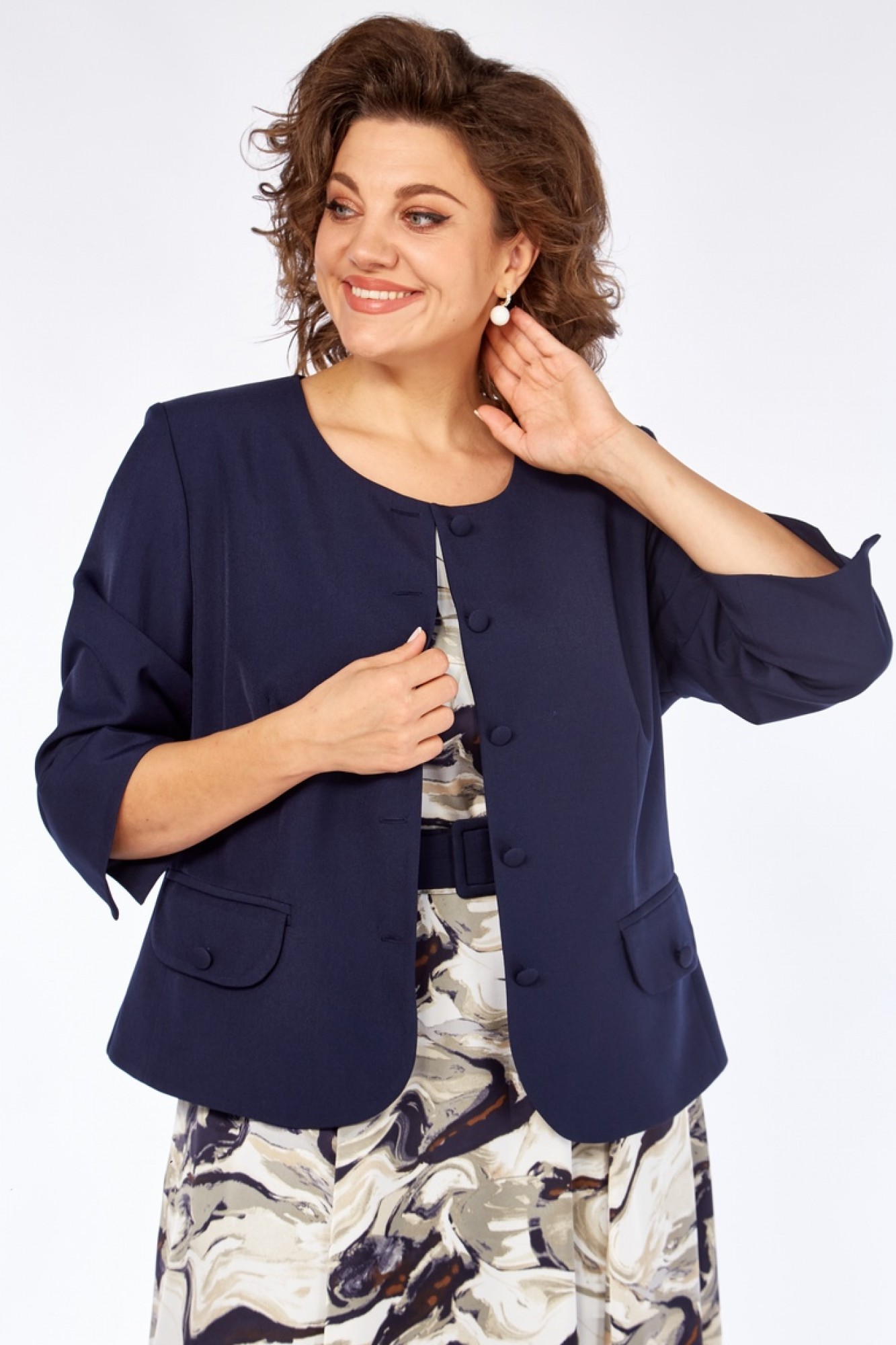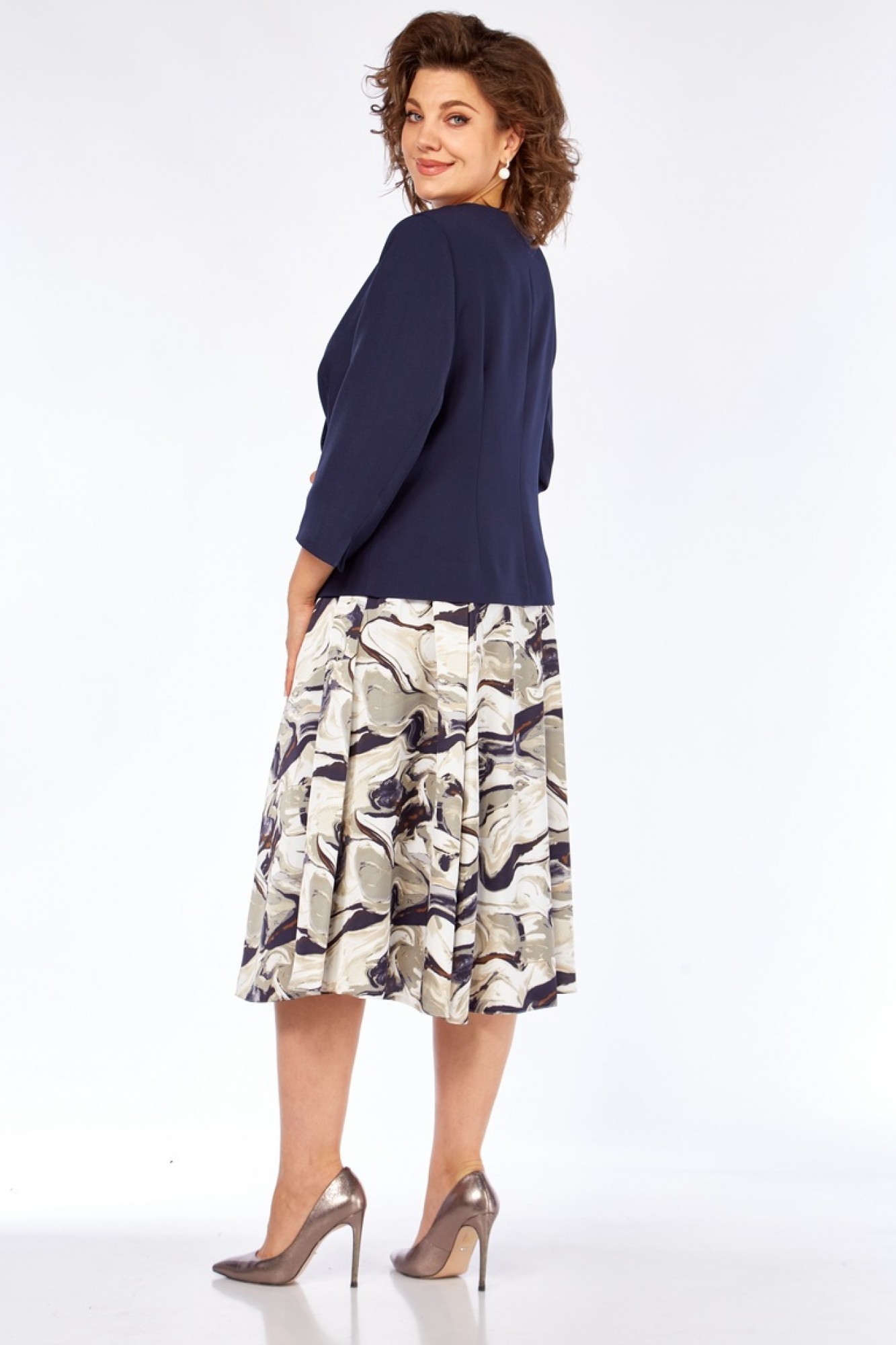 Длина по спинке жакета - 53 см, длина рукава - 30 см. Длина по спинке платья - 113 см, длина рукава - 19 см