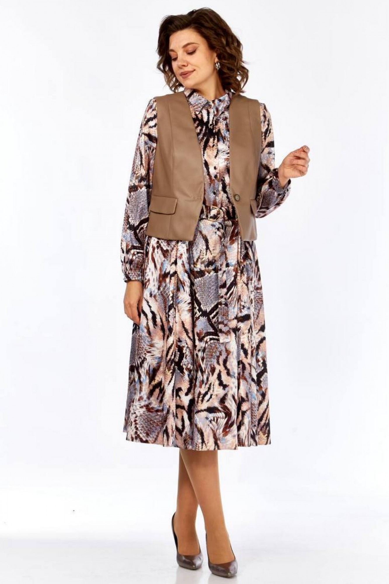 Комплект женский, состоящий из платья и жилета. Платье свободного силуэта, шифоновое, полностью на подкладке. Рукав втачной, снизу собран на манжету, манжета застегивается на петлю и пуговицу. По талии платье отрезное, спереди до талии планка на петли и пуговицы и нагрудные вытачки, которые позволяют создать идеальную посадку по груди. Юбка-шестиклинка. Дополнительно в комплекте к платью присутствует пояс из основной ткани. Жилет полуприлегающего силуэта из эко-кожи, с накладными декоративными клапанами, застежка на одну петлю и пуговицу.