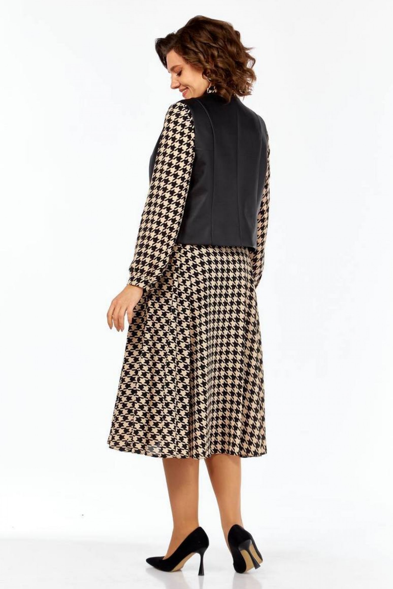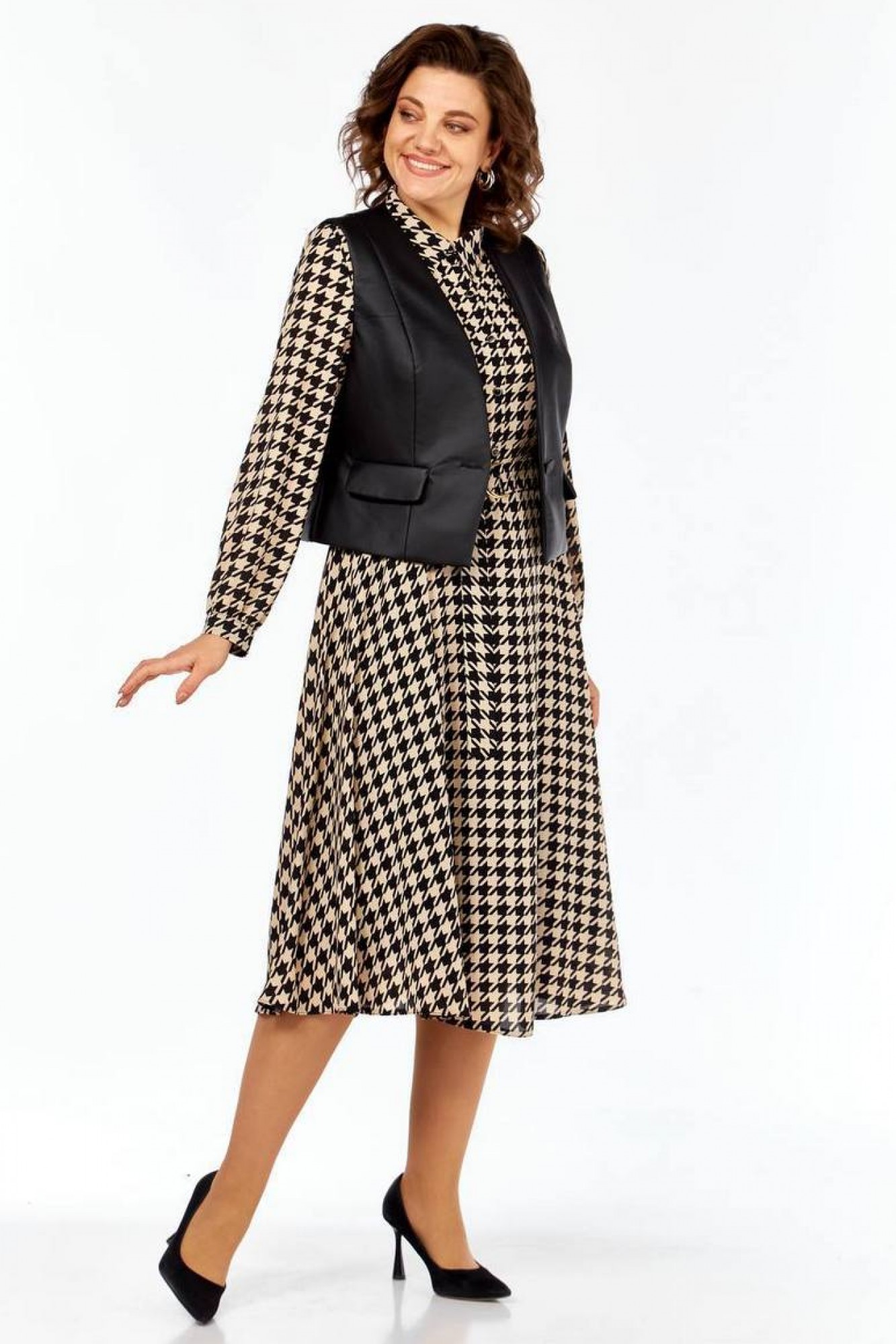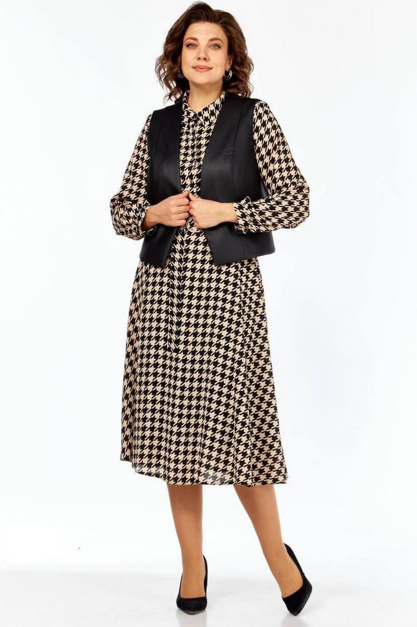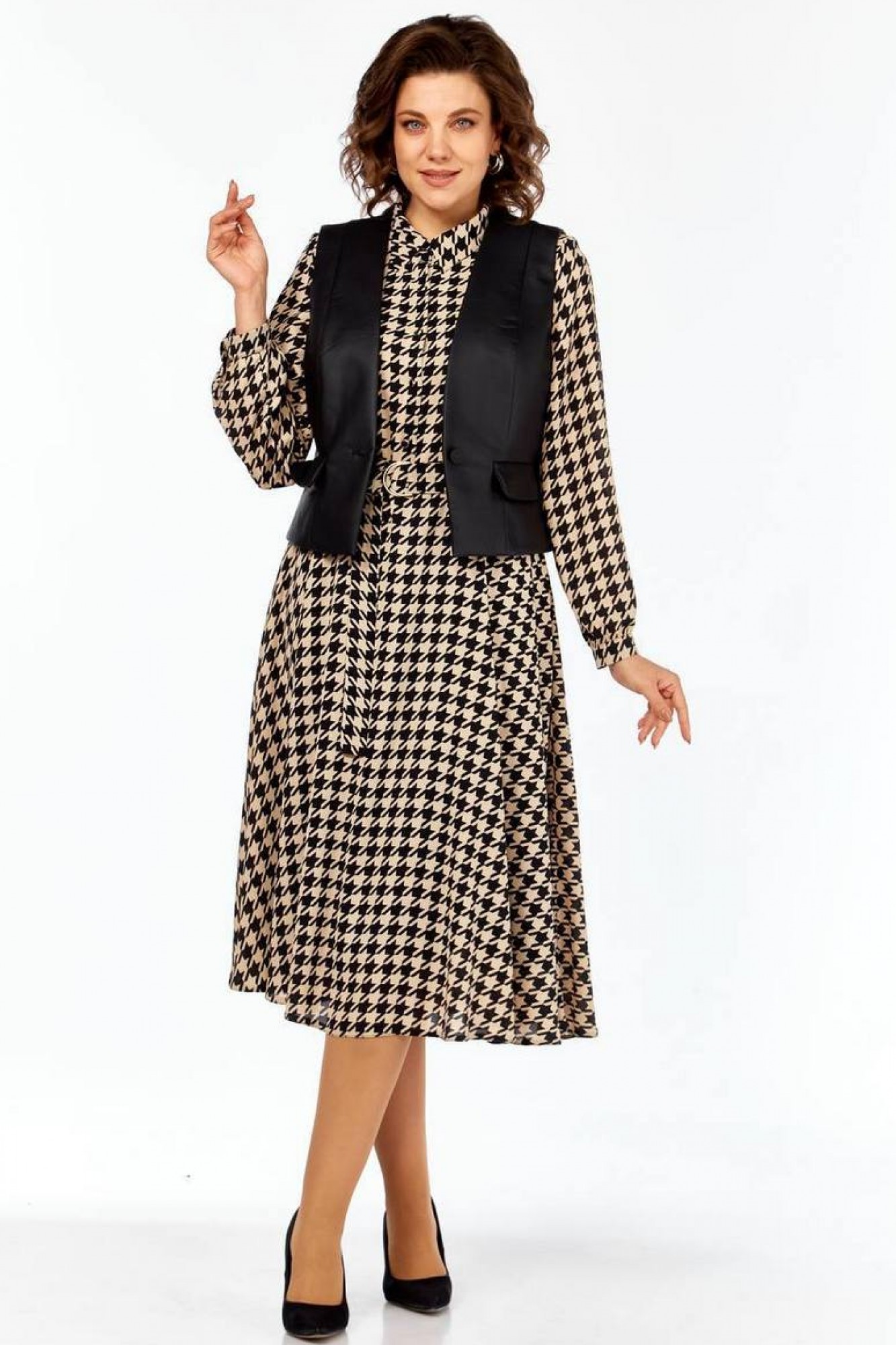 Комплект женский, состоящий из платья и жилета. Платье свободного силуэта, шифоновое, полностью на подкладке. Рукав втачной, снизу собран на манжету, манжета застегивается на петлю и пуговицу. По талии платье отрезное, спереди до талии планка на петли и пуговицы и нагрудные вытачки, которые позволяют создать идеальную посадку по груди. Юбка-шестиклинка. Дополнительно в комплекте к платью присутствует пояс из основной ткани. Жилет полуприлегающего силуэта из эко-кожи, с накладными декоративными клапанами, застежка на одну петлю и пуговицу.
