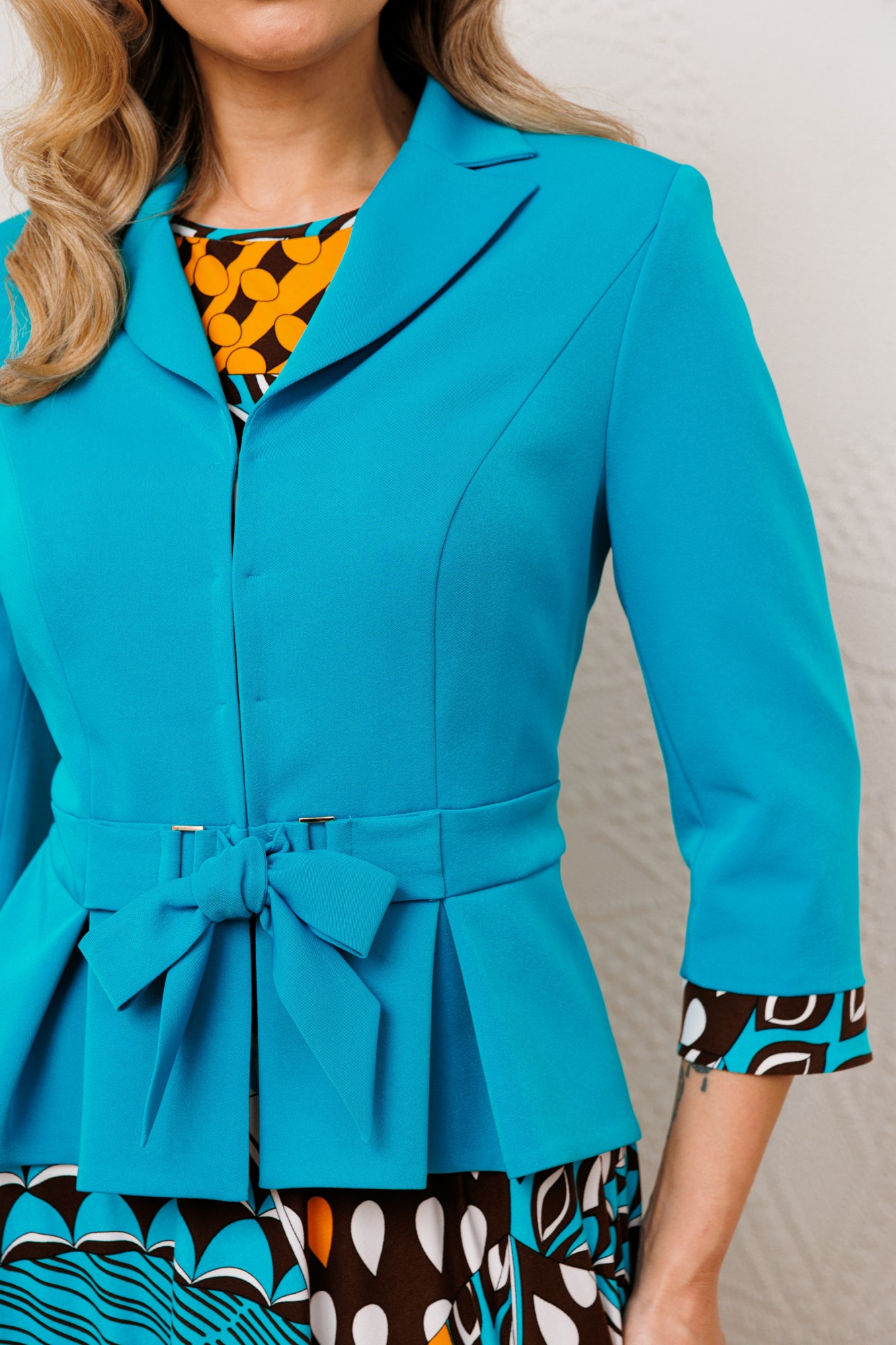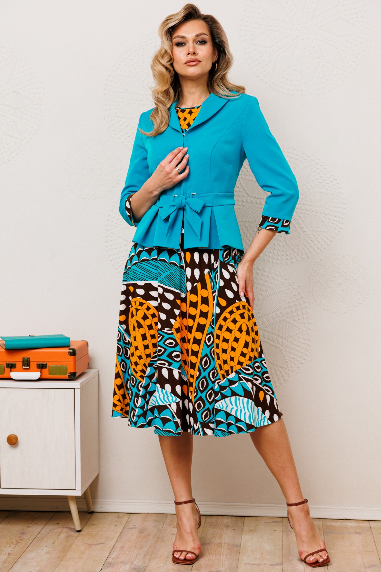 Женственный комплект в ярких тонах с ультрамодными принтами. Состоит из жакета и платья. Жакет приталенного силуэта с застежкой встык на декоративные крючки. Воротник пиджачного типа. По переду вертикальные рельефы из проймы. В области талии отрезная планка, переходящая в пояс-завязку через декоративные рамки. По низу переда и спинки фигурная баска со складками. Рукава втачные двухшовные, с манжетой по низу из отделочного материала. Платье приталенное, отрезное по линии талии. Юбка расширенная к низу. Лиф с нагрудными вытачками. Горловина круглой формы. Рукав короткий, втачной.