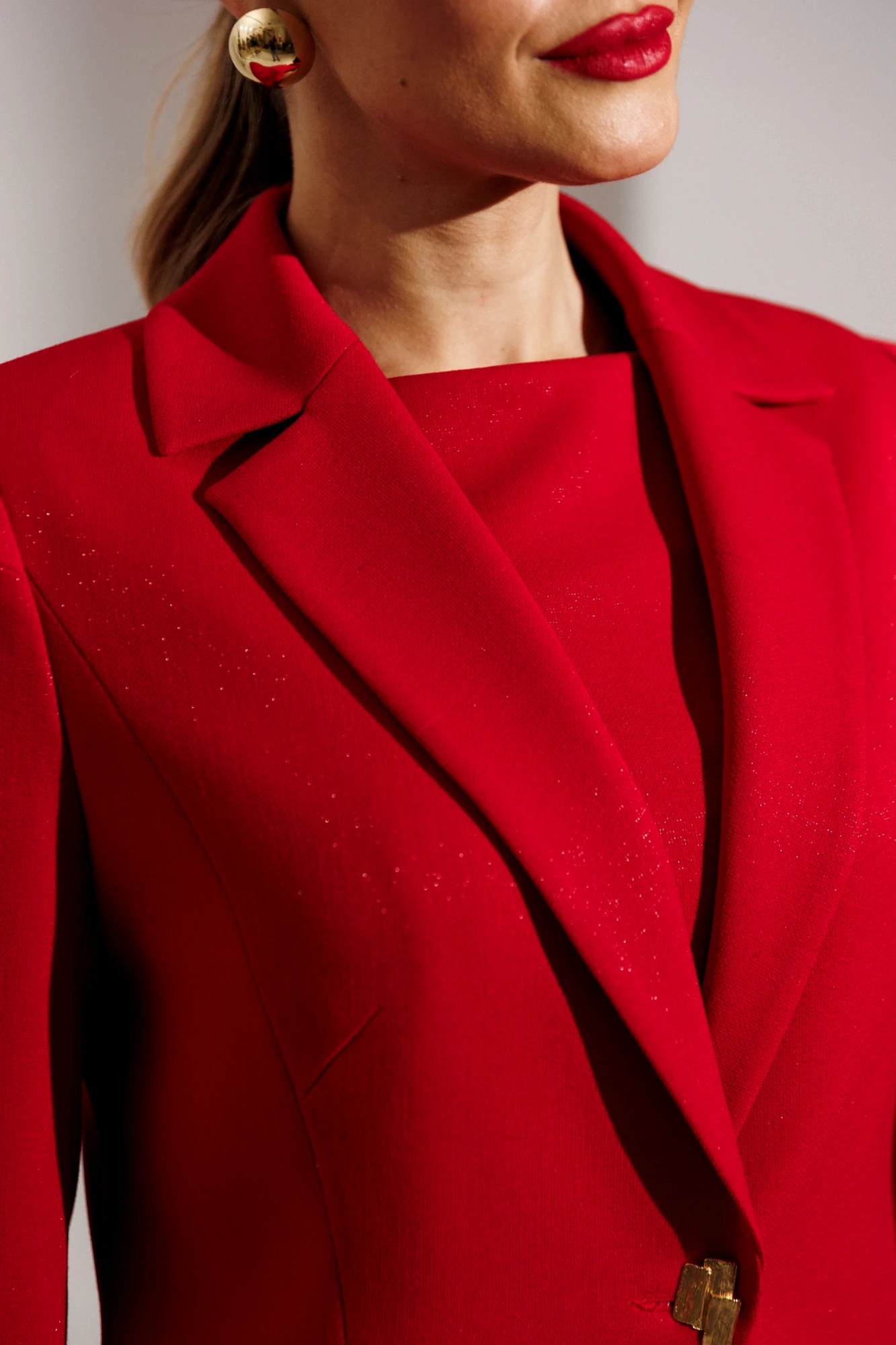 Нарядный комплект, состоящий из жакета и платья. Жакет - воплощение стильной трансформации. Его классический крой выполнен из безупречной трикотажной ткани, но в деталях скрывается своенравный характер. Жакет полуприлегающего силуэта. Модель отличается аккуратным кроем и стильными деталями. На передней части жакета обработаны вертикальные рельефы, идущие от проймы до уровня кармана и от кармана до низа, что придаёт силуэту выразительность и стройность. Воротник пиджачного типа добавляет классической элегантности. Застёжка центральная бортовая на петлю-пуговицу. Карманы в рамке с клапанами, гармонично расположены на передней части жакета. Спинка с центральным швом и вертикальными рельефами, идущими от проймы. Рукава двухшовные с отрезной деталью по окату и разрезами внизу добавляют свободы движению и делают модель более интересной. Жакет на подкладке. Платье женское приталенное из трикотажного полотна, длиной ниже колена. Рукава короткие - «крылышки». Вырез горловины спереди «лодочкой», сзади - V-образный. Платье приталено вытачками. В среднем шве спинки обработана шлица и потайная молния. Платье на подкладке.