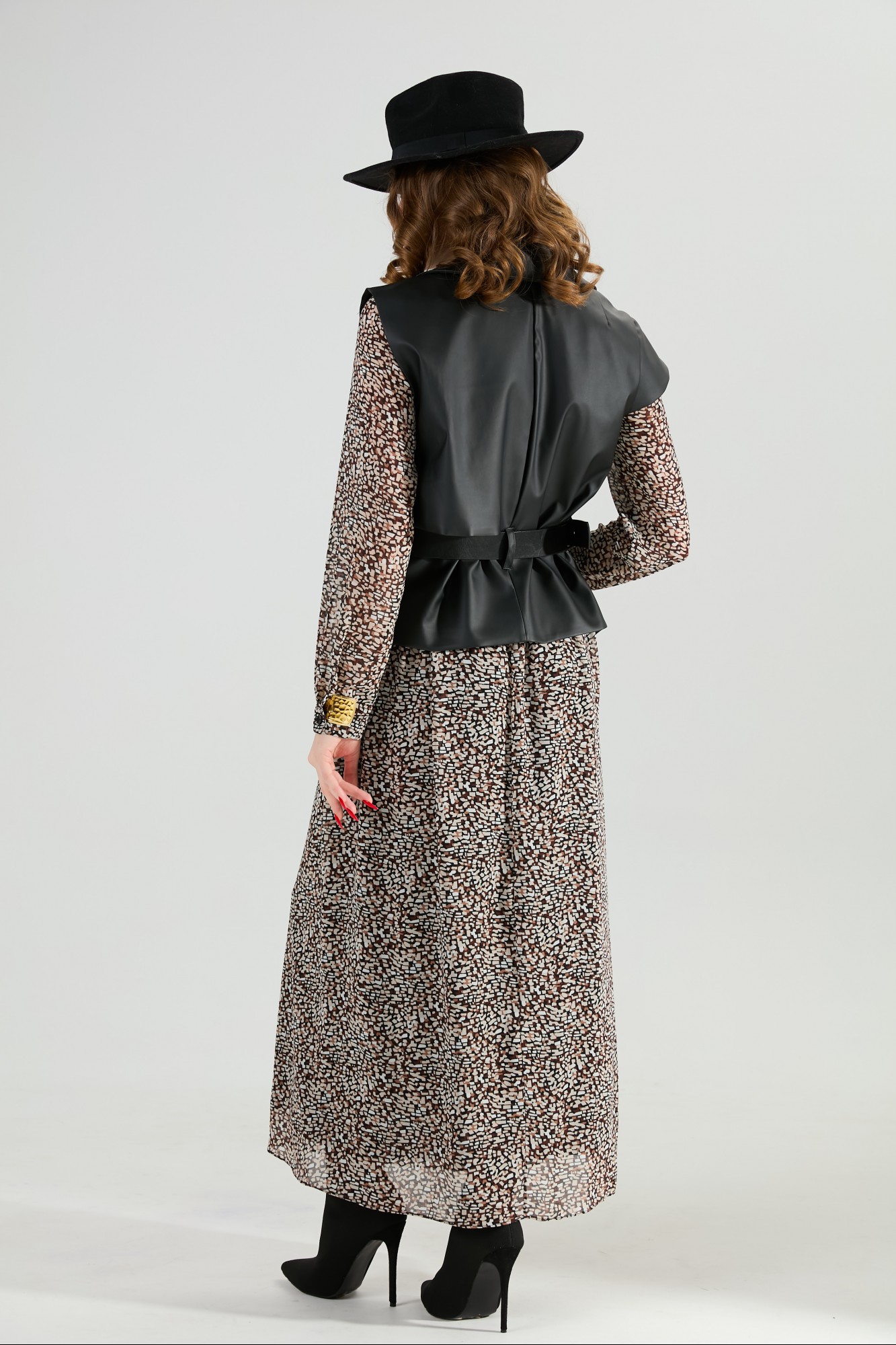Костюм двухпредметный: состоит из платья и жилета. Платье макси прямого силуэта с V-образным вырезом, отрезное по линии талии. Горловине с имитацией чокера, застёжка на петлю и декоративную пуговицу. Рукав немного приспущен, по низу собран на манжет с петлей и пуговицей. Изделие на подкладке. Жилет из экокожи прямого силуэта с воротником пиджачного типа. По правой пройме переда расположена фигурная деталь "крылышко". Спинка со средним швом. По низу правого переда и низу правой спинки фигурная деталь. По левой части переда и левой части спинки отлетная кокетка. Изделие идёт в комплекте с ремнем из экокожи.