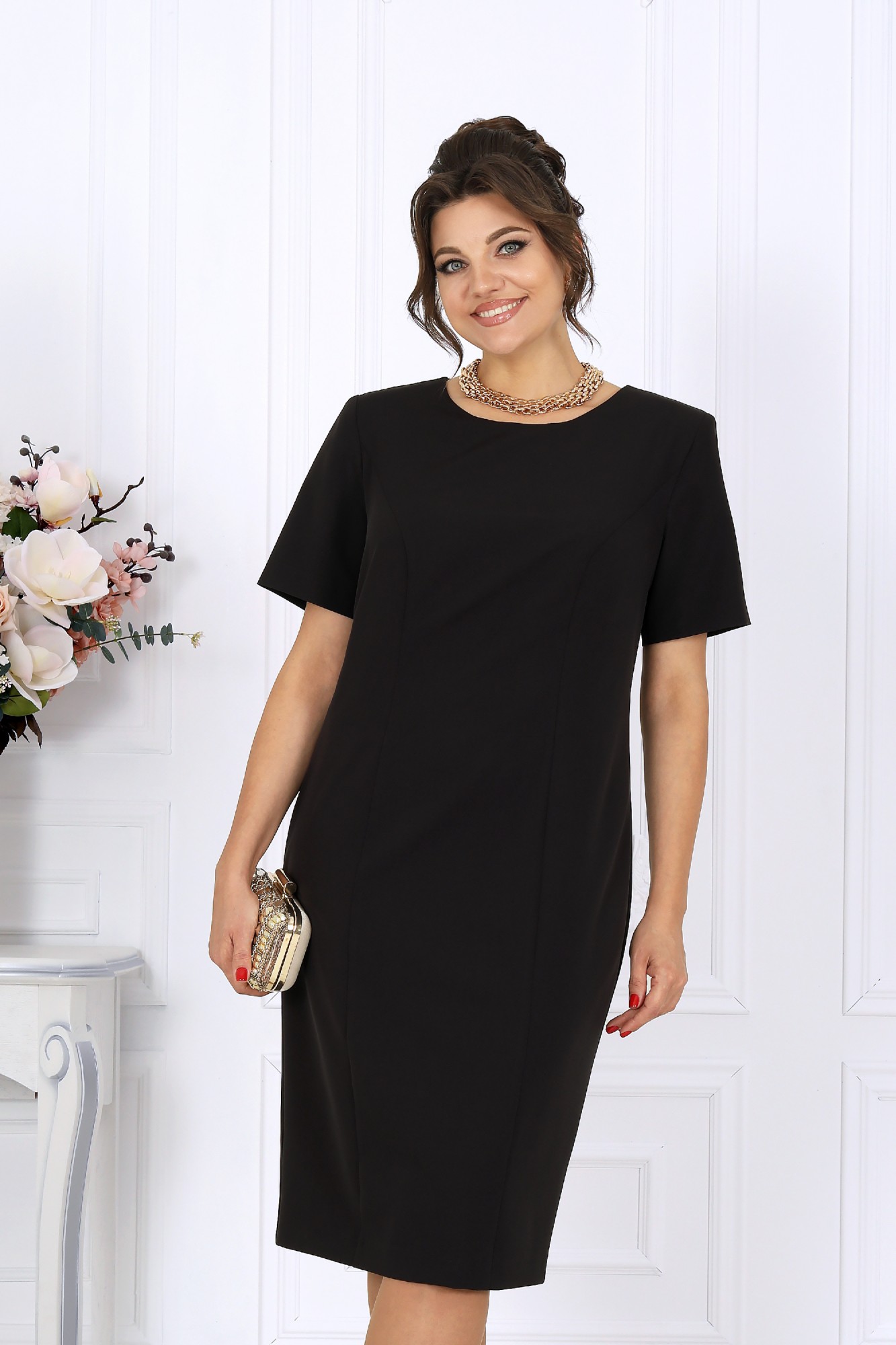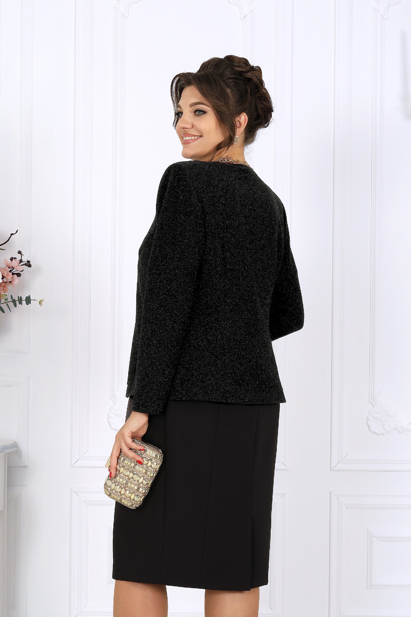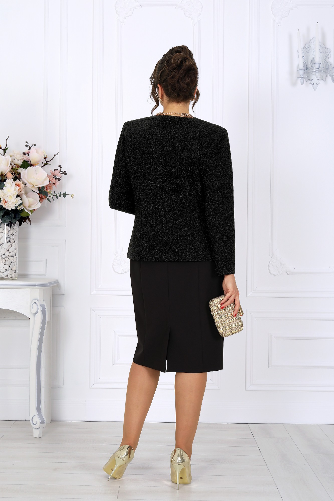 Этот костюм — гармония классики и современности, сдержанная роскошь и продуманная функциональность. Жакет выполнен из трикотажного полотна с благородным мерцанием люрекса - лёгкое свечение ткани придаёт образу торжественность и статусность. Фигурный крой бортов с асимметричной застёжкой визуально вытягивает силуэт, делая талию более выразительной. Подкладка и аккуратные плечевые накладки формируют чёткий, «дорогой» контур, характерный для премиальных моделей. Платье классической длины с утончённой формой выреза придают образу элегантность, а продуманная конструкция со шпицей на спинке гарантирует свободу движений. Этот костюм создан для женщин, которые знают себе цену и выбирают безупречное качество. Он одинаково уместен и в офисе, и на торжестве, и в ресторане — достаточно лишь сменить аксессуары. В нём вы будете чувствовать себя уверенно, женственно и благородно. Комплект женский, 2-х предметный, состоящий из жакета и платья. Жакет полуприлегающего силуэта, выполнен из трикотажного полотна с фактурной лицевой стороной «люрекс». Модель на трикотажной подкладке, с плечевыми накладками. Перед с нагрудными вытачками, направленными от проймы; спинка – с таллиевыми. Фигурные борта фиксируются на запах по линии горловины при помощи внутренней застежки на 2 петли и 2 потайные пуговицы и внешней застежки - на 2 петли и 2 декоративные пуговицы, обтянутые основным материалом. Горловина округлой формой, спереди углубленная. Рукав втачной, длинный. Платье полуприлегающего силуэта, выполнено из костюмно-плательной ткани. Модель на трикотажной подкладке, с плечевыми накладками. Перед и спинка с рельефными швами, направленными от проймы до низа. В верхней части среднего шва спинки обработана застежка на потайную тесьму-«молнию» (50см); в нижней части шва – шлица. Горловина округлой формы, спереди углубленная. Рукав втачной, короткий.