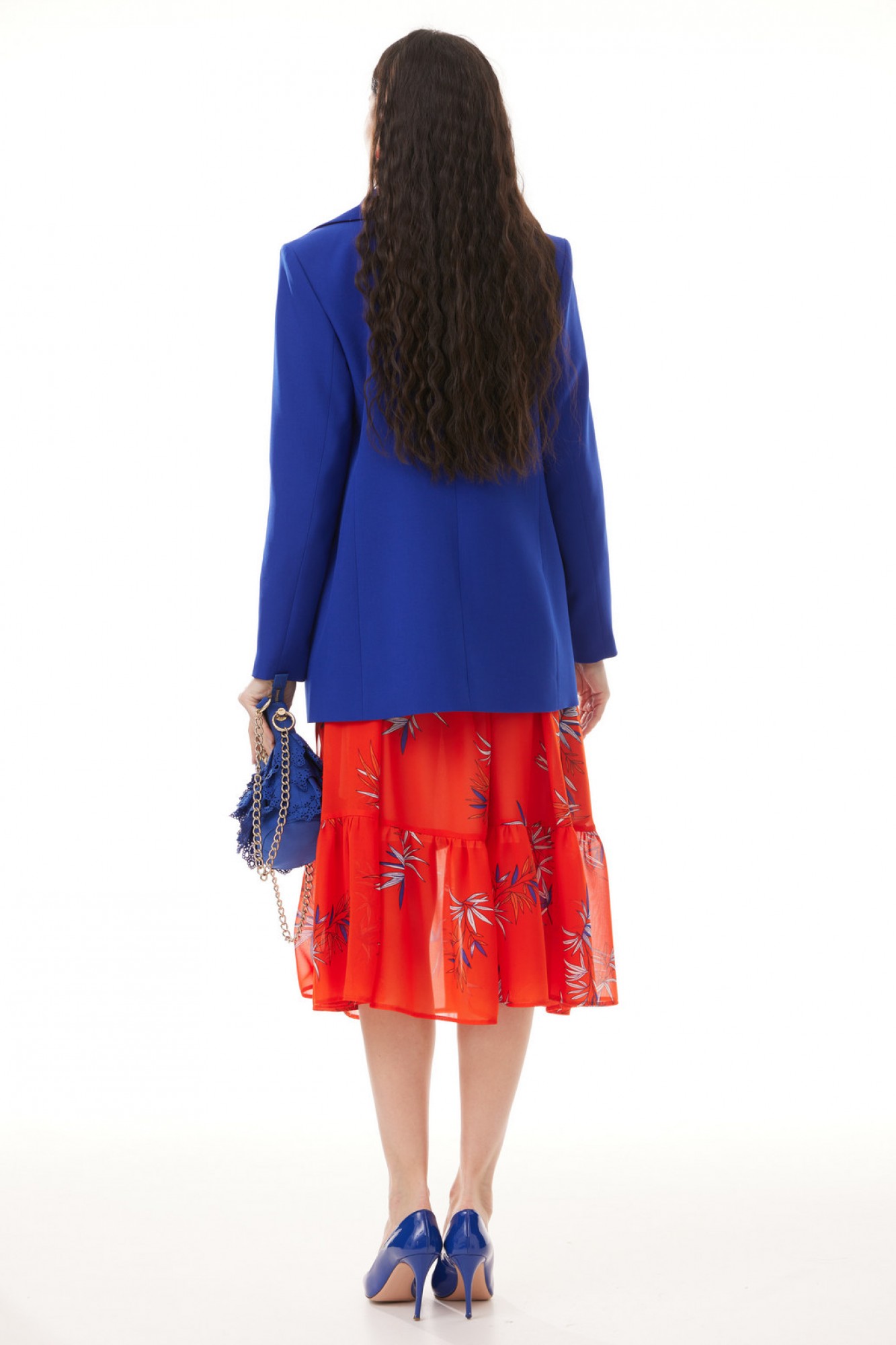 Комплект женский, состоящий из шифонового платья и классического жакета. Платье А-силуэта, на подкладке, длиной мидакси, выполненное из итальянского шифона с принтом. Платье с центральной планкой до линии талии, которая застегивается на петли и пуговицы. Горловина платья с воротником рубашечного типа. В передних рельефах, в области бедер обработаны карманы, по низу - разрезы. По нижней части платья - притачной волан. Рукав втачной, одношовный, по низу рукава - притачная манжета, застегивающаяся на петлю и пуговицу. Жакет выполнен из костюмной поливискозы на подкладке. Жакет прямого силуэта с намеком на полуприлегание, с застежкой на две петли и две пуговицы. Перед жакета с рельефами, нагрудными выточками и прорезными карманами с клапаном. Спинка жакета со средним швом. Горловина оформлена воротником пиджачного типа. В комплект входит декоративный контрастный ремень из экокожи.