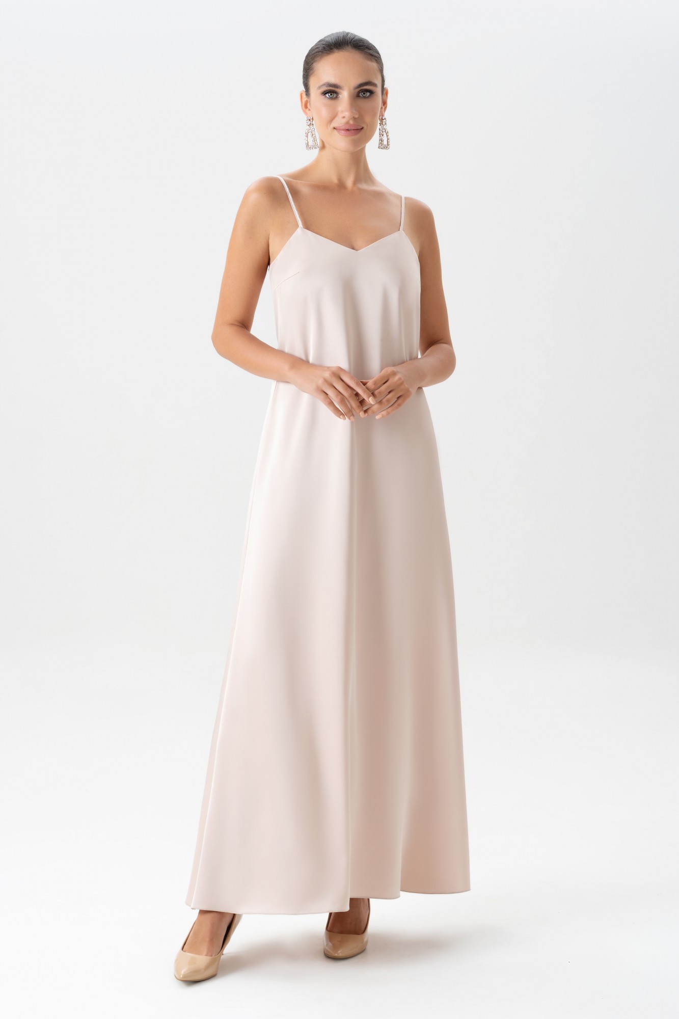 Нарядный женский костюм с платьем от брендов URS — это утончённый праздничный комплект, созданный для тех, кто выбирает изысканность, благородство и проверенную временем классику. Такой вечерний костюм прекрасно вписывается в атмосферу торжества, подчеркивает женственность и обеспечивает комфорт на протяжении всего события. Костюм женский, состоящий из блузона и платья, выполненных из плательной атласной ткани, нарядный. Блузон прямого силуэта, укороченный, с цельнокроеными короткими рукавами, с застежкой по спинке до верха на разъёмную тесьму-молнию с металлическими звеньями. Блузон также можно одевать застежкой на перед. Перед и спинка с цельнокроеным бочком. Рукава цельнокроеные короткие, с притачной нижней частью. Горловина блузона - круглая лодочка, застегивающаяся по спинке на пришивной потайной крючок. Низ переда, спинки и рукавов, горловина, застежка спинки вдоль молнии декорированы отделочной тесьмой из сетки с нашивными бусинами (размер и цвет фурнитуры может незначительно отличаться от фото). Перед, спинка и рукава на подкладке. Платье полуприлегающего силуэта, на бретелях, слегка расклешенное к низу, длинное, на отлетной по низу подкладке. Перед с нагрудными вытачками, выходящими из боковых швов. Верхняя часть переда ˅- образная, углубленная.