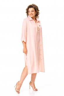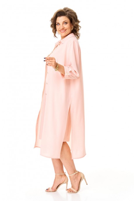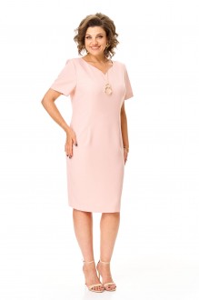 Комплект женский состоит из платья и блузки. Платье женское полуприталенного силуэта с естественной линией плеча. Рукав короткий втачной одношовный. Горловина оригинальной авторской формы. По переду выполнены полурельефы выходящие из пройм. Спинка с вытачками. В среднем шве спинки застежка на потайную тесьму-молнию и шлица. Блуза из шифона прямого свободного покроя с оригинальной текстурой ткани. В боковых швах обработаны разрезы. По переду обработана цельнокроеная планка. Застежка центральная бортовая на петли пуговицы. Спинка с легкой встречной складкой по центру. Воротник блузочный на отрезной стойке. Рукав втачной одношовный 3/4. Низ рукава с манжетой и складками. Манжета с застёжкой на петлю пуговицу. В комплект входит навесной пояс и декоративная подвеска.