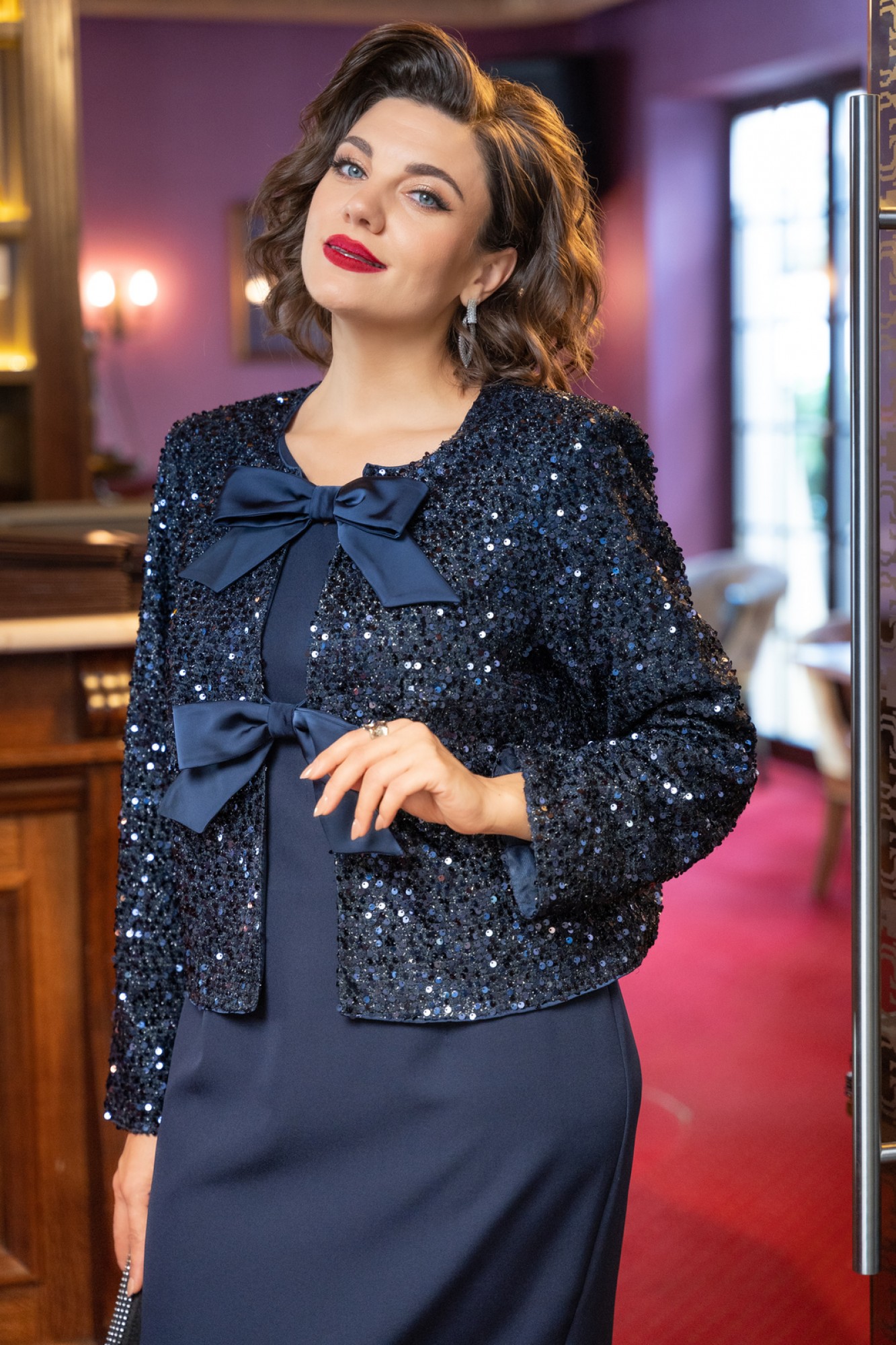 Комплект женский состоит из укороченного жакета из полотна с пайетками и атласного платья. Жакет прямого силуэта свободного покроя с естественной линией плеча на подкладке из атласной ткани. Горловина округлой формы. БАНТЫ СЪЁМНЫЕ! Застежка на съемные декоративные авторские банты с применением потайного крепления на небольшие кнопки, для возможности создания различных образов, как с бантами, так и без них. Платье женское полуприлегающего силуэта с естественной линией плеча. Рукав короткий втачной одношовный. Горловина оригинальной авторской формы. По переду выполнены полурельефы выходящие из пройм. Спинка с вытачками. В среднем шве спинки застежка на потайную тесьму-молнию и шлица.