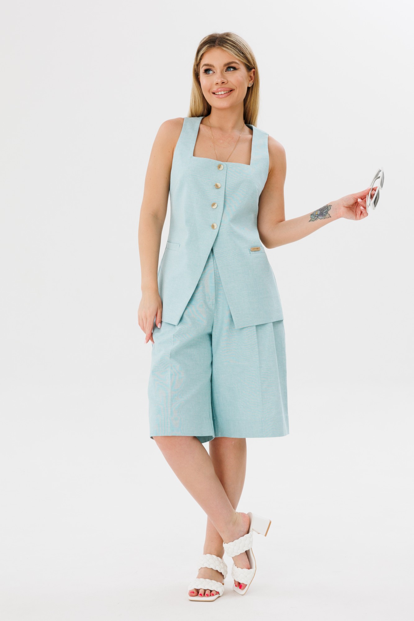 Жилет женский прилегающего силуэта, с вырезом горловины(Каре).Застежка по переду на 4 пуговицы. На передних половинках действующие карманы с листочкой. Перед жилета на подкладке. Шорты-Бермуды женские, свободного силуэта, на поясе со шлевками. Застежка на молнию и пуговицу. По переду заложены складки. По бокам действующие угловые карманы.
