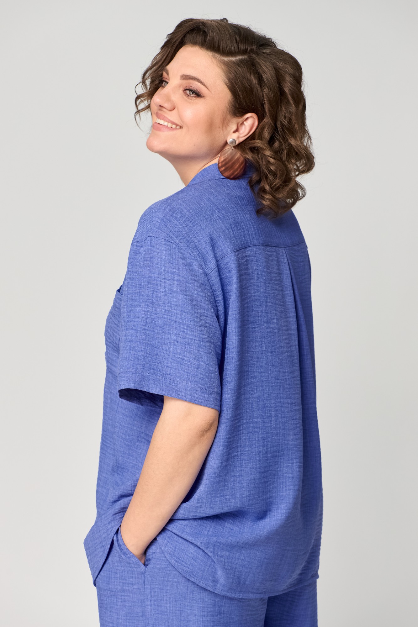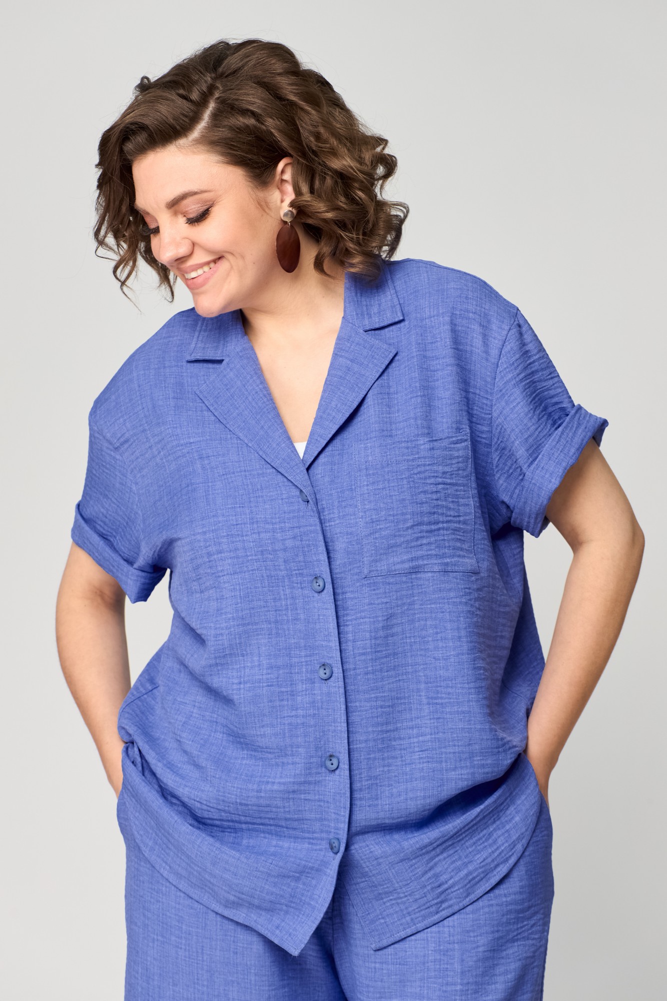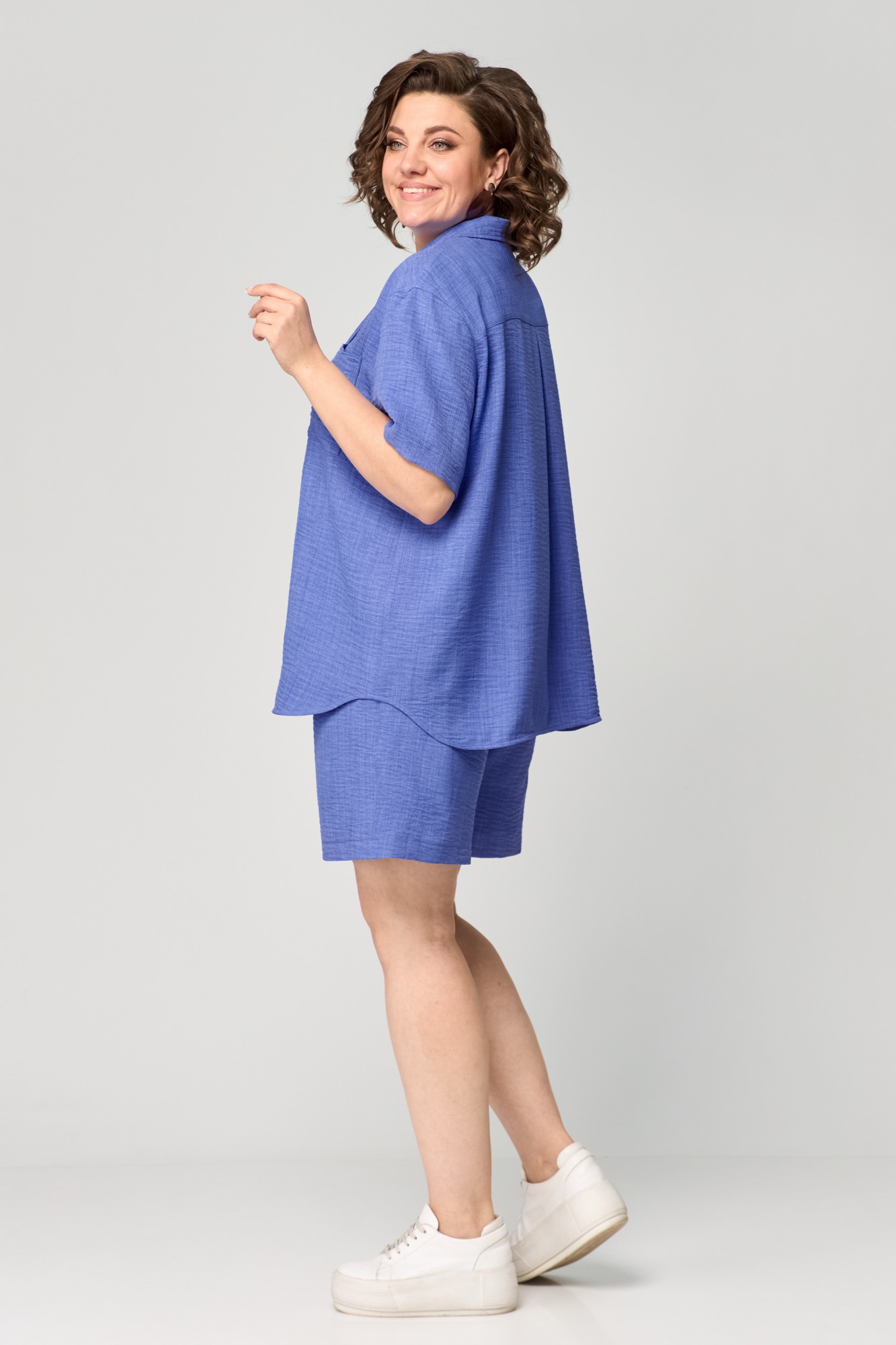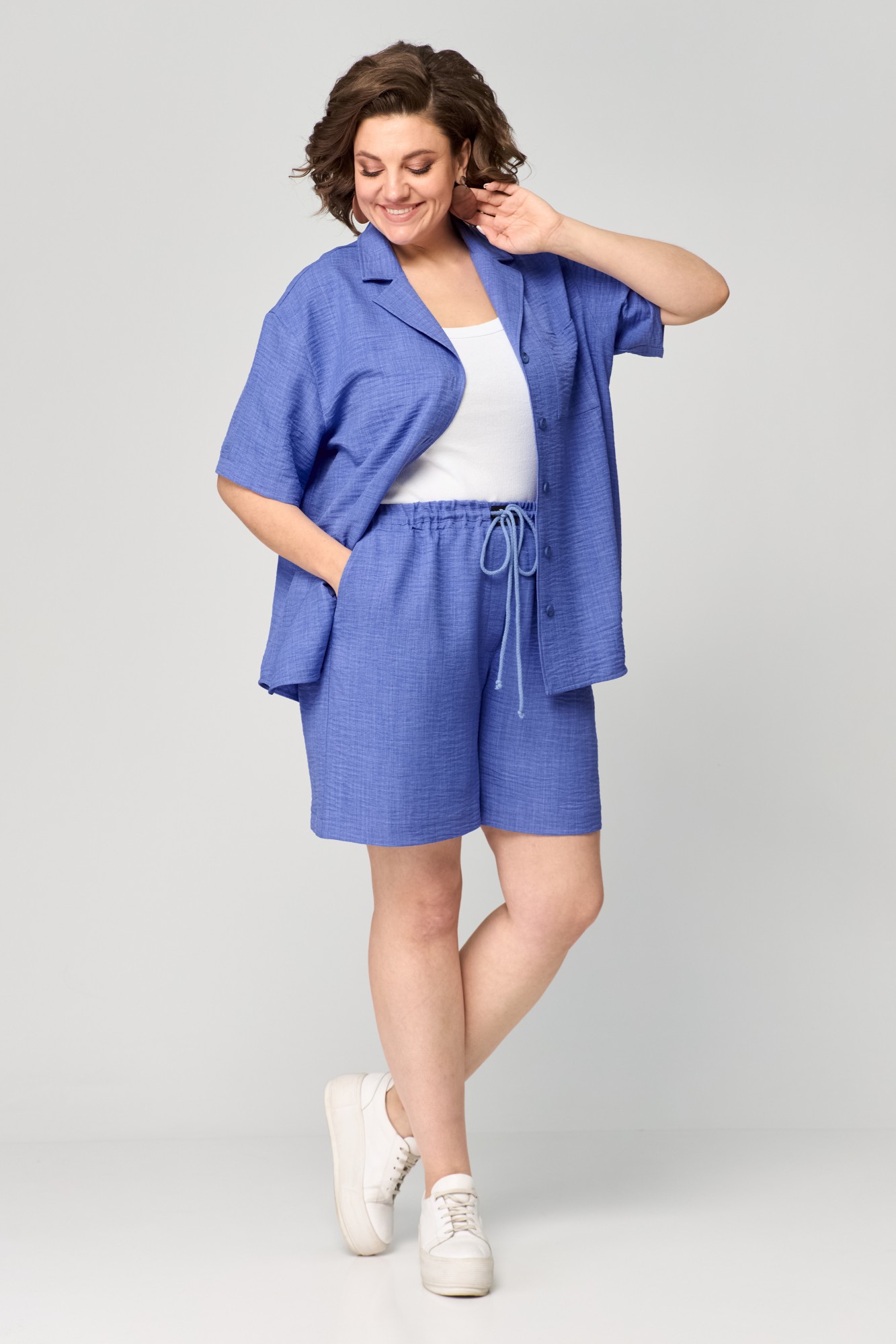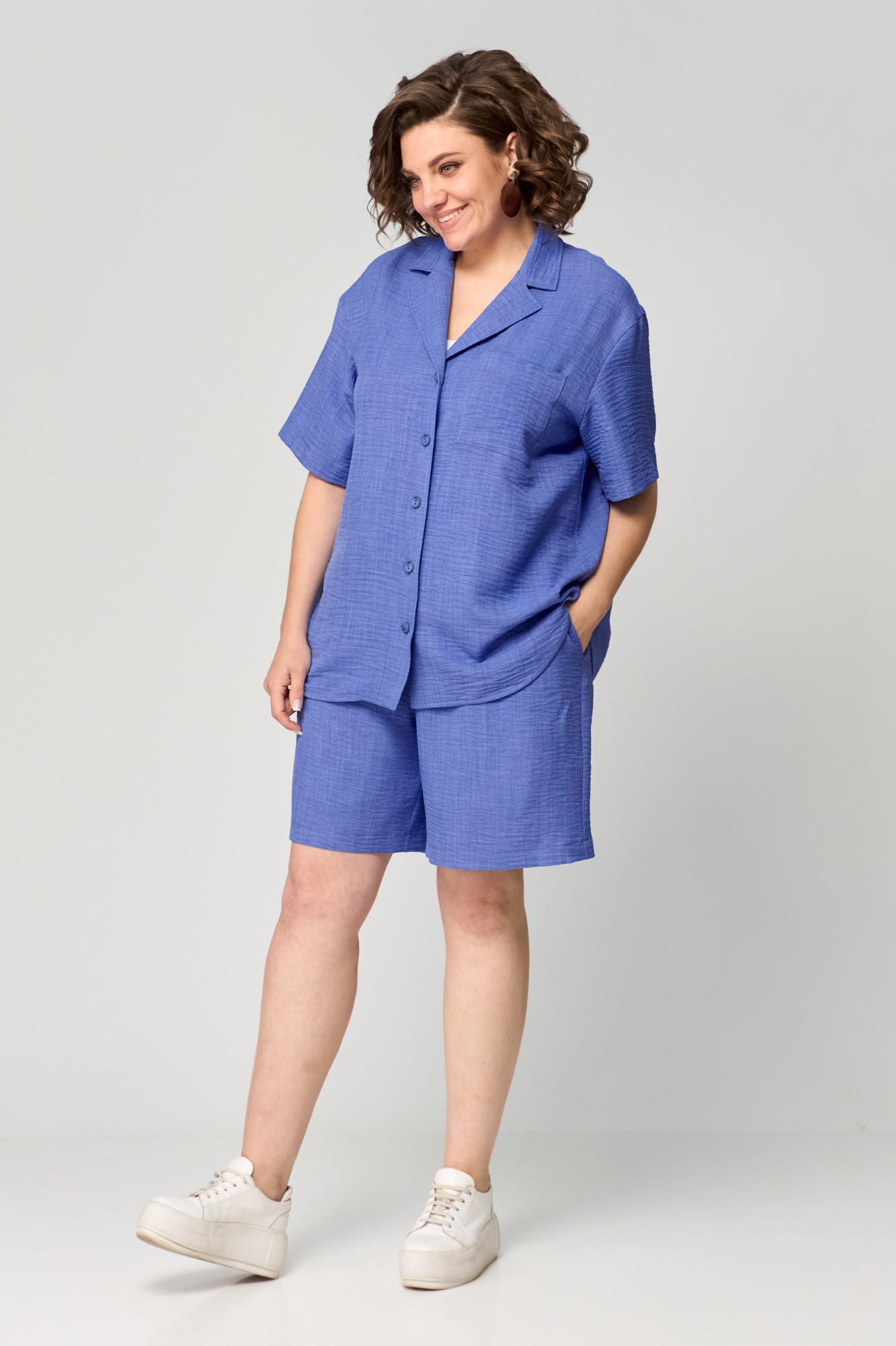 Костюм состоящий из рубашки и шорт, выполнен из однотонной ткани. Рубашка прямого силуэта. Полочка с центральной застежкой на петли и пуговицы. На левой полочке в области груди настрочен карман. Горловина V-образной формы с отложными лацканами и воротником. Спинка с отрезной плечевой кокеткой и встречной складкой. Пройма углубленной формы. Рукав рубашечного типа, одношовный, длиной до локтя. Шорты свободные, длиной выше колена. По передней половинке выполнены наклонные карманы и имитация застежки в среднем шве. По талии шорты на притачном поясе с элементом кулисы и декоративным шнуром по передней части пояса и эластичной тесьмой внутри.