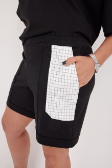 Шорты свободного прилегания, с накладными карманами из трикотажа в клетку. По передней части застрочены стрелки. Отрезная кокетка на задней части брюк делает их посадку идеальной. Верх шорт обработан широким поясом с островком с эластичной резинкой. Нижний край обработан подгибкой с закрытым швом по лицевой части изделия.