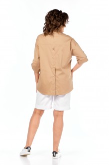 Комплект брючный состоит из блузы и шорт. Блуза прямого кроя с центральной застежкой на петли и пуговицы. Перед с плечевой кокеткой и одним накладным карманом по левой стороне. Спинка с плечевой кокеткой и застежкой от кокетки до низа на петли и пуговицы, нижняя планка с печатью "буквы", по боковым швам обработаны разрезы. Рукав длиной 3/4 со спущенной линией плеча. Длина регулируется хлястиком и пуговицей. Воротник рубашечный со стойкой. Шорты прямые, верхний срез обработан притачным поясом, застежка на тесьму-молнию. На задней половинке накладные карманы, в боковых швах карманы. В качестве отделки используется фурнитура и отделочная строчка.