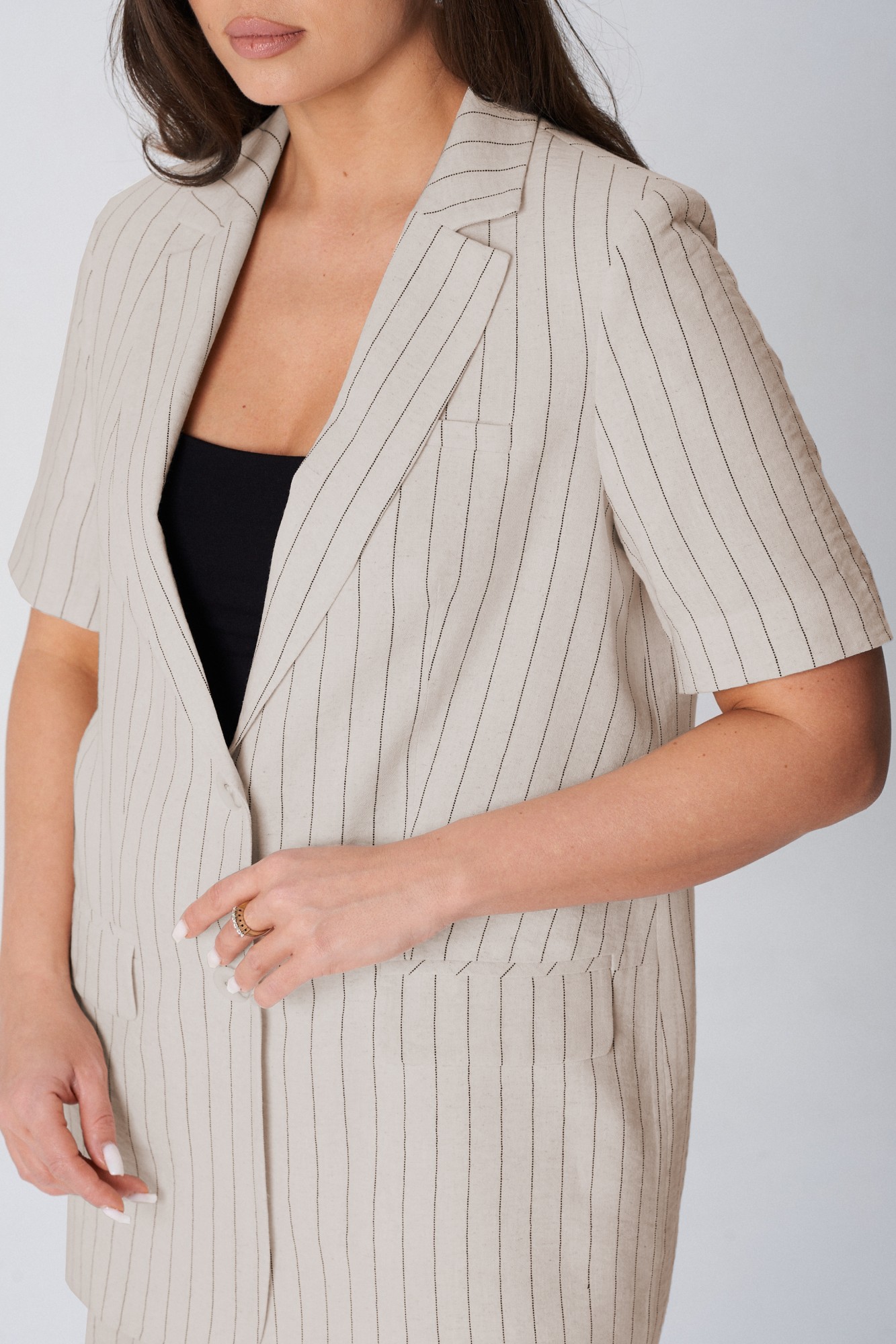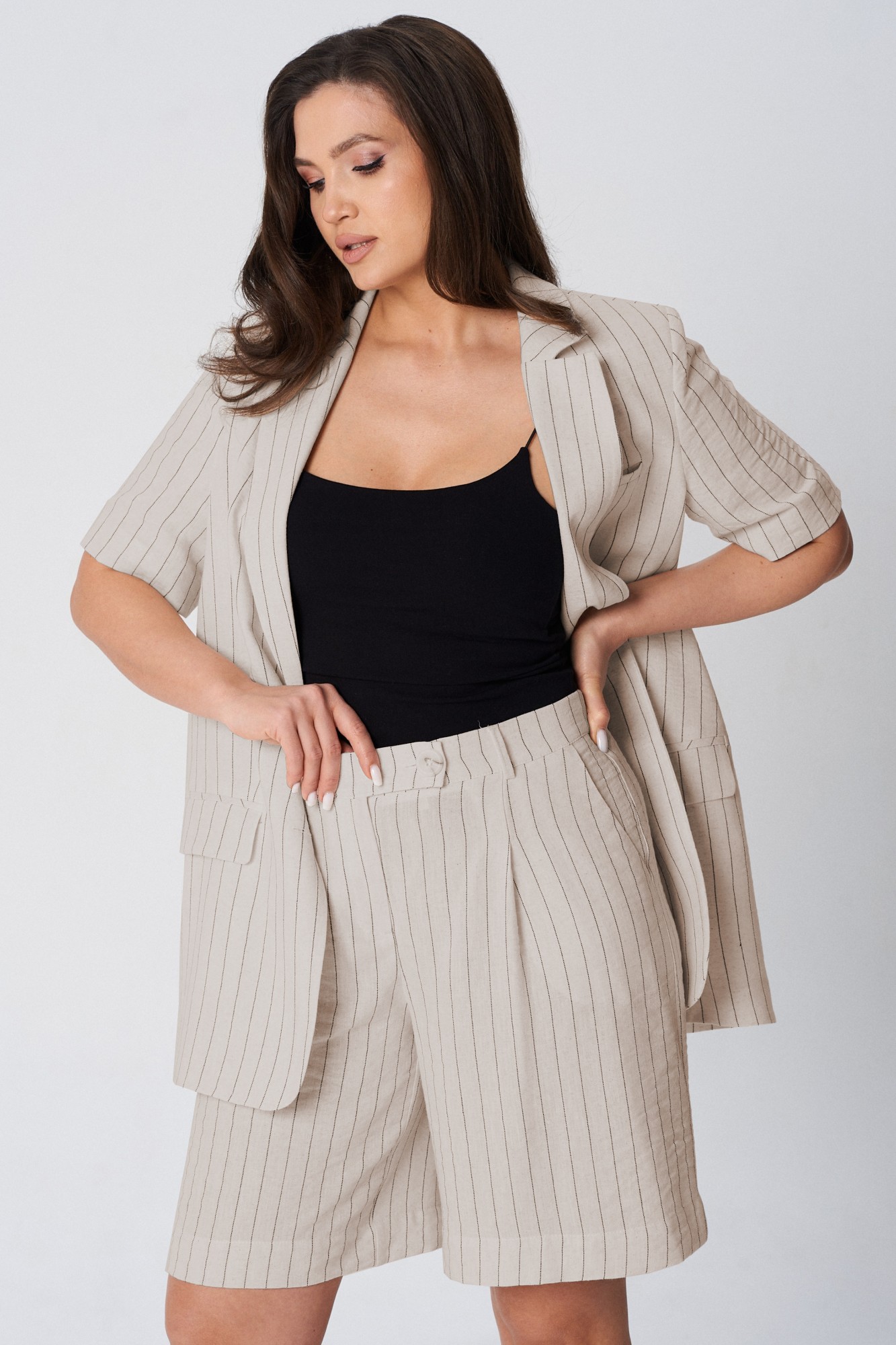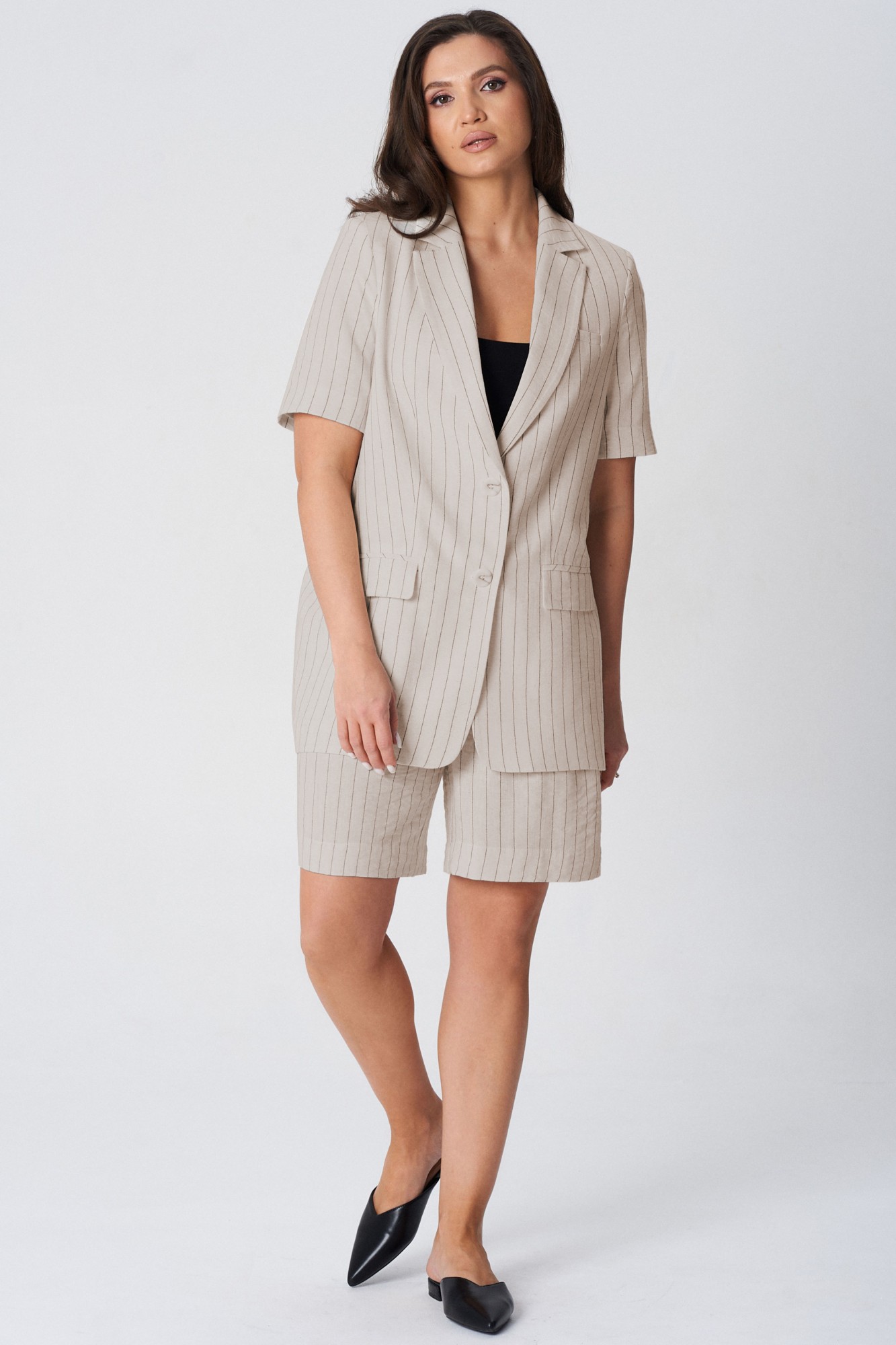 Комплект состоит из жакета и шорт. Жакет на подкладке, полуприлегающего силуэта, втачного покроя. Рукав одношовный, короткий. Воротник пиджачного типа. Застежка центрально-бортовая на 2 петли и пуговицы. Край борта закруглен. В подрезе переда - карман в рамку с клапаном. Шорты прямые на притачном поясе застегивающиеся на петлю и пуговицу. По переду расположены функциональные боковые карманы-хулиганы и односторонние складки. Застежка на тесьму-молнию. По поясу спинки вставлена резинка. В комплект входит пояс из основной ткани.