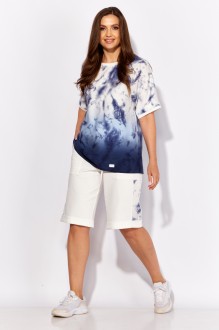 Комплект женский, 2х предметный, состоящий из блузки и удлиненных шорт. Блузка выполнена из купонной текстильной ткани, прямого силуэта с коротким рукавом. Рукав со спущенной линией плеча, по низу с трикотажной бейкой и отлетной складкой. Горловина круглой формы с подрезной , трикотажной бейкой. По низу блузки отделочная нашивка. Спинка без особенностей. Шорты удлиненные, по низу с отложной манжетой., из трикотажного полотна(дрес 2х нитка) Карманы накладные. Пояс притачной с резинкой по кругу и кулисой.