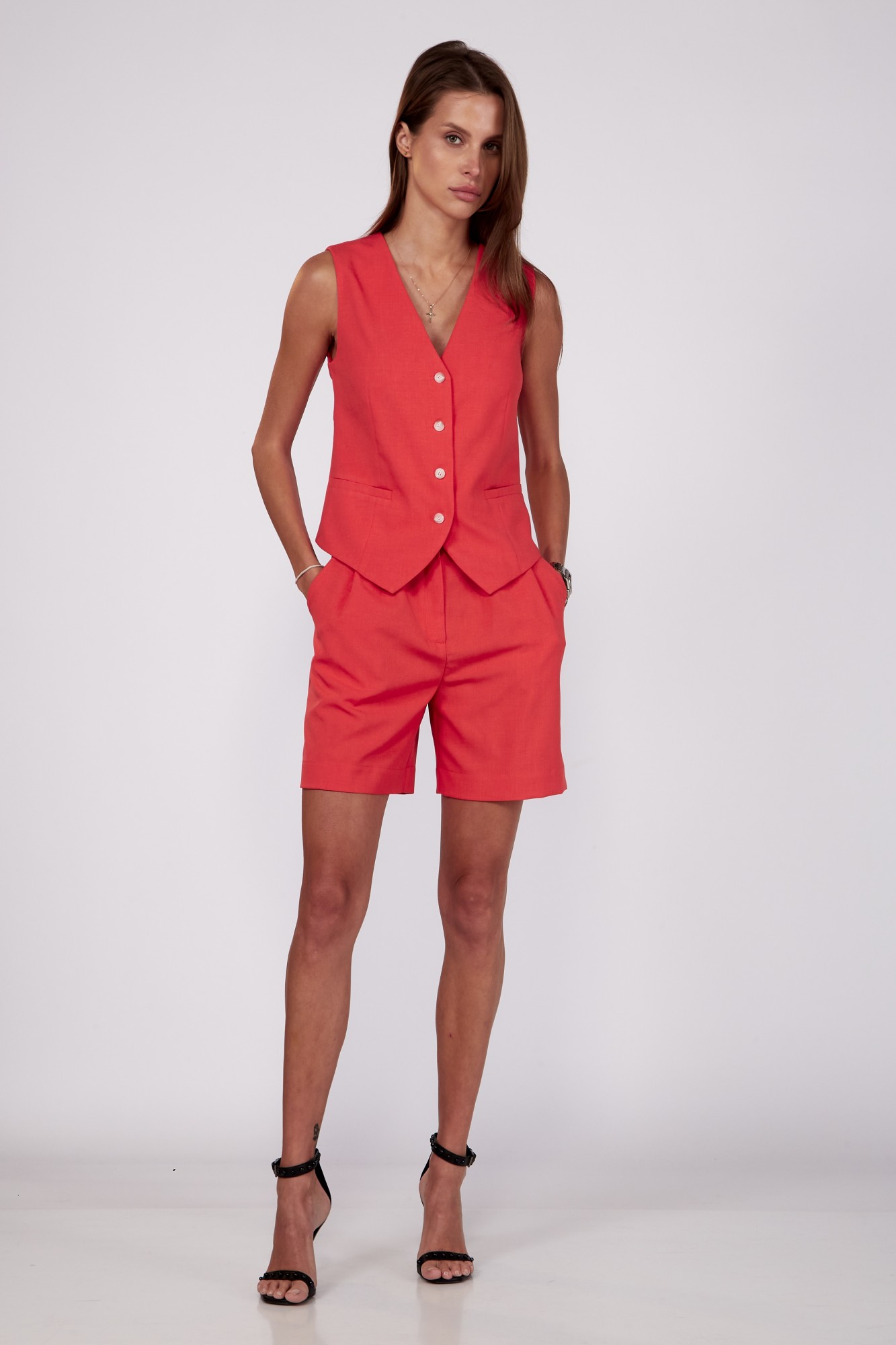 Коплект женский двухпредметный, состоящий изжилета и шорт. Жилет приталенного силуэта с застежками по переду на петли-пуговицы. По переду талиевые выточки, карманы прорезные в рамку, вырез V-образный, спинка разрезная по центру с двумя талиевыми выточками. Жилет на подкладке. .Шорты без подкладки, притачной пояс со шлевками, застежка на петлю-пуговицу, По переду защипы, высокая посадка,карманы боковые. Выполнены из ткани лен-вишр.