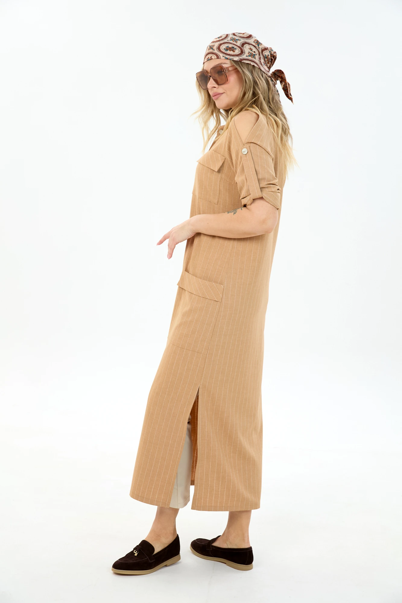 платье - 35% вискоза, 65% полиэстер, брюки -97 % хлопок, 3% эластан