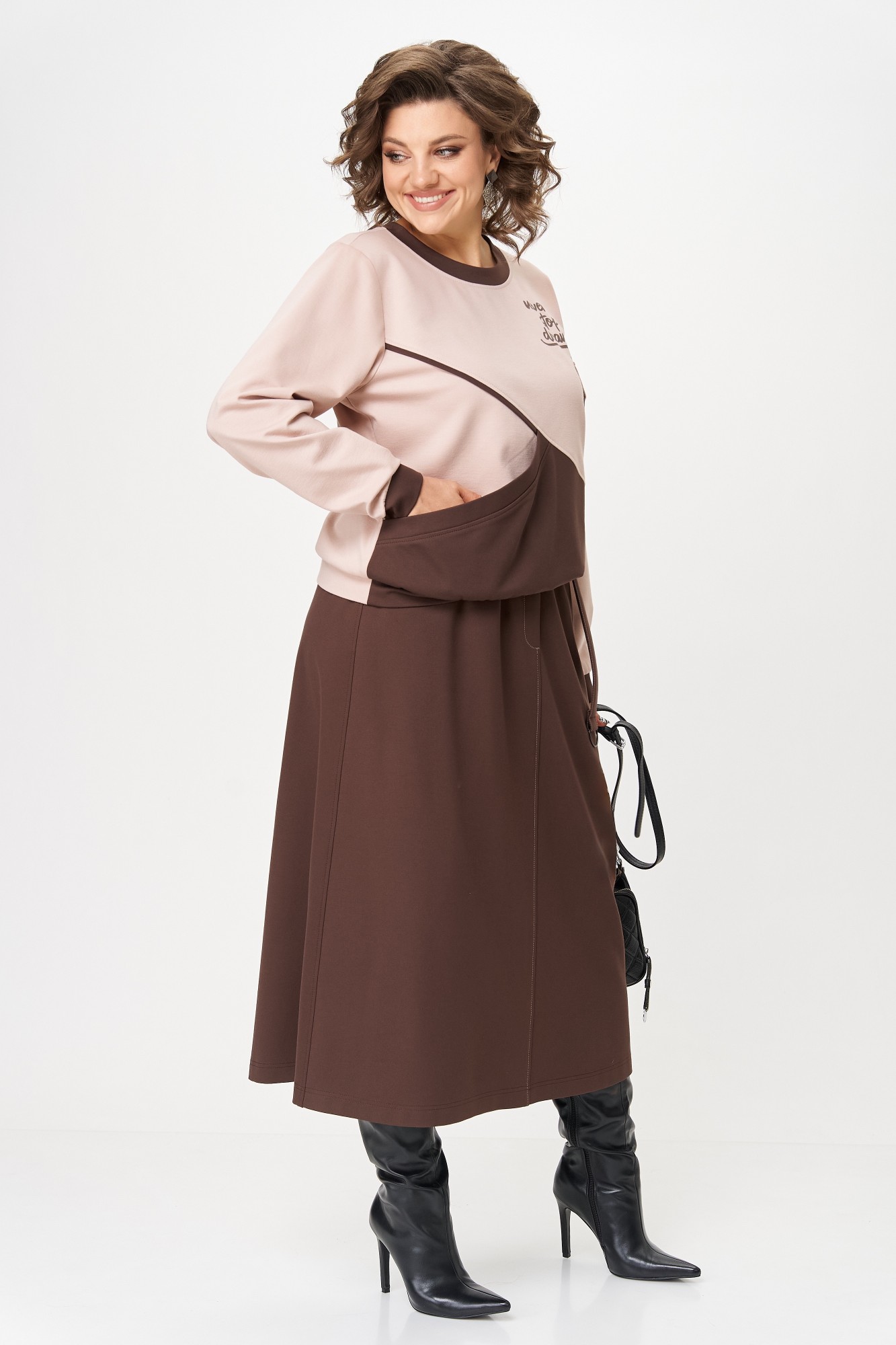 Трикотажный юбочный костюм. Этот костюм сочетает в себе элегантность и практичность. Джемпер оверсайз выглядит современно благодаря декоративным элементам в виде печати с полукольцом и сочетания двух цветов. Его свободный крой гармонично смотрится на девушках любого возраста, подчеркивая изящество. Линия плеча спущена, рукав втачной на манжете. Юбка А-образного силуэта с контрастной отстрочкой, на резинке по верху для максимально комфортной посадки. В близи боковых швов карманы.