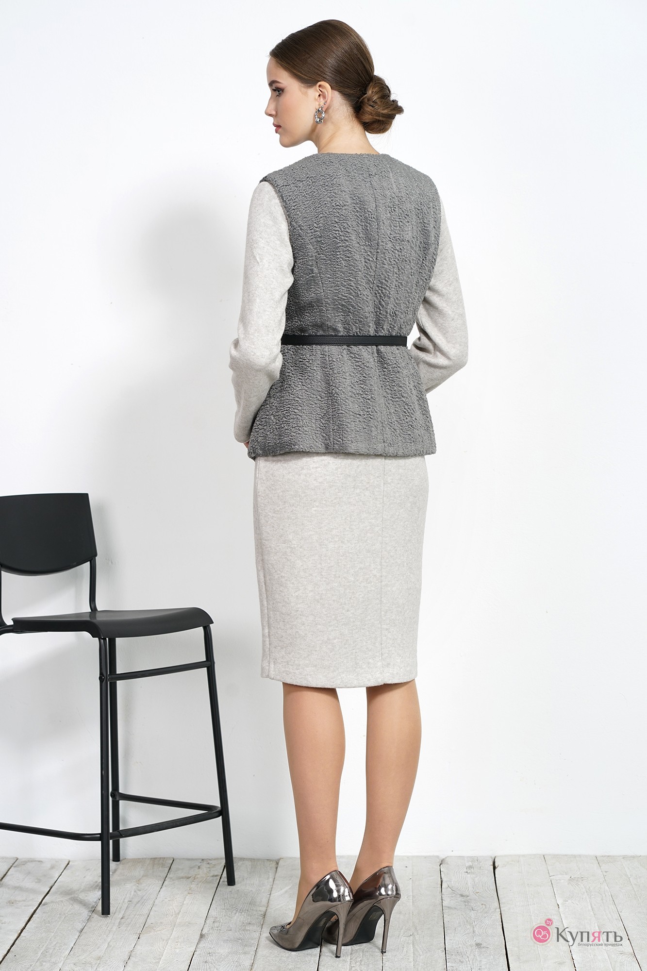 Жилет полуприлегающего силуэта на подкладке с отложными лацканами, с центральной застежкой на одну потайную пришивную кнопку. Перед с рельефными швами, в которых карманы. Спинка со средним швом и талиевыми вытачками. Жилет в комплекте с ремнем.