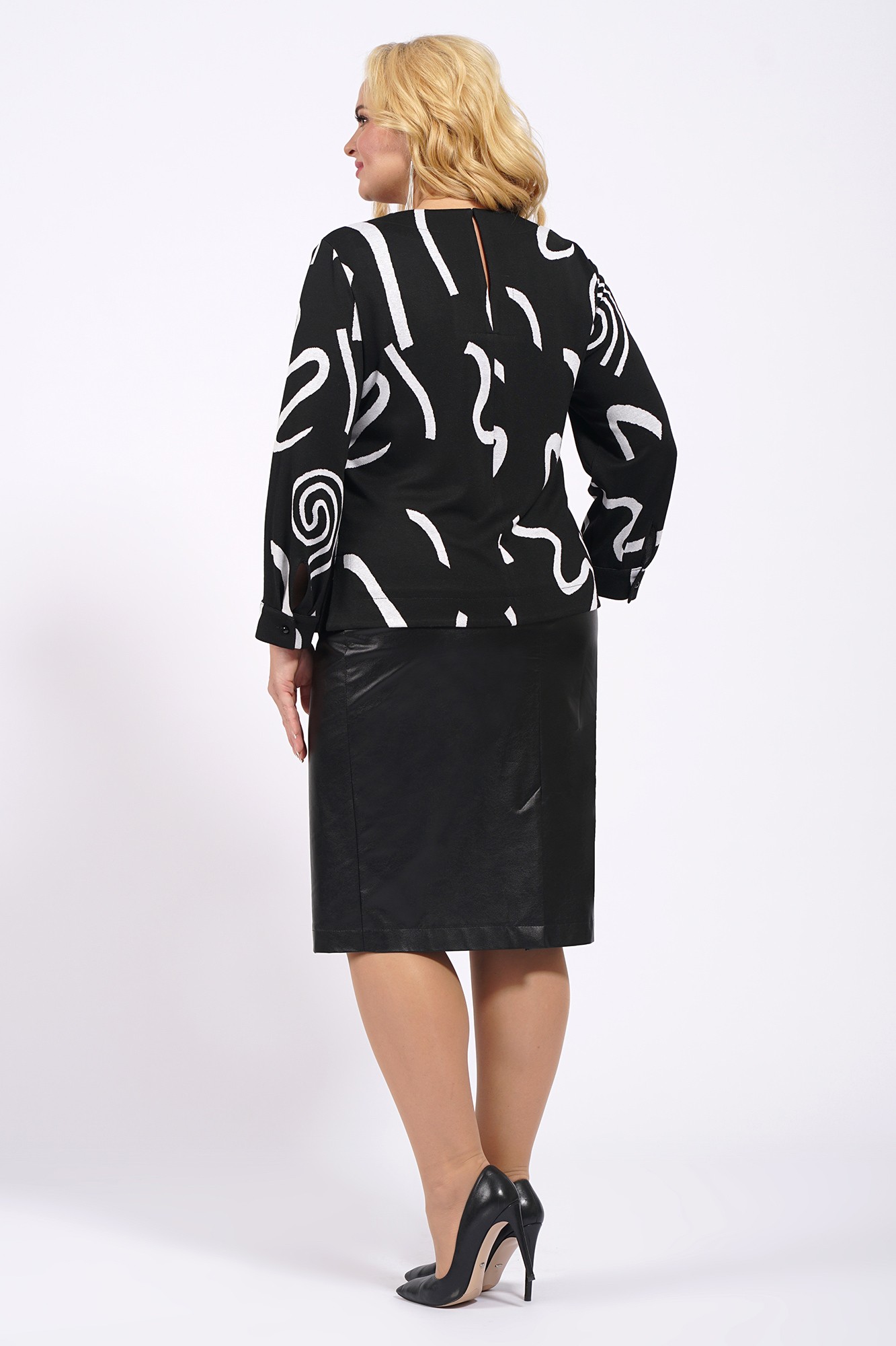 блуза: трикотаж пэ 60%, вискоза 36%, эластан 4%, юбка: экокожа пэ 16%, вискоза 84%, покрытие пэ 100% +подкладка пэ 100%