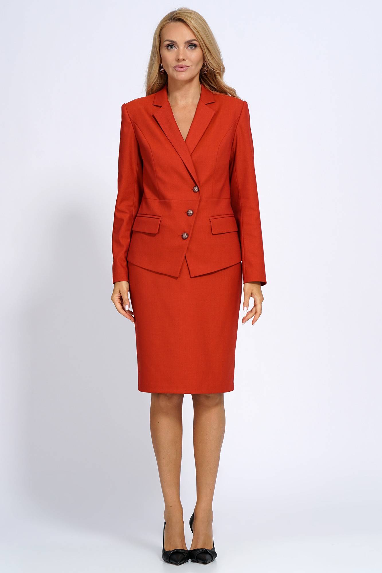 Комплект женский 2-х предметный состоящий из жакета и юбки. Жакет полуприлегающего силуэта, с двух-бортной застёжкой на петли, пуговицы и с внутренней застёжкой на петлю пуговицу. Перед с отложными лацканами, отрезной по линии талии, верху с рельефными швами, прорезными карманами с клапаном и двумя обтачками. Спинка со средним швом и рельефными швами. Рукава втачные, двухшовные, длинные.