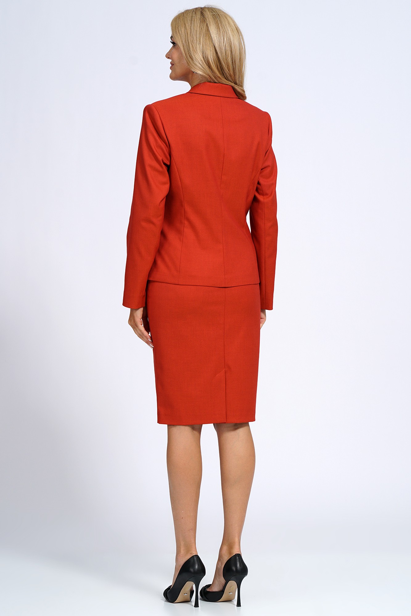 Воротник пиджачного типа. Юбка полуприлегающего силуэта книзу чуть заужена, на подкладке, на притачном поясе (Р52 по боковым на резинке), с застёжкой на потайную молнию в среднем шве заднего полотнища и по краю пояса на петлю и пуговицу. Переднее полотнище с талевыми выточками. Заднее полотнище с талевыми выточками и средним швом заканчивающийся шлицей.