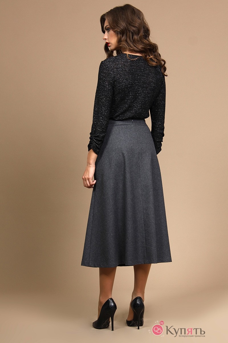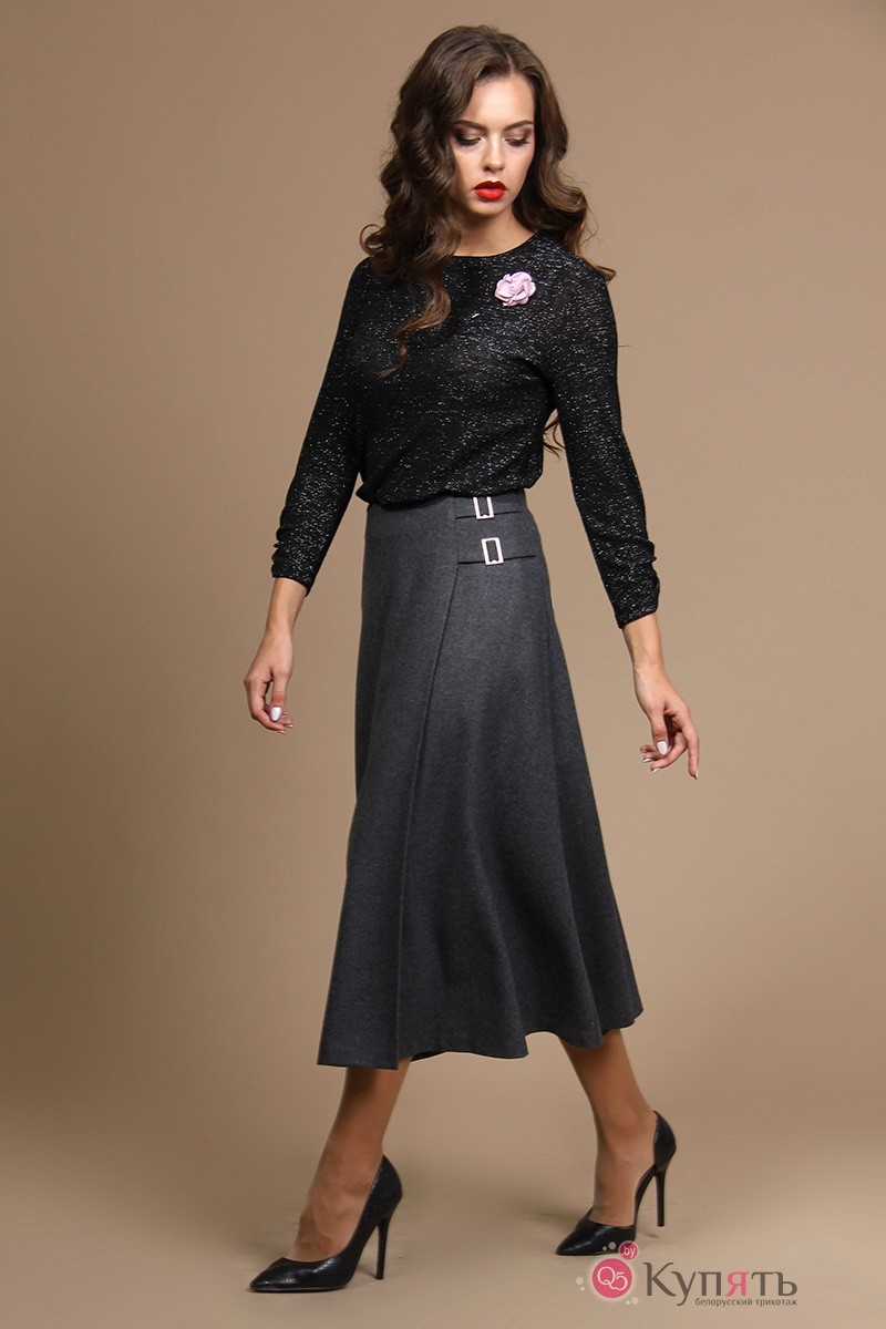 Комплект юбочный: блуза, юбка. Блуза из тоненького трикотажного полотна с добавлением нити люрекса. Блуза прямого силуэта с втачными рукавами. По горловине притачная бейка. Рукава длиной ¾, одношовные, по центру от низа сборка. Украшает съемный декор. Длина блузы по среднему шву спинки - р46-57, р48-58, р50-59 Длина рукава блузы – р46-47, р48-47,5, р50-48 Ширина рукава блузы на уровне глубины проймы ½ - р46-15,8, р48-16,5, р50-17,2 Ширина плеча во всех р-ах – 9,8 Обхват блузы по груди – р46-89, р48-93, р50-97 Обхват блузы по талии – р46-80, р48-84, р50-88 Обхват блузы по бедрам – р46-97, р48-101, р105 Юбка из тоненького шерстяного полотна без подкладки. Юбка расширенного силуэта, полу солнце, на обтачке. Переднее полотнище с односторонней складкой. В верху по левой стороне вставлены две шлевки, через которые продеты две пряжки. Заднее полотнище со средним швом, в который вставлена застежка-молния. Длина юбки от талии по среднему шву заднего полотнища во всех р-ах – 81 Обхват юбки по талии – р46-76, р48-80, р50-84 Обхват юбки по бедрам – р46-116, р48-120, р50-124