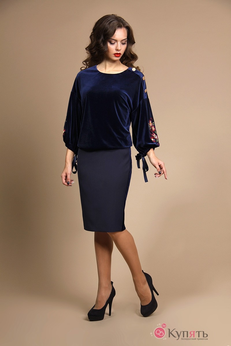 Комплект юбочный: блуза, юбка. Блуза прямого силуэта со спущенной линией плеча и углубленной проймой, с втачными рукавами и застежкой в среднем шве спинки на одну навесную петлю и пуговицу. По низу с эластичной тесьмой, вложенной в запас шва, образуя напуск. Вдоль левого плечевого шва настрочена планка с тремя пришивными пуговицами. Рукава по низу расширенные, собирающиеся на отделочную тесьму, завязывающуюся на бант. Украшена блуза вышивкой по центру рукава. Длина по среднему шву спинки во всех р-ах -58. Длина рукава во всех р-ах -32. Ширина рукава на уровне глубины проймы 1\2 – р46-23, р48-23,7, р50-24,5, р52-25, р54-25,5, р56-26 Ширина плеча – р46-21,5, р48-21,7, р50-22, р52-22,5, р54-22,7, р56-23 ОГ блузы – р46-110, р48-114, р50-118, р52-120, р54-124, р56-128 ОТ блузы – р46-102, р48-106, р50-110, р52-112, р54-116, р56-120 Ширина по линии низа – р46-102, р48-106, р50-110, р52-112, р54-116, р56-120 Юбка слегка зауженная к низу, на притачном поясе с застежкой на тесьму-молнию и пуговицу в среднем шве заднего полотнища. В р52-56 с резинкой по боковым швам. Переднее полотнище с талиевыми вытачками и боковыми частями из велюра. Заднее полотнище со средним швом, заканчивающимся шлицей и вытачками. Юбка на отлетной подкладке. Длина юбки от талии по среднему шву заднего полотнища – р46,48-61, р50,52-63, р54,56-64 ОТ юбки – р46-76, р48-80, р50-84, р52-92, р54-96, р56-100 ОБ юбки – р46-102, р48-106, р50-110, р52-112, р54-116, р56-120