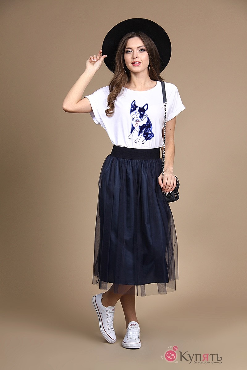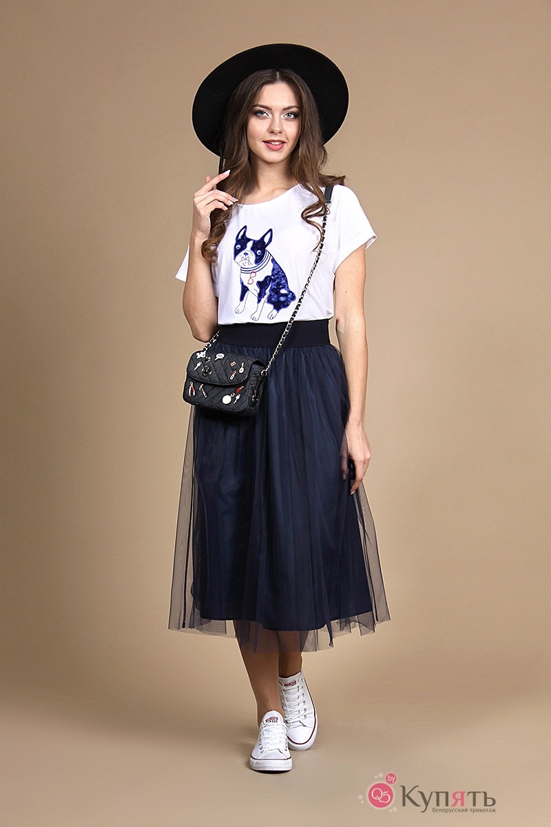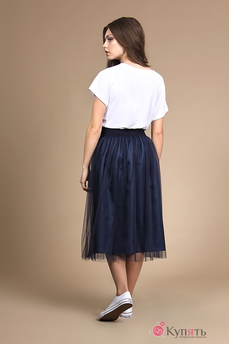 Комплект юбочный: блуза, юбка. Блуза со спущенной линией плеча, с цельнокроеными рукавами. По низу рукавов притачные манжеты. По горловине притачная бейка. Блуза декорирована аппликацией. Юбка расширенного силуэта, двухслойная. По верхнему срезу – сборка и эластичная тесьма. Верхняя часть – сетка. Нижняя – подкладочная ткань.