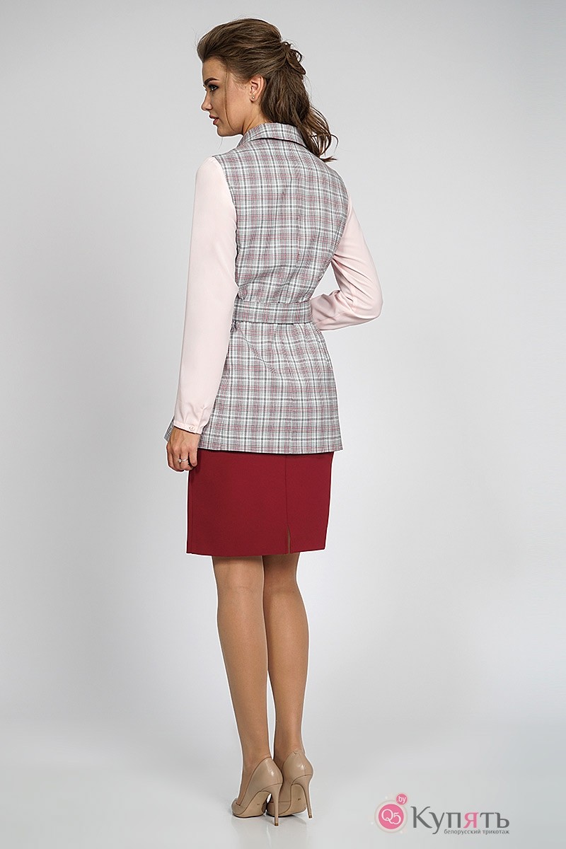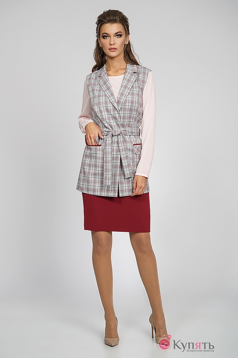 Комплект юбочный 3-ка. Жилет с небольшим запахом, зафиксированным завязывающимся поясом по линии талии и двумя пришивными кнопками. Воротник на отрезной стойке и на лацкане. По линии бедер – клапаны с рельефами с небольшими открытыми шлицами. Спинка со средним швом и талиевыми вытачками. Жилет на подкладке. Блуза выполнена из шифона, полуприлегающего силуэта, с застежкой на навесную петлю и пуговицу по горловине по спинке. Перед с нагрудными вытачками. Спинка со средним швом. Рукава втачные, одношовные, по низу с небольшим разрезом и застежкой на одну пробивную петлю и пуговицу. Юбка полуприлегающего силуэта на притачном поясе. Переднее полотнище с талиевыми вытачками. Заднее полотнище с талиевыми вытачками и со средним швом, переходящим в шлицу. В средний шов вставлена тесьма-молния. Юбка на подкладке.