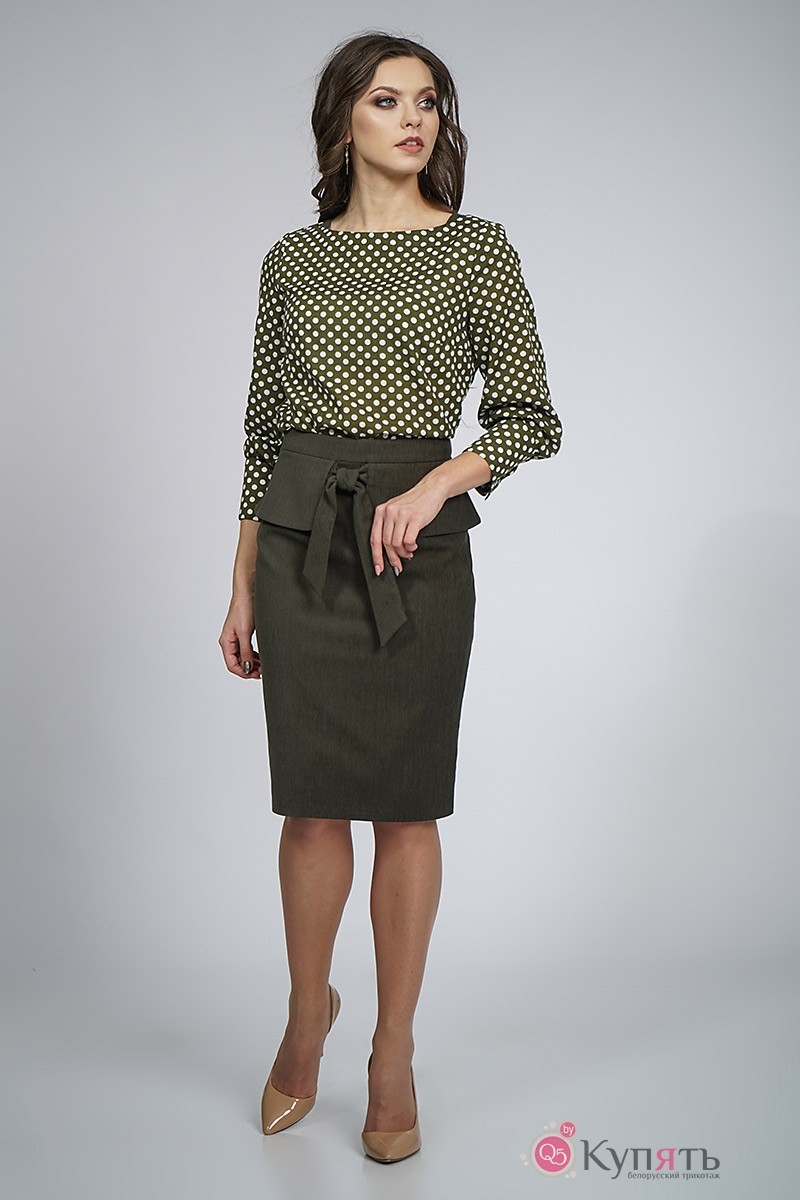 Комплект юбочный 2-ка. Блуза полуприлегающего силуэта с втачными рукавами и фигурной линией низа. Перед с нагрудными вытачками. Спинка со средним швом. Горловинка с вырезом «лодочка» и плечевыми вставками из штрукса. Рукава длиной ¾ с притачными манжетами, застегивающимися на три пробивные петли и пуговицы. Юбка чуть зауженная, на широком притачном поясе с застежкой на потайную тесьму-молнию в среднем шве заднего полотнища. Юбка на подкладке.