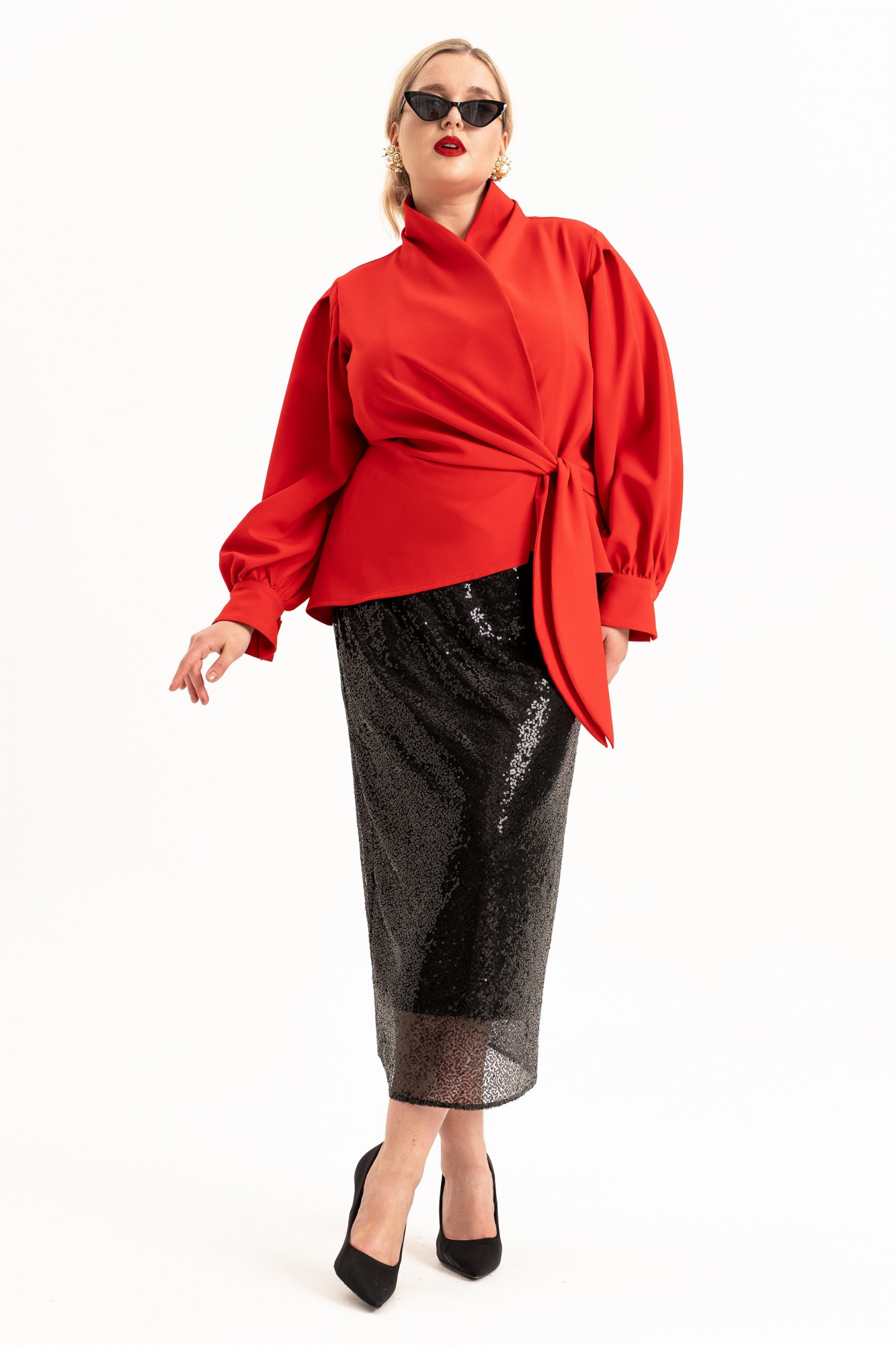 Элегантный женский костюм из ткани «марчано»  и паеток на трикотажной подкладке стильный и универсальный наряд для различных мероприятий. Данный женский костюм состоит из нарядной блузы  и роскошной юбки с пайетками, что делает его идеальным решением для безупречного образа. На юбке обработана потайная молния в боковом шве, пояс на резинке.  Блуза с отрезной баской  и воротником стойкой переходящей в борта. Застежка на потайную петлю и пуговицу и на завязки. Рукав длинный, втачной на манжете. По окату рукава обработаны складки. Благодаря универсальному дизайну, костюм можно успешно сочетать с различными элементами гардероба, создавая разнообразные стили от официального до повседневного. Стильный, роскошный, изысканный, комплект идеально подойдет для различных мероприятий. Отражает роскошь, придает элегантность и изысканность. Будет великолепно смотреться на любой фигуре и привлечет к вам внимание окружающих. Этот комплект идеальный выбор для тех, кто хочет выглядеть стильно и привлекательно на вечеринке или романтическом свидании. Сочетайте с красивыми аксессуарами и обувью на каблуке для завершения образа! Доступен в различных размерах, в том числе и для женщин пышных форм, этот костюм позволит каждой леди подобрать идеальный вариант. Красный цвет блузы и роскошная юбка из паеток подчеркнут вашу индивидуальность и хороший вкус.